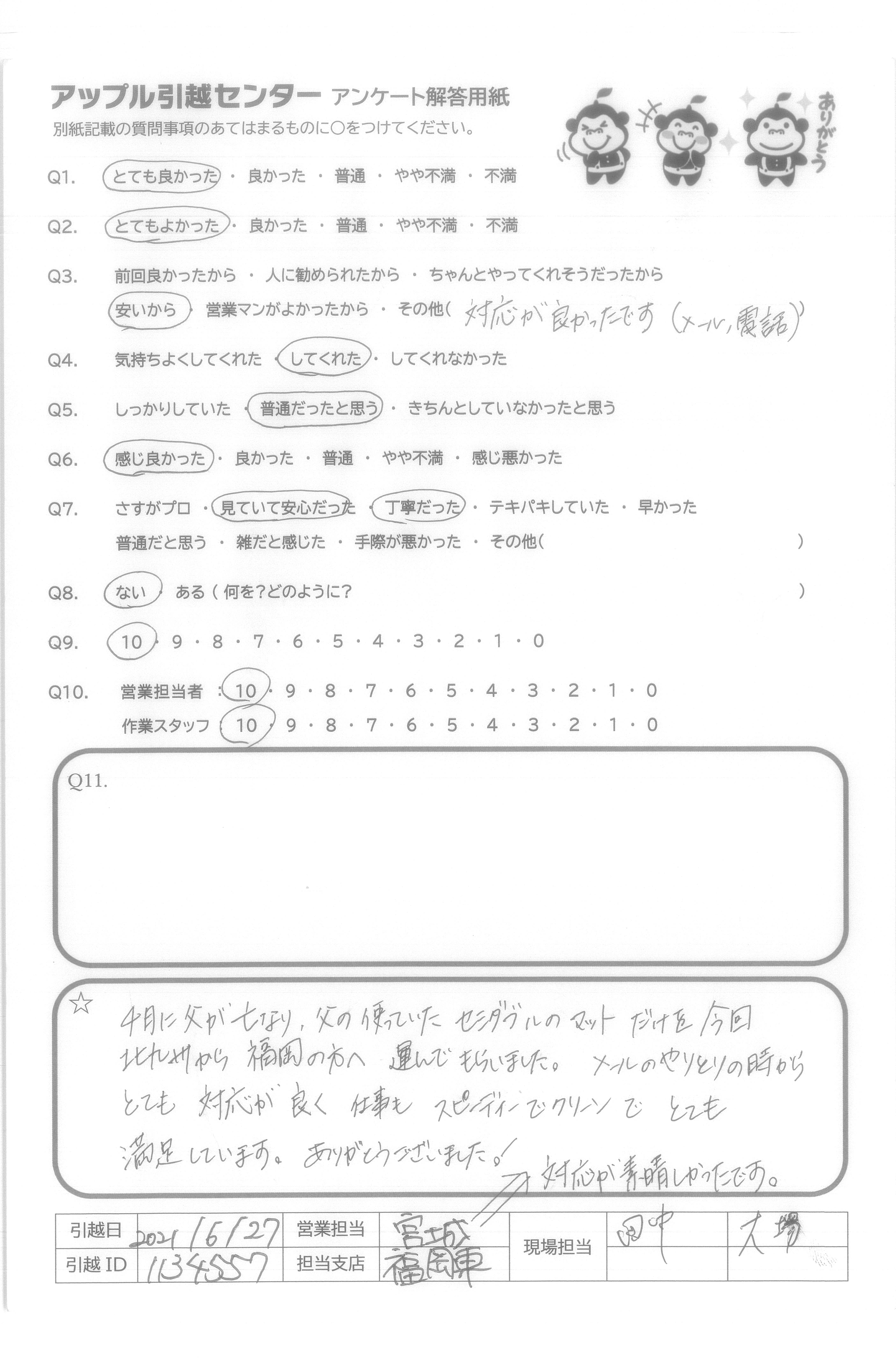 A.4月に父が亡なり、父の使っていたセミダブルのマットだけを今回北九州から福岡の方へ運んでもらいました。メールのやりとりの時からとても対応が良く仕事もスピーディーでクリーンでとても満足しています。ありがとうございました!対応が素晴らしかったです。