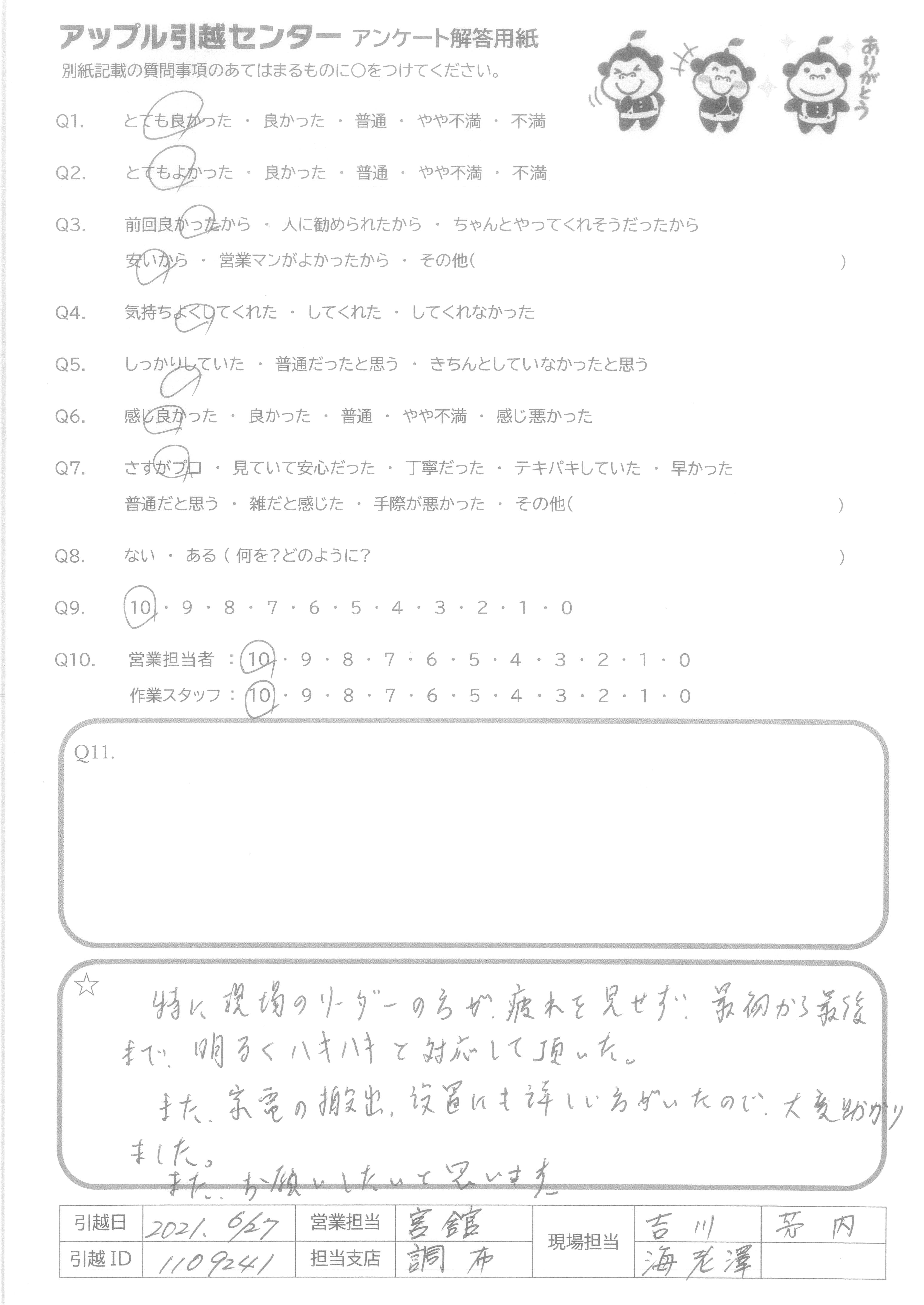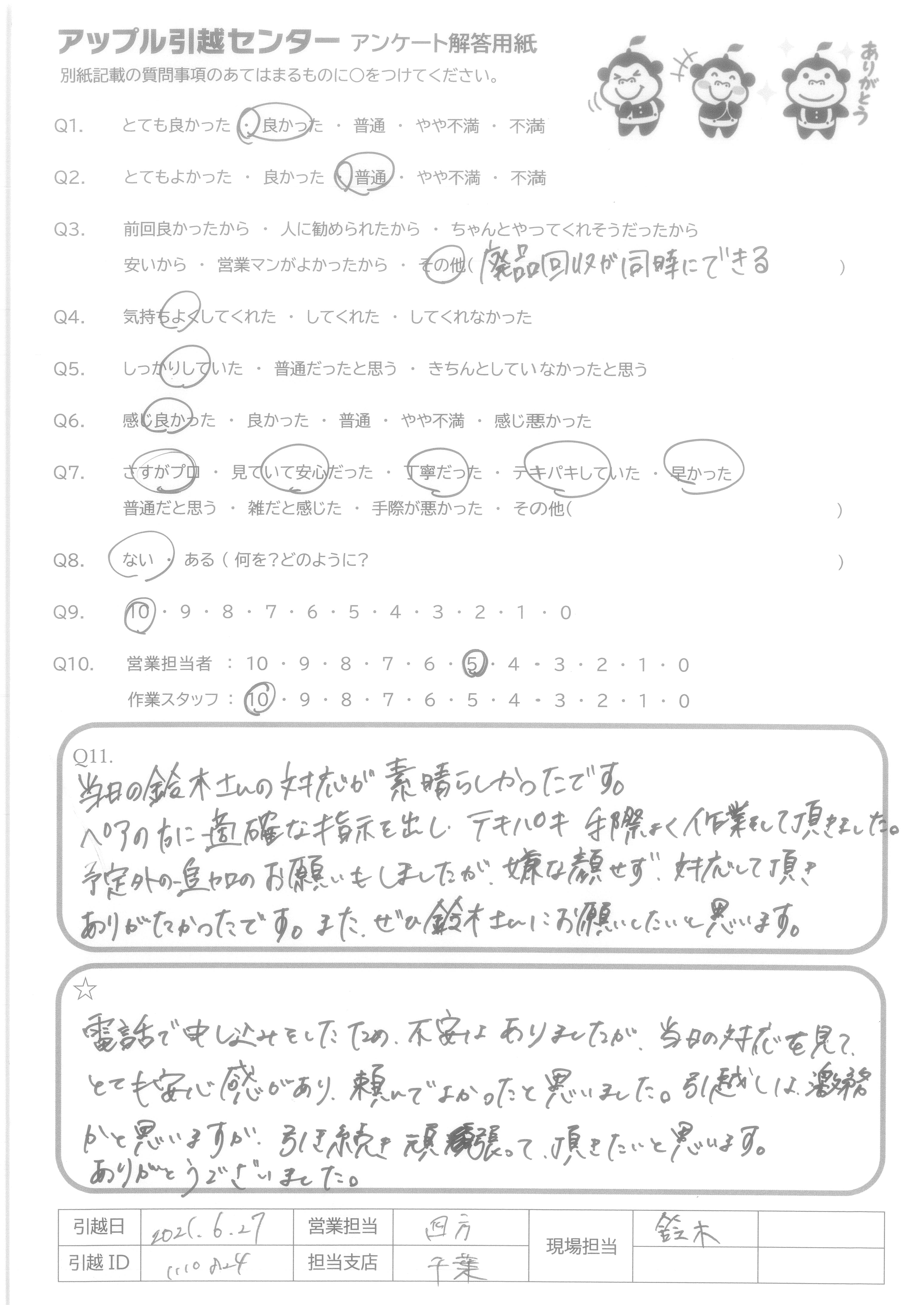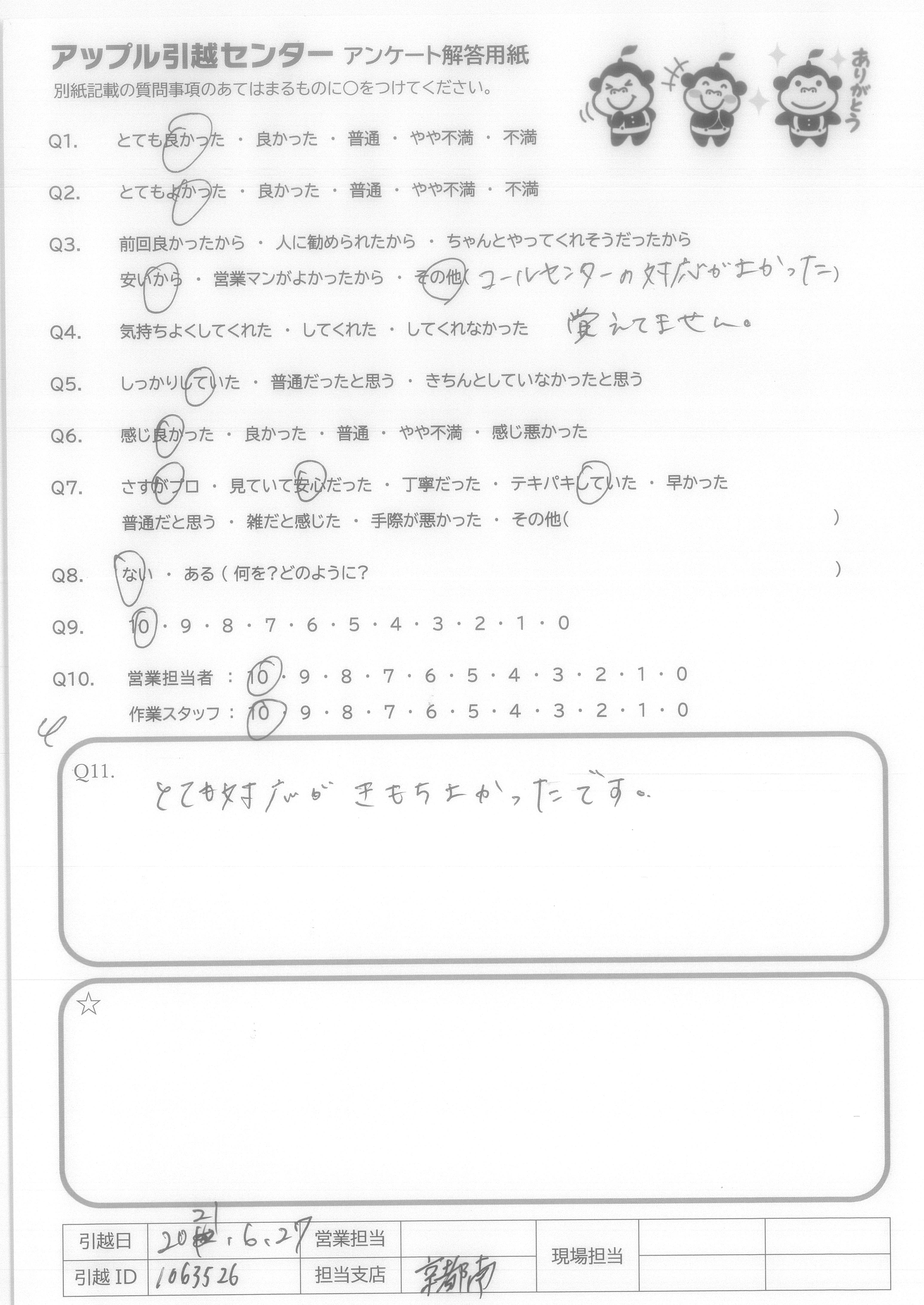 A.電話で申し込みをしたため、不安はありましたが、当日の対応を見てとても安心感があり、頼んでよかったと思いました。引越しは激務かと思いますが、引き続き頑張って頂きたいと思います。ありがとうございました。