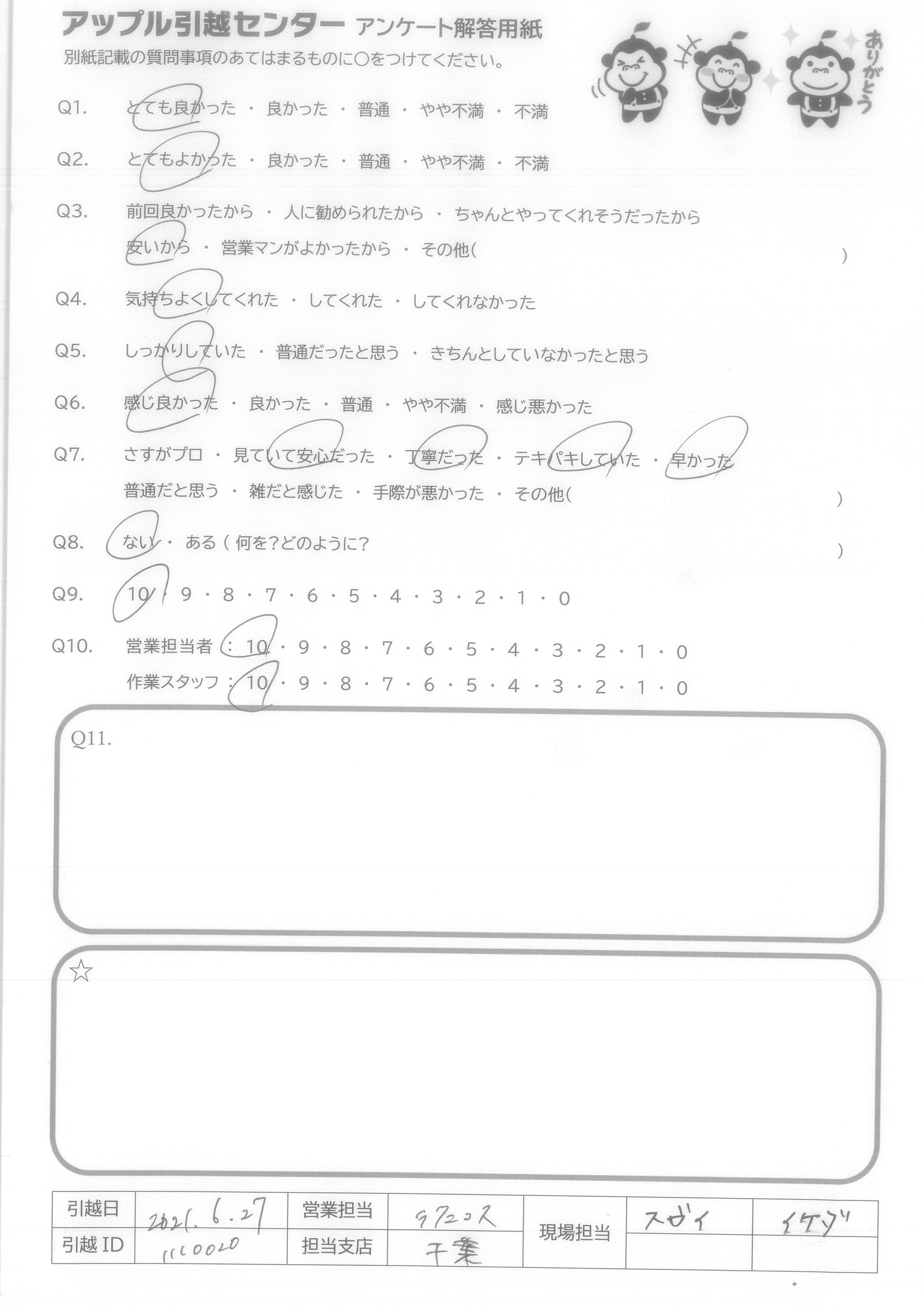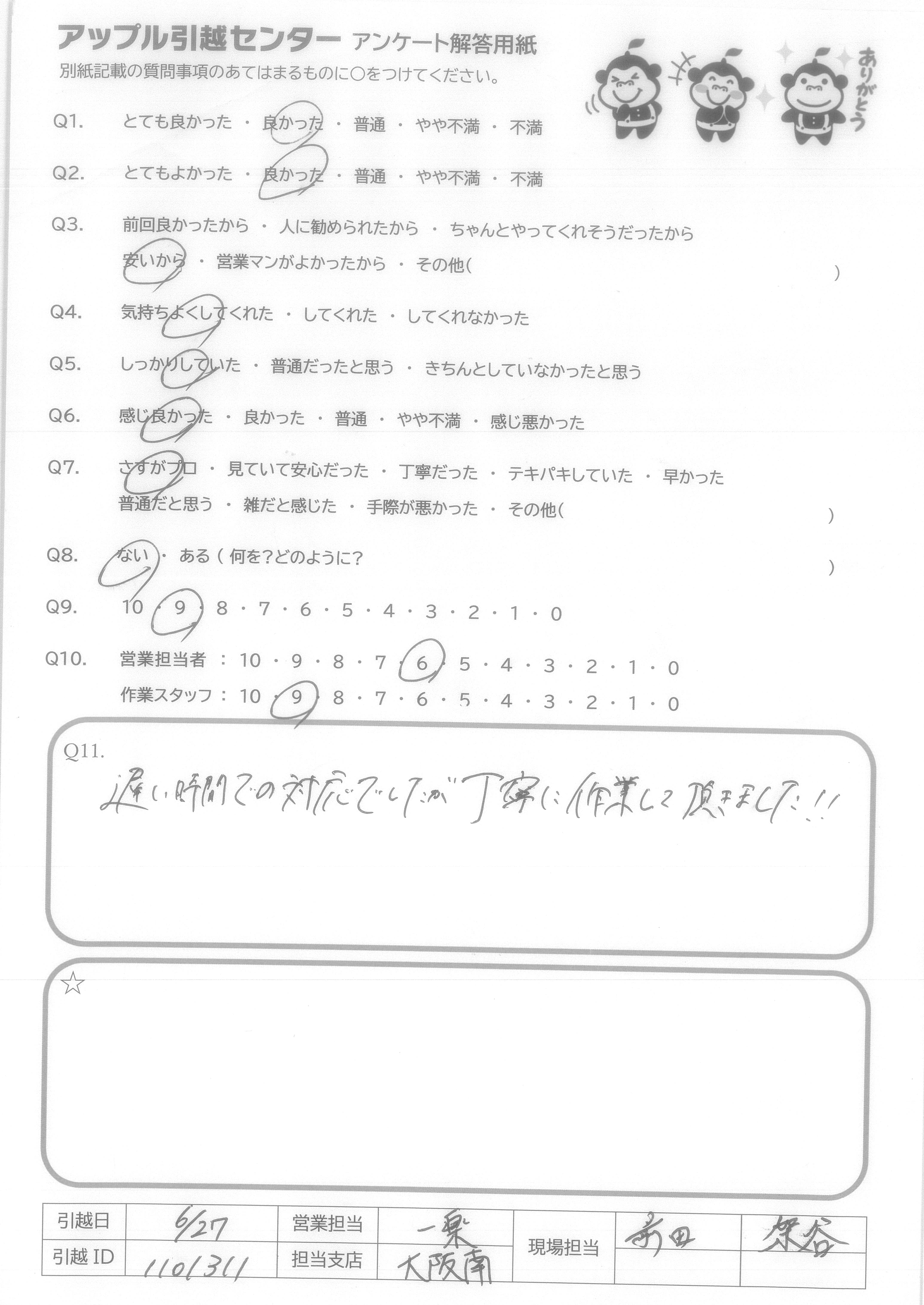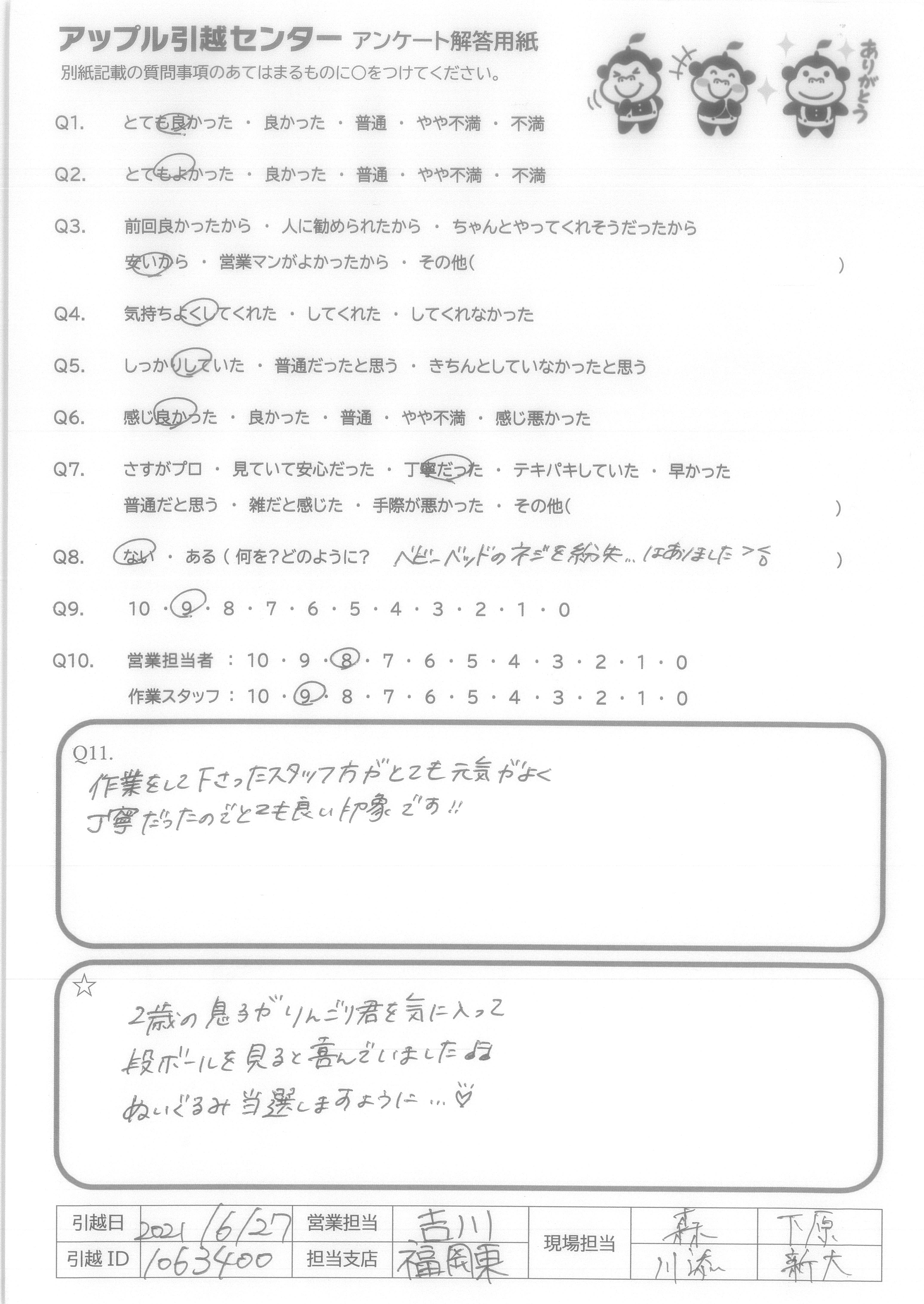 A.電話で申し込みをしたため、不安はありましたが、当日の対応を見てとても安心感があり、頼んでよかったと思いました。引越しは激務かと思いますが、引き続き頑張って頂きたいと思います。ありがとうございました。