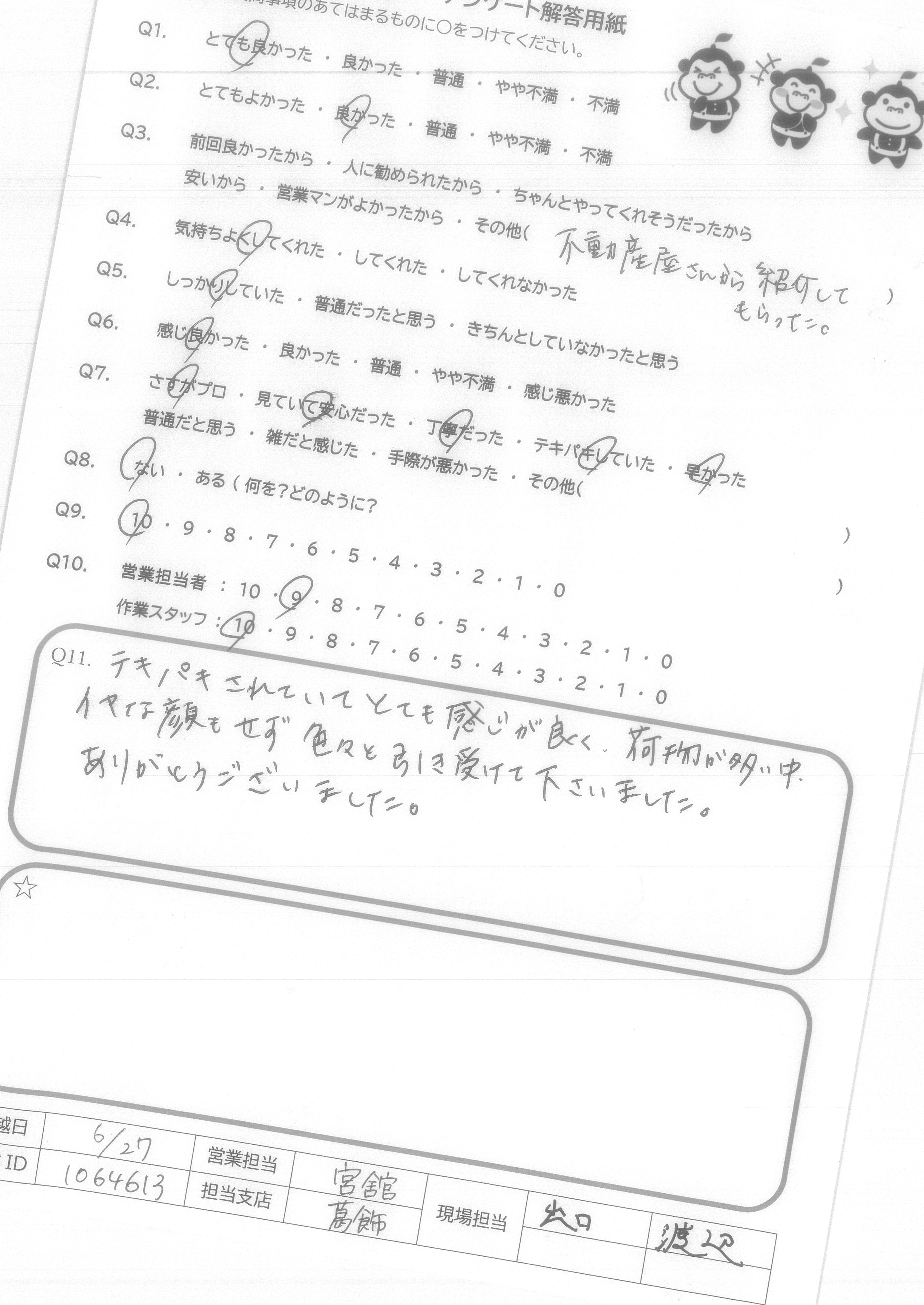 A.営業の方も非常に良い対応で(おもしろかったです。) 現場スタッフさんもテキパキとても良くやっていただきました。ありがとうございました。