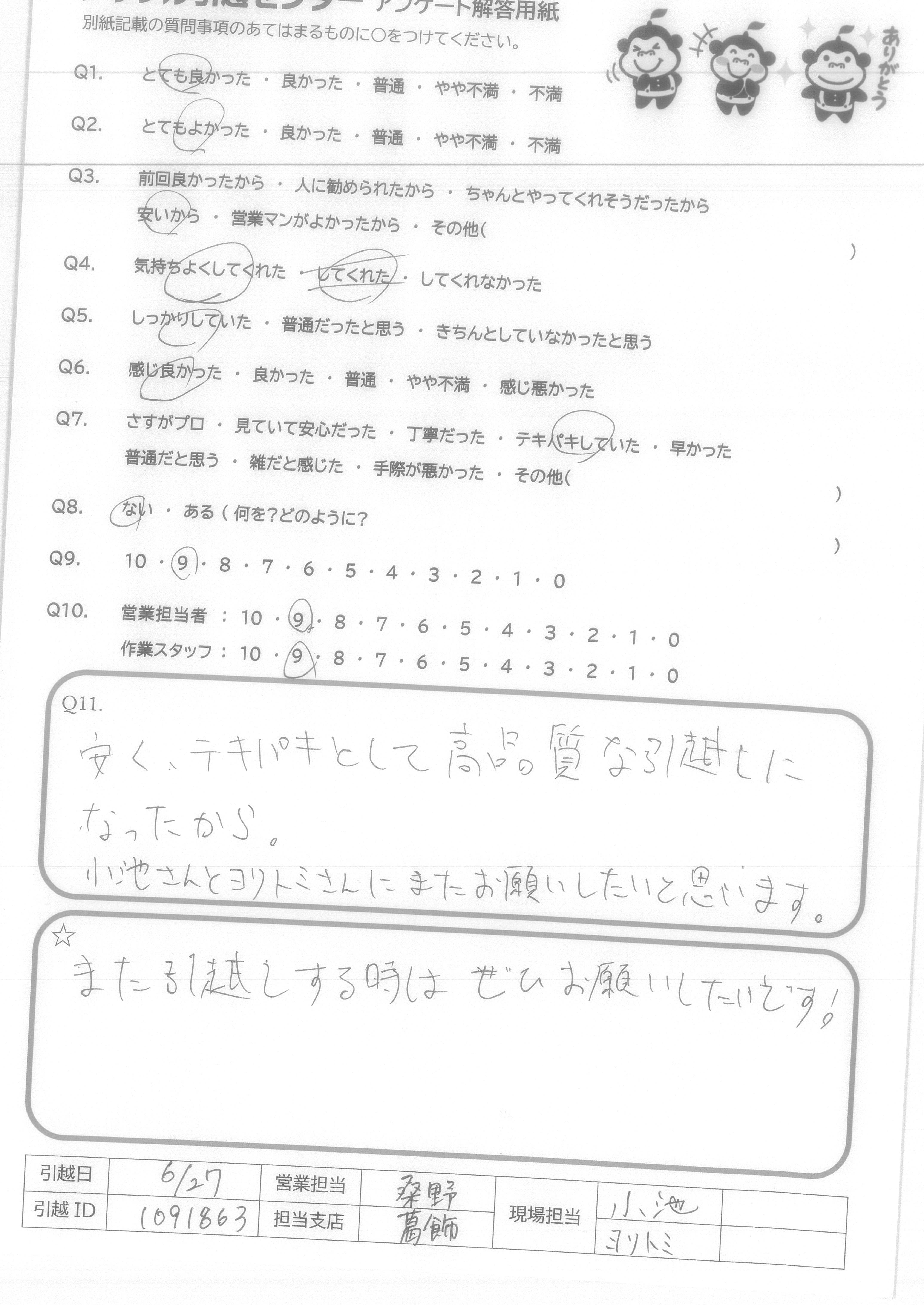 A.安く、テキパキとして高品質な引越しになったから。 小池さんとヨリトミさんにまたお願いしたいと思います。