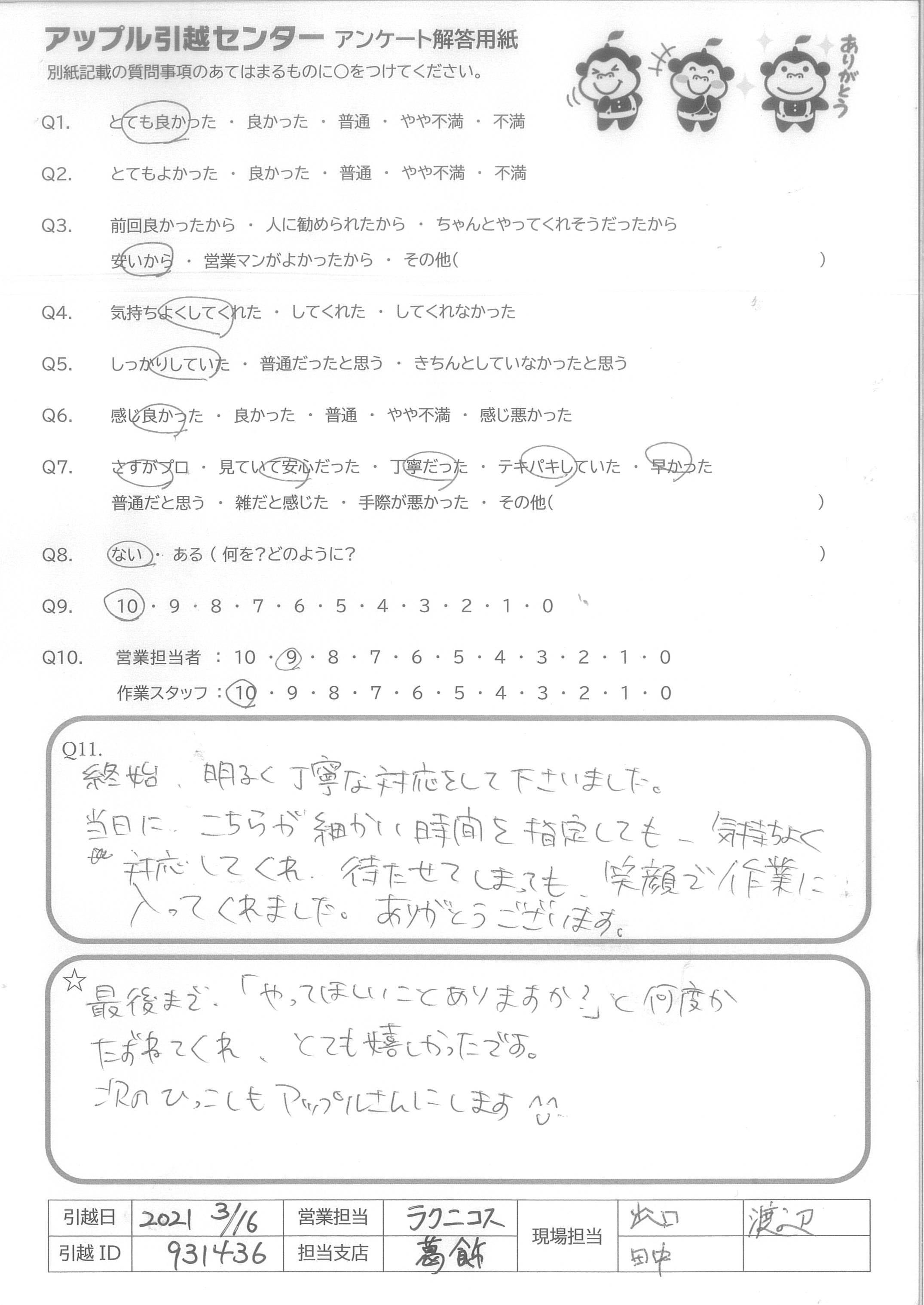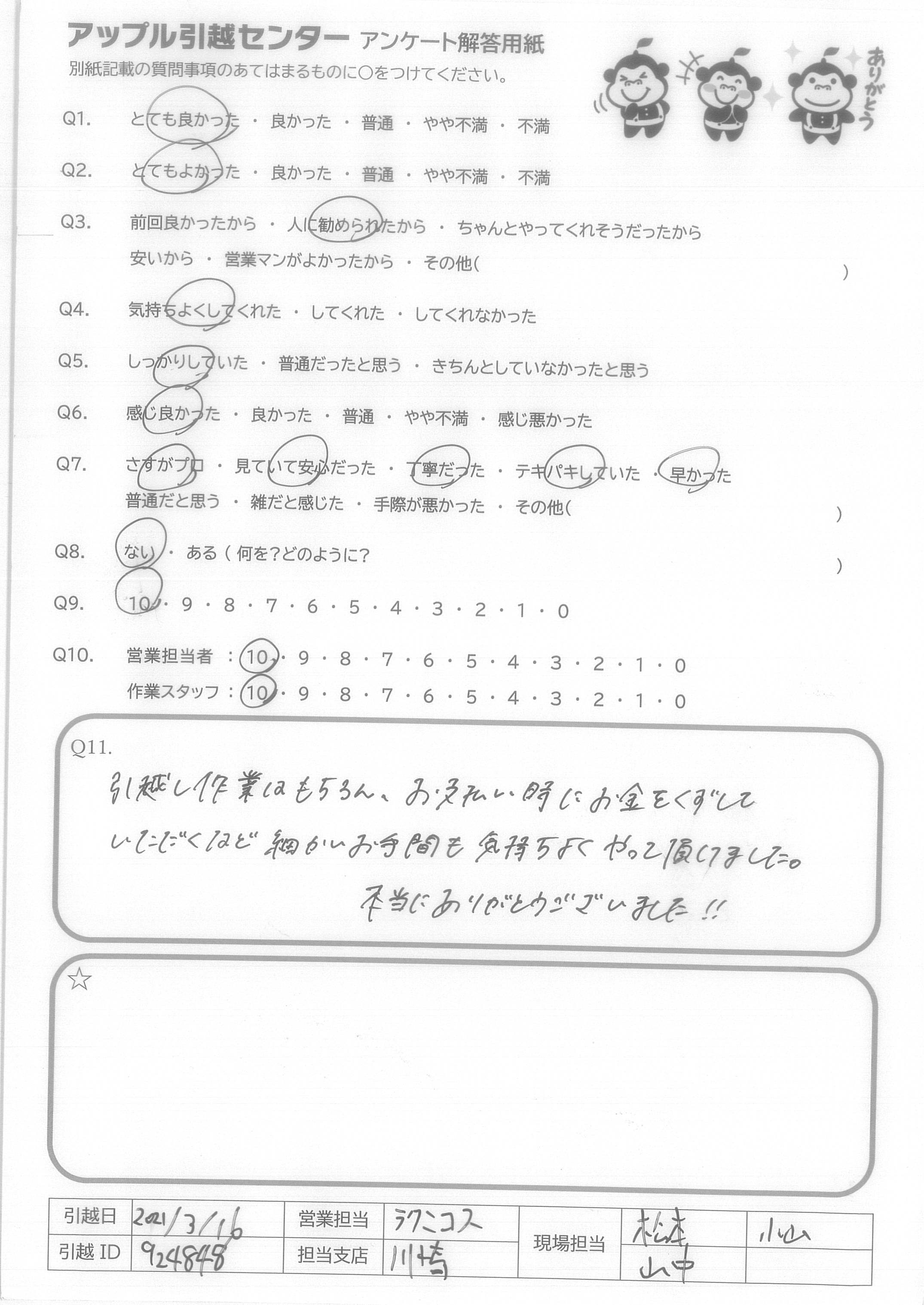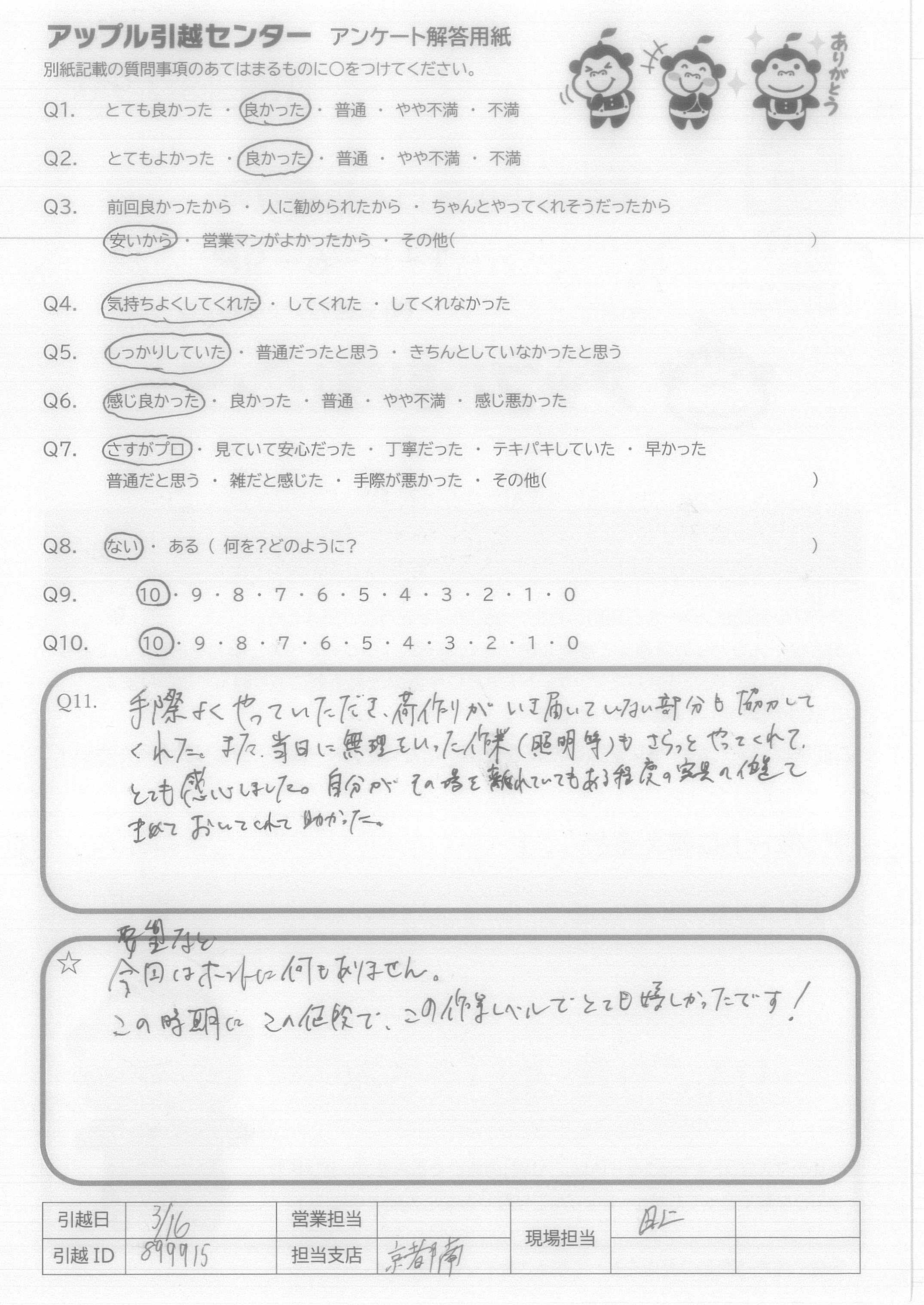 A.最後まで、「やってほしいことありますか?」何度かたずねてくれ、とても嬉しかったです。 次のひっこしもアップルさんにします。