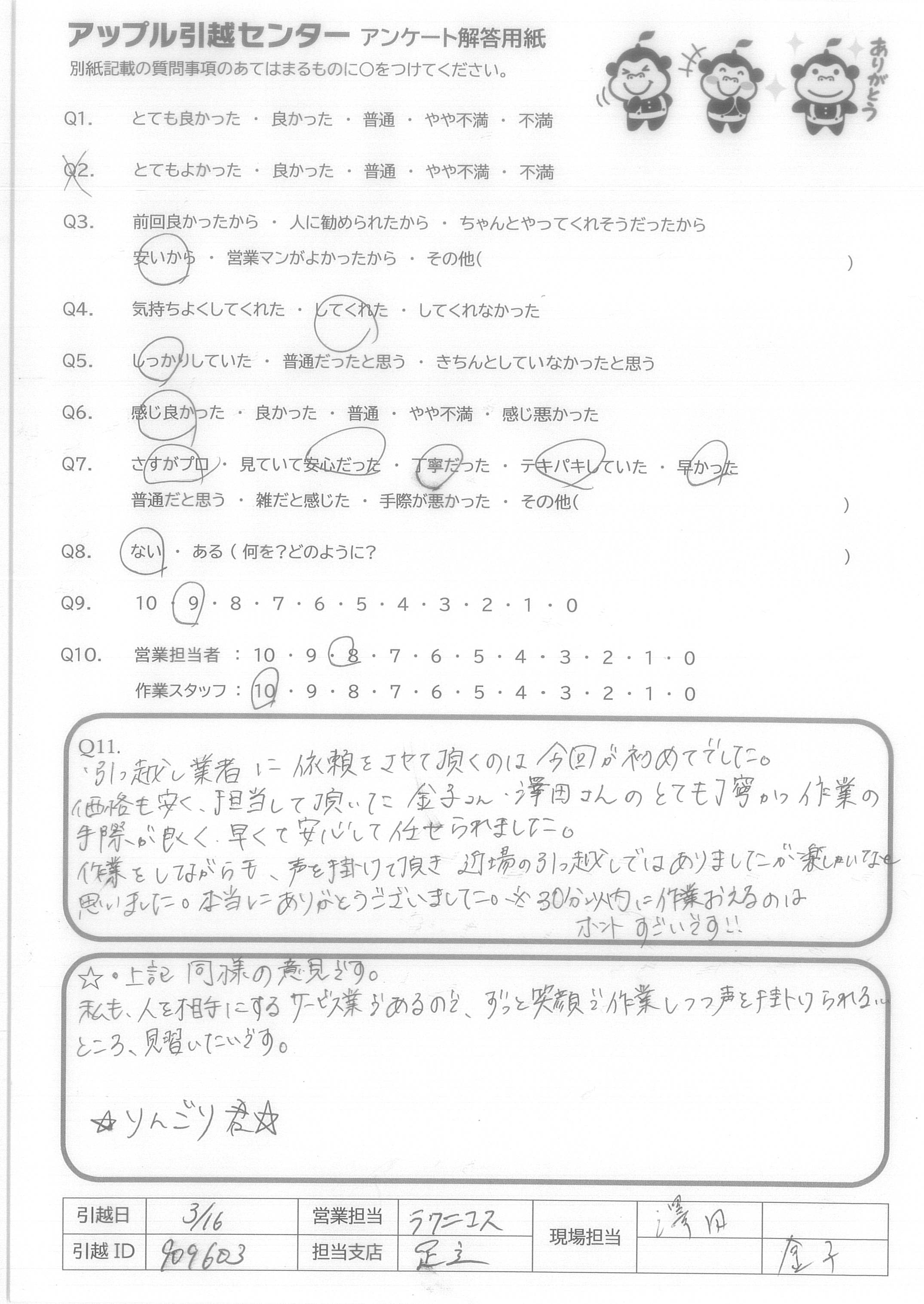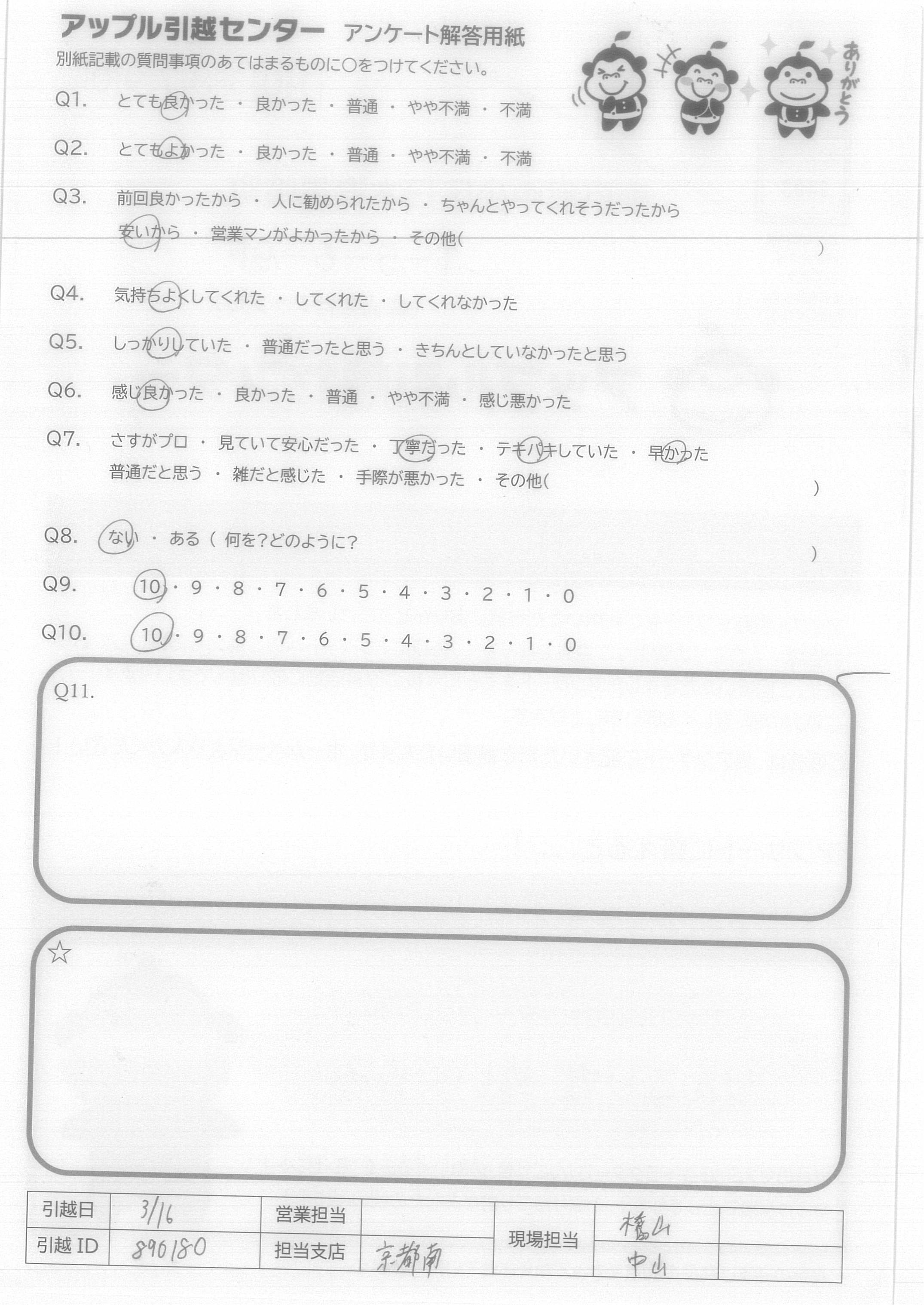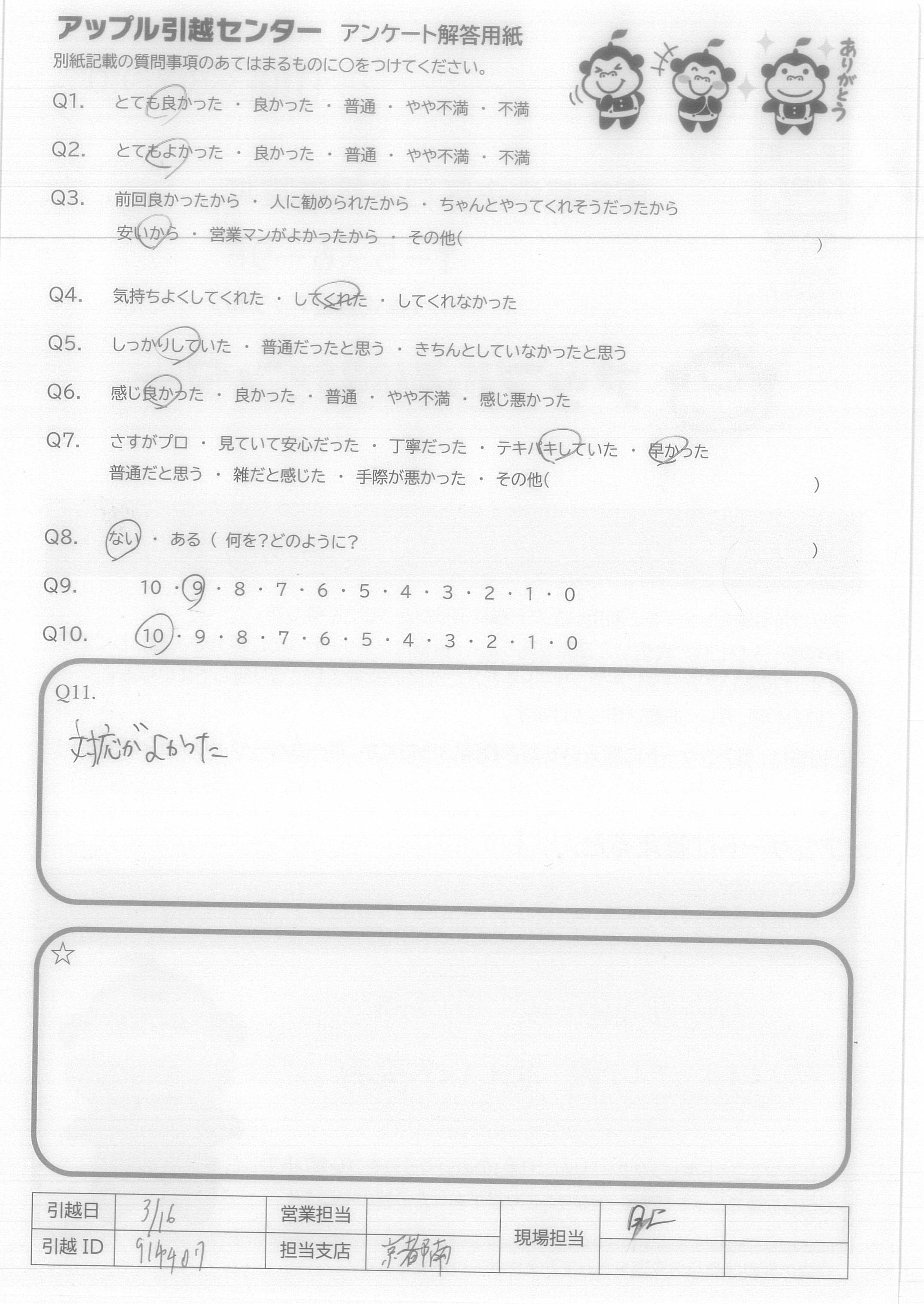 A.最後まで、「やってほしいことありますか?」何度かたずねてくれ、とても嬉しかったです。 次のひっこしもアップルさんにします。