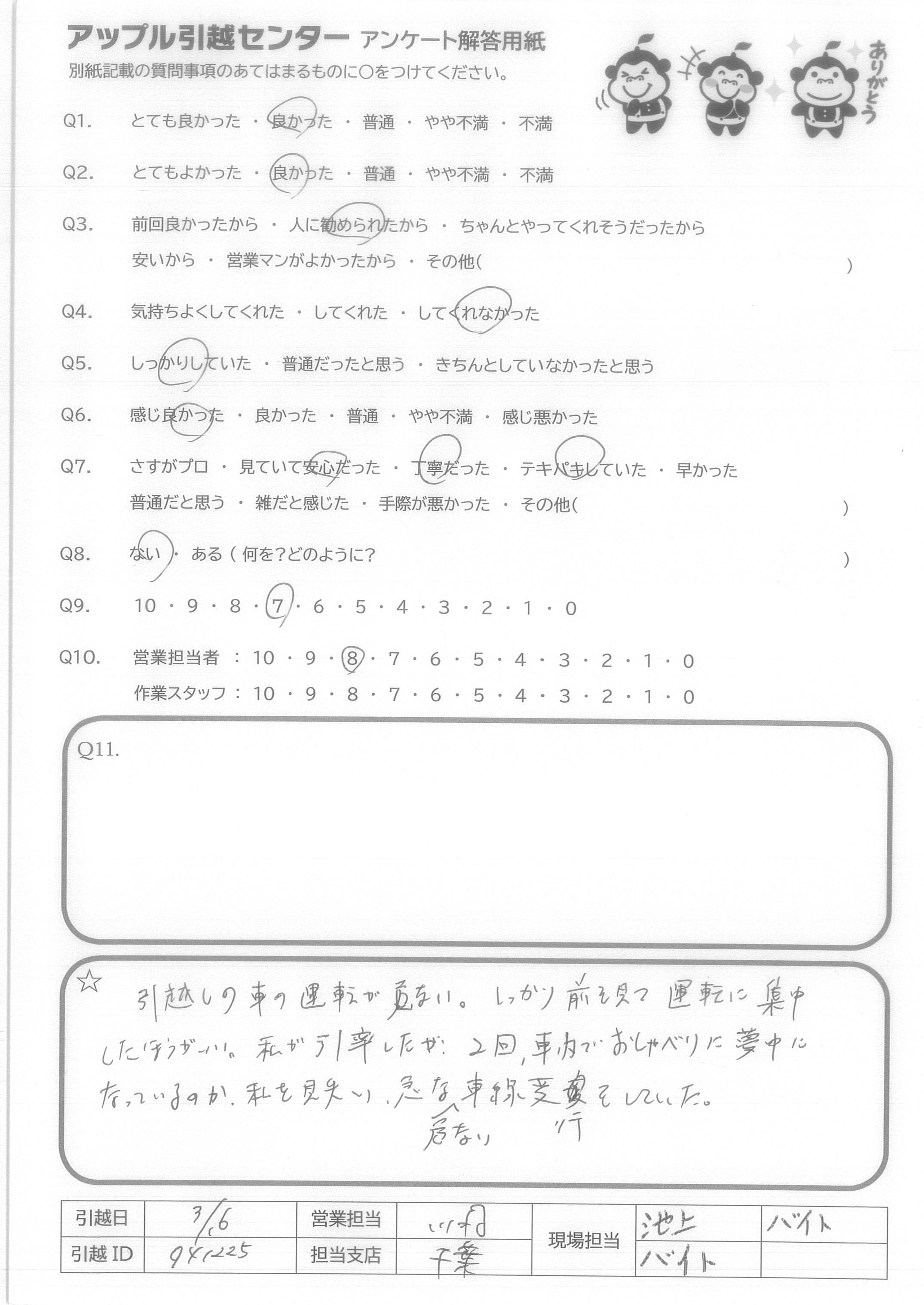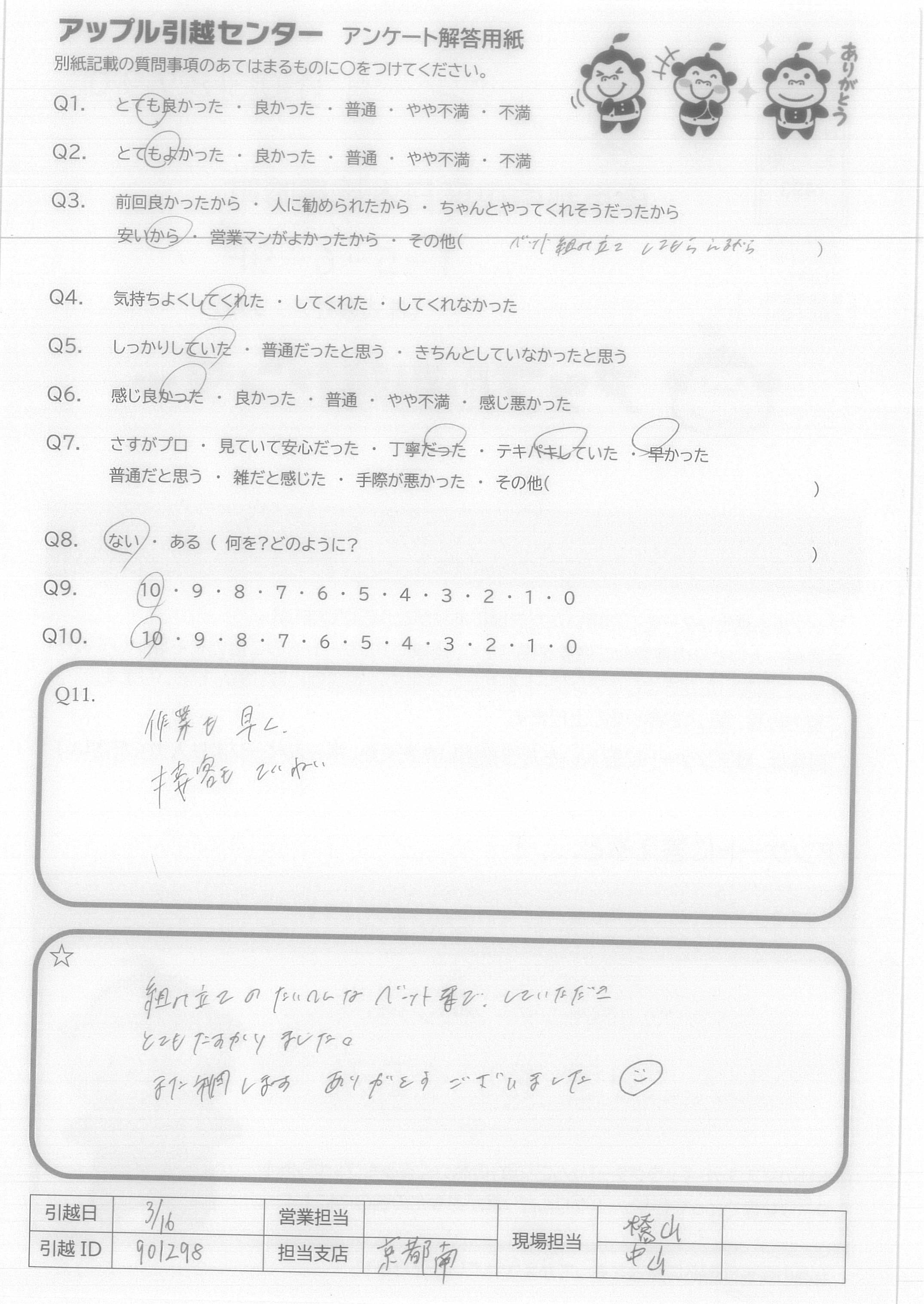 A.とても感じのいい方で仕事もテキパキ気持ち良く動いて下さり早くに追われました。 最後までにこやかにていねいにあいさつして下さり、気持ち良く引越しすることができました。