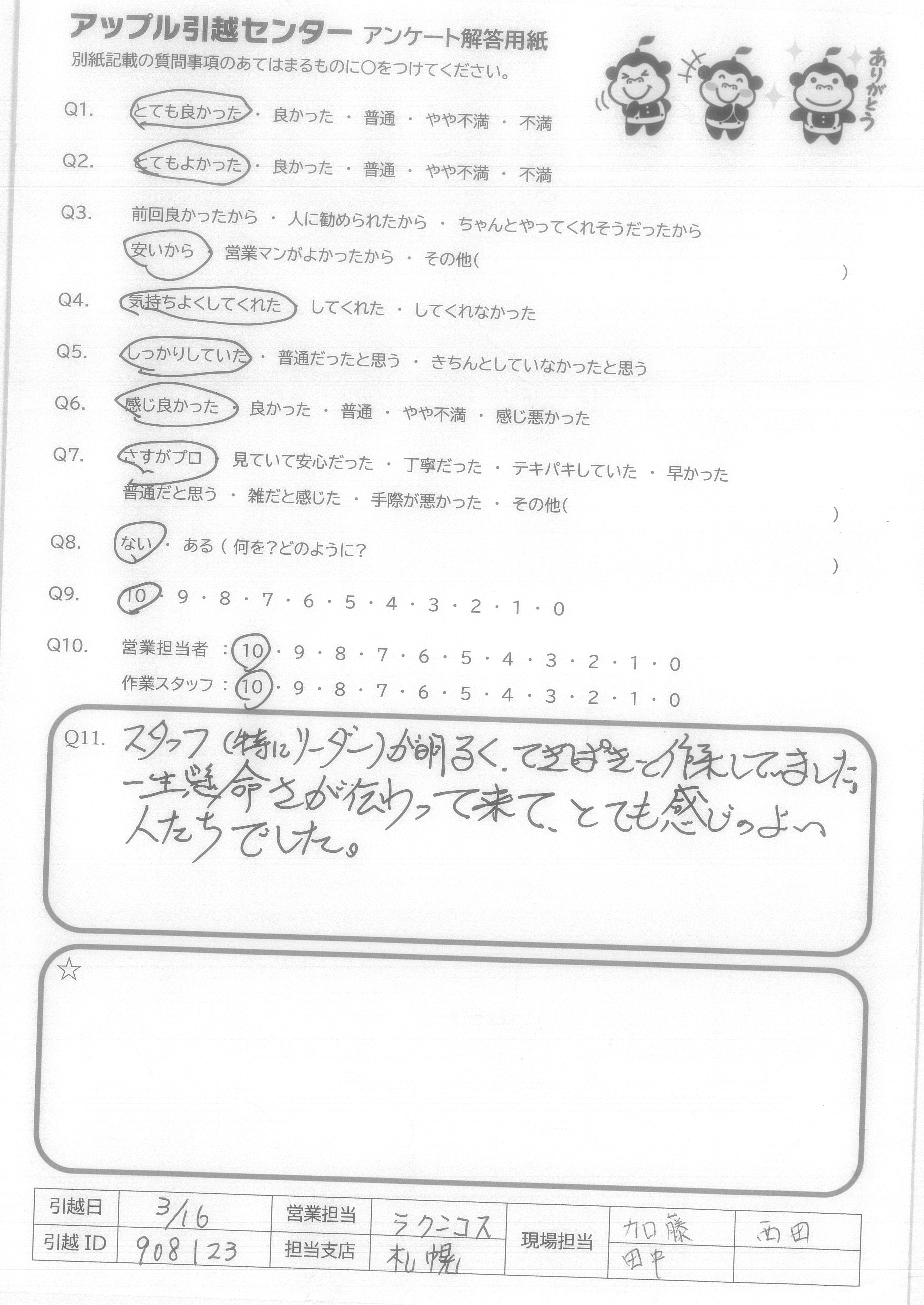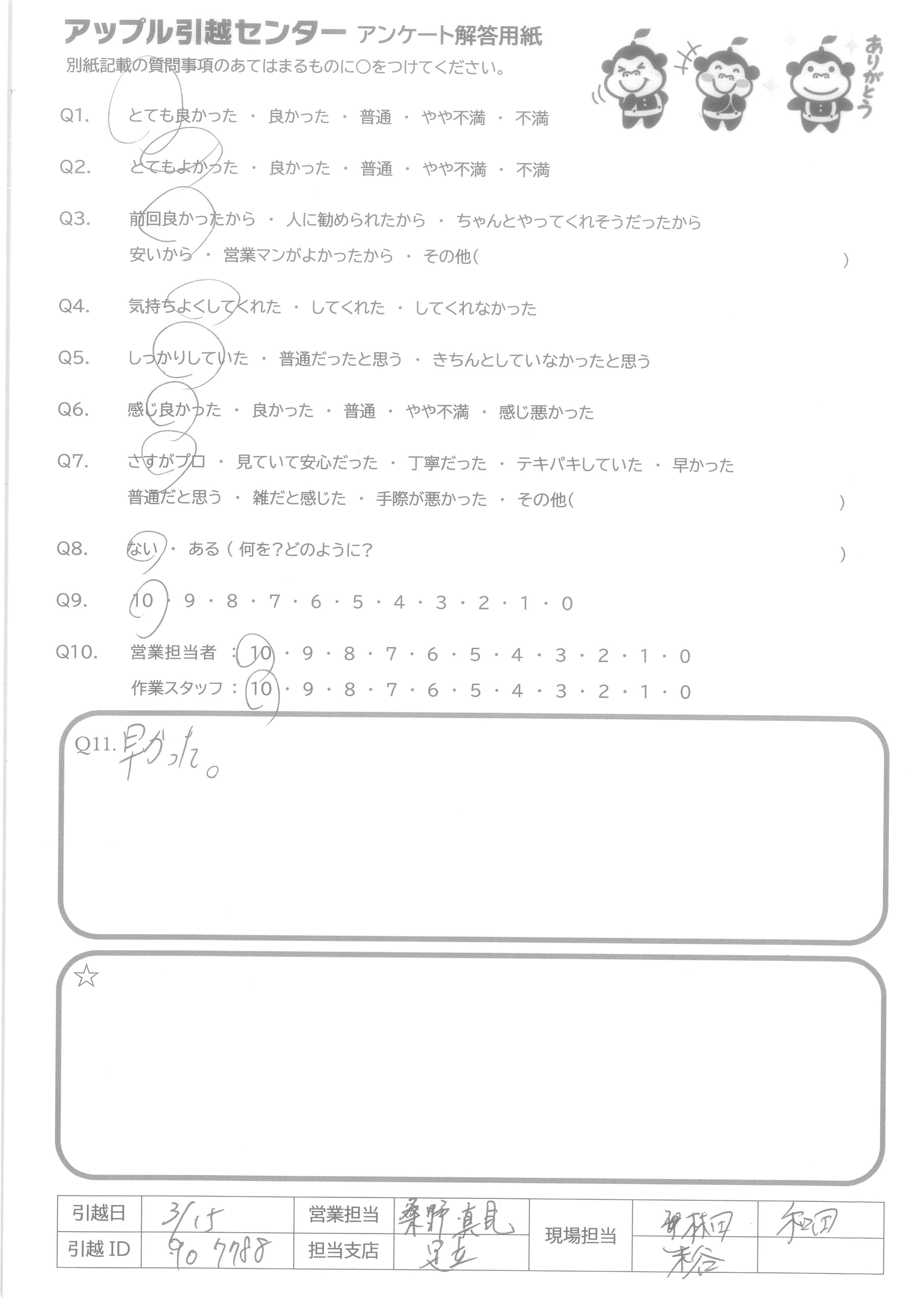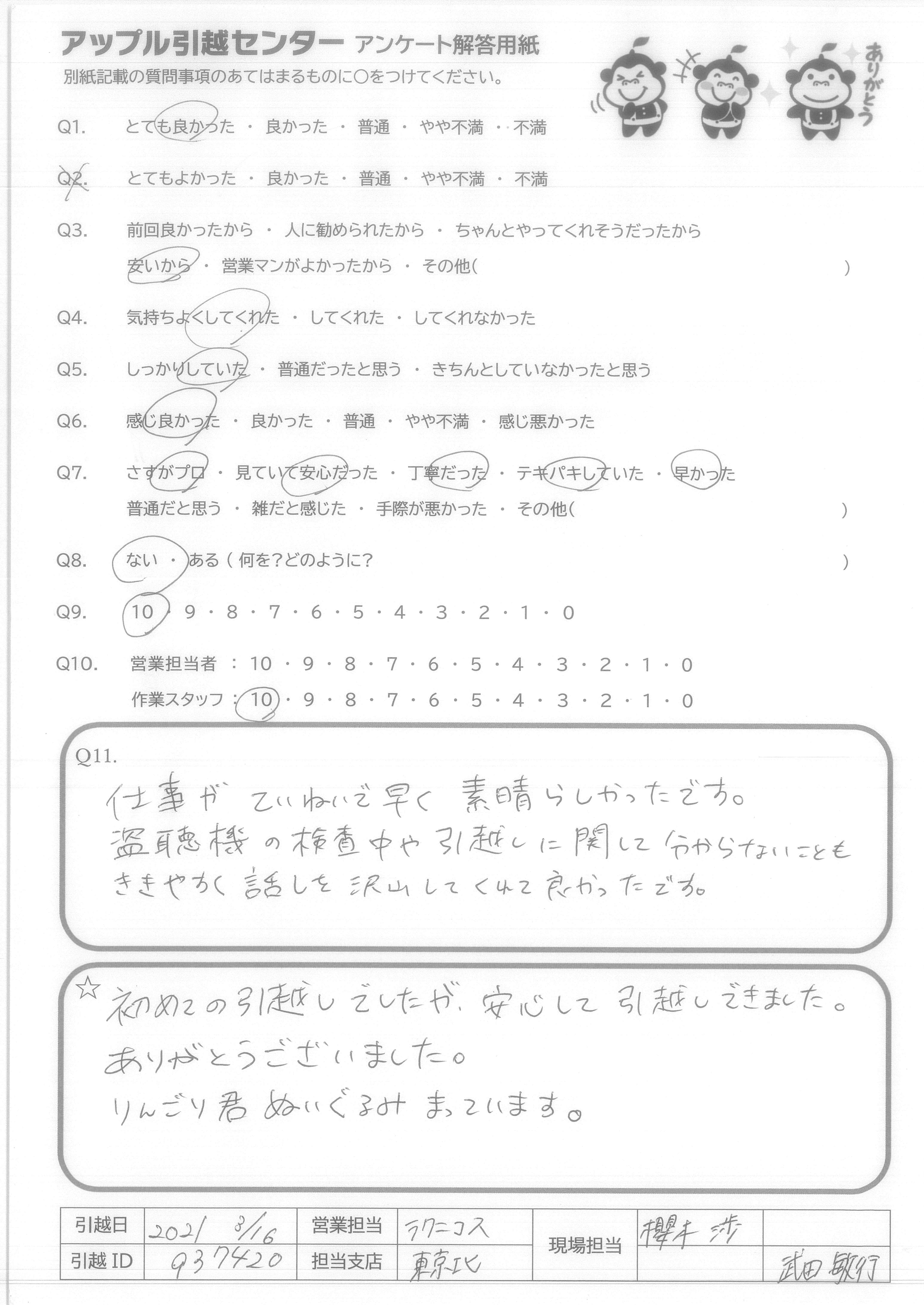A.今回は長距離の引越にも関わらず、素早いお見積且つ、リーズナブルなお値段でご対応頂きありがとうございました。 当日も非常にスピーディーで感じも良く、爽やかに対応して頂けました。りんごりくんかわいい!