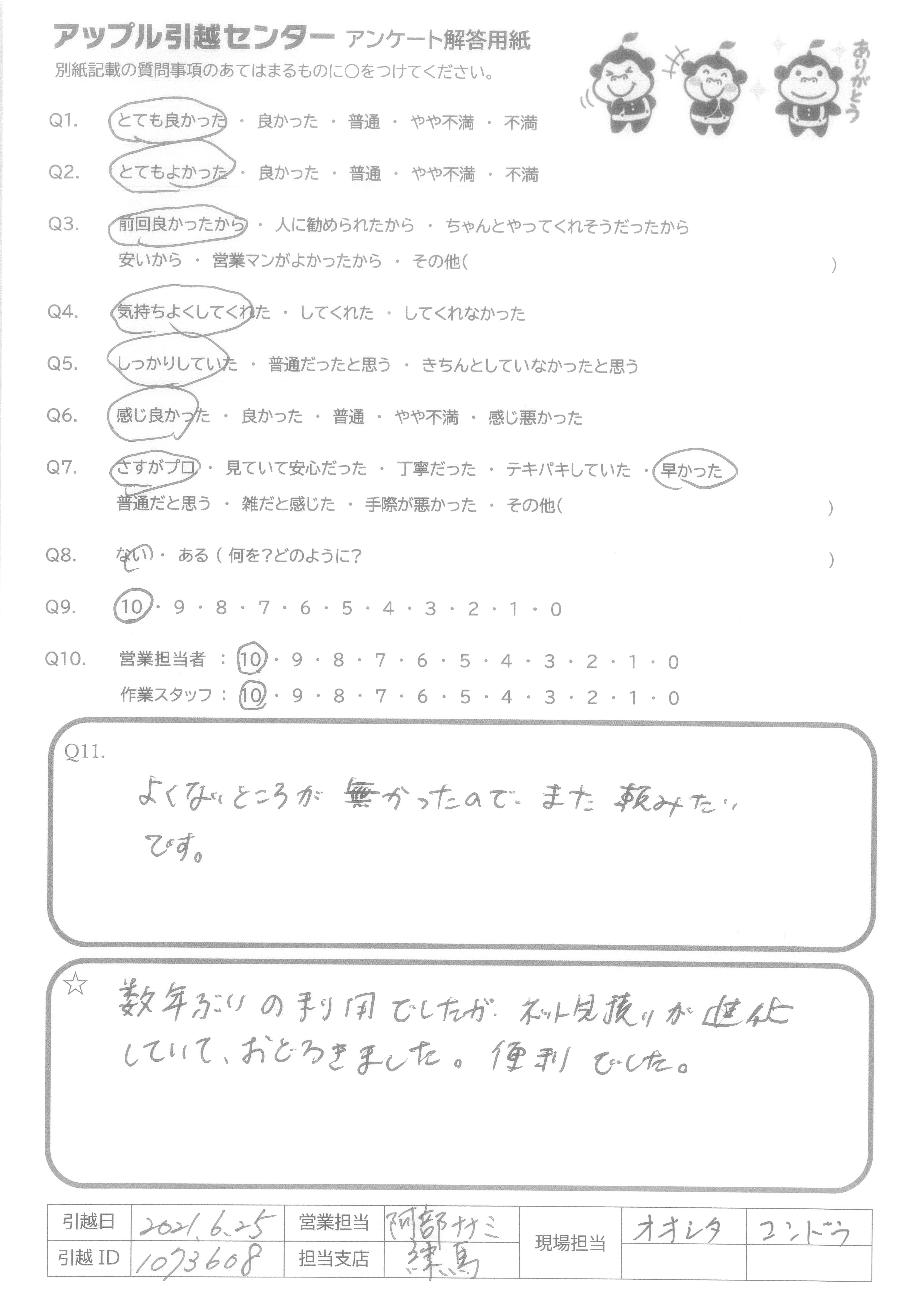 A.とても感じが良かった また引越しの時は頼みたいと想う