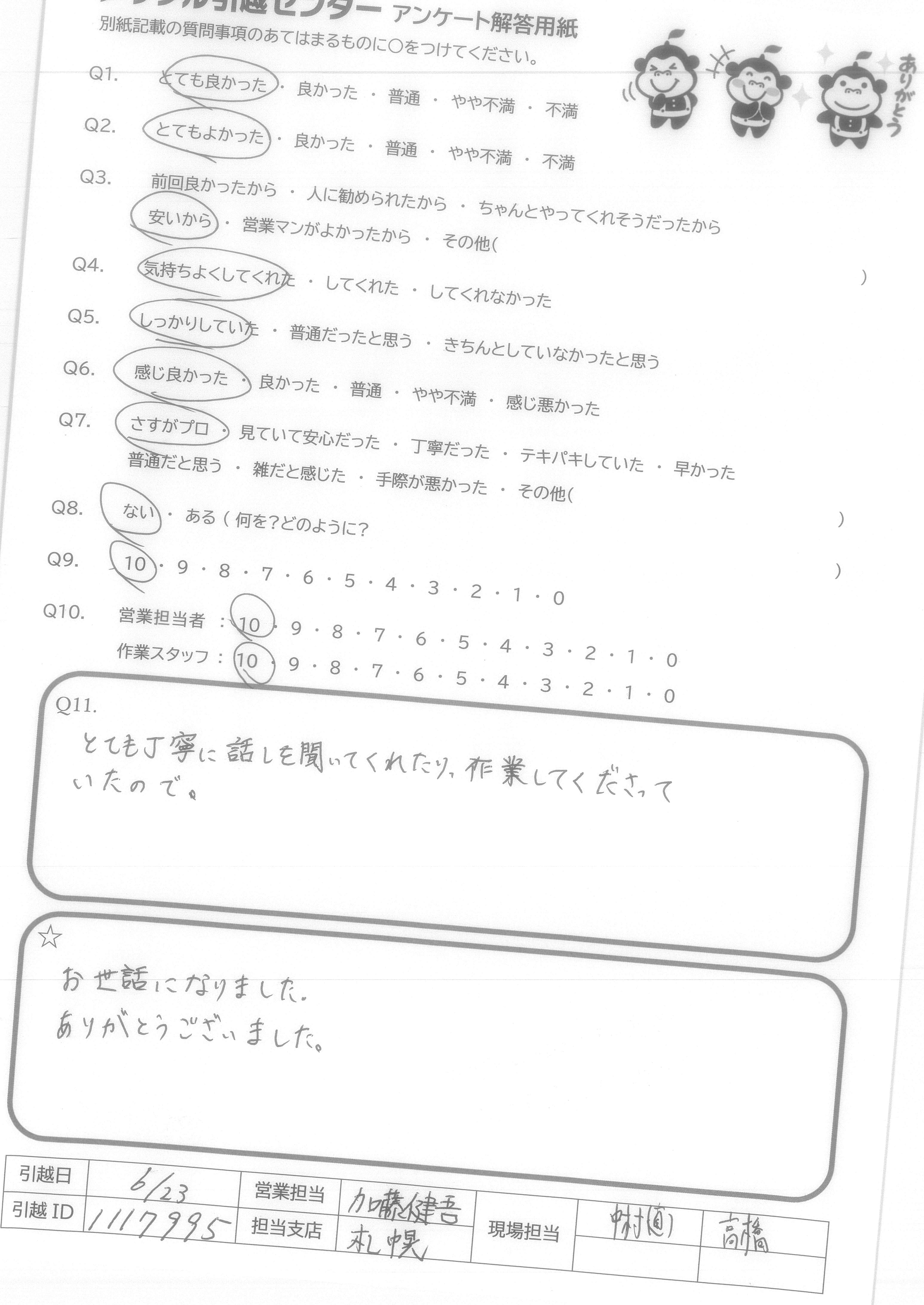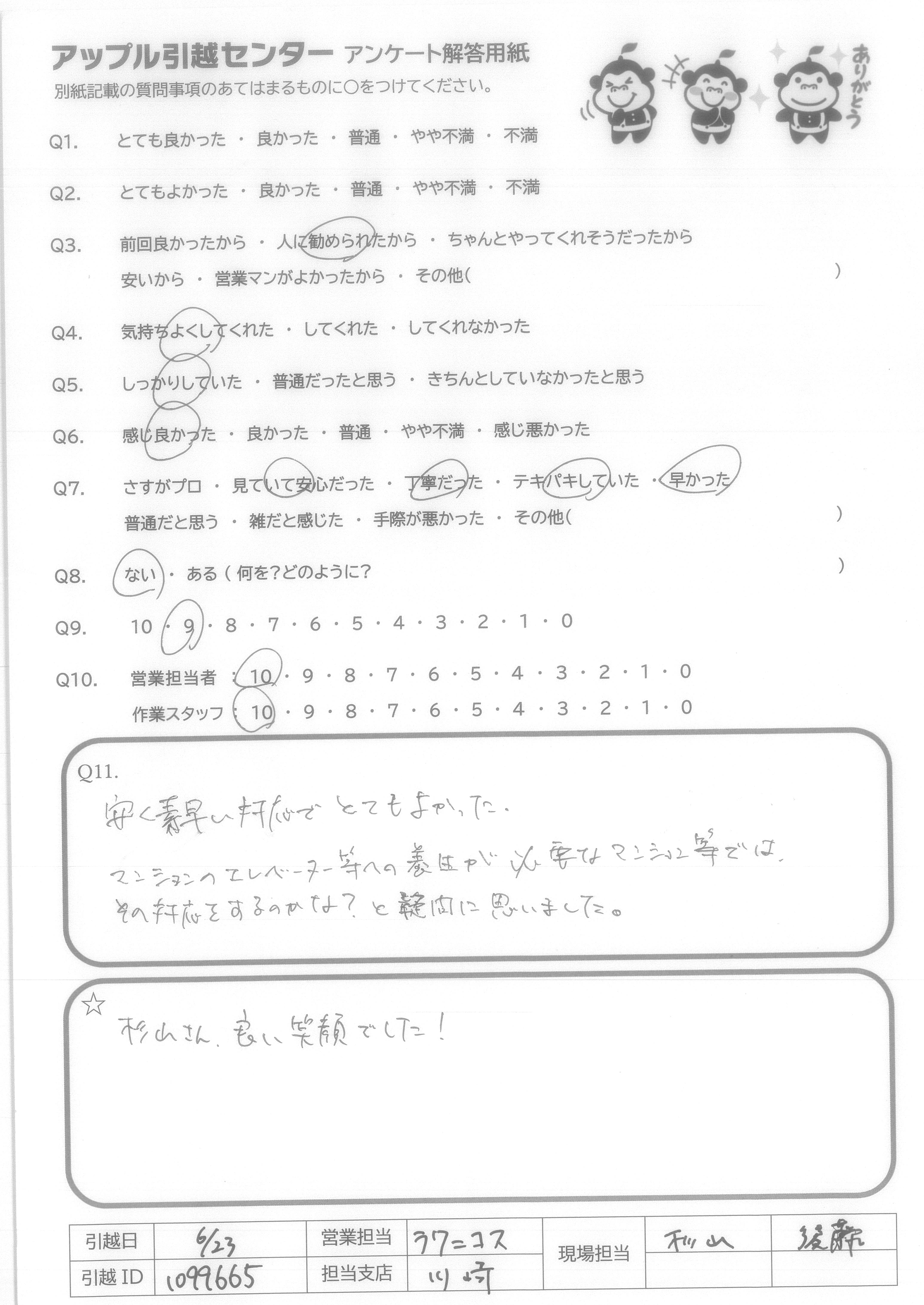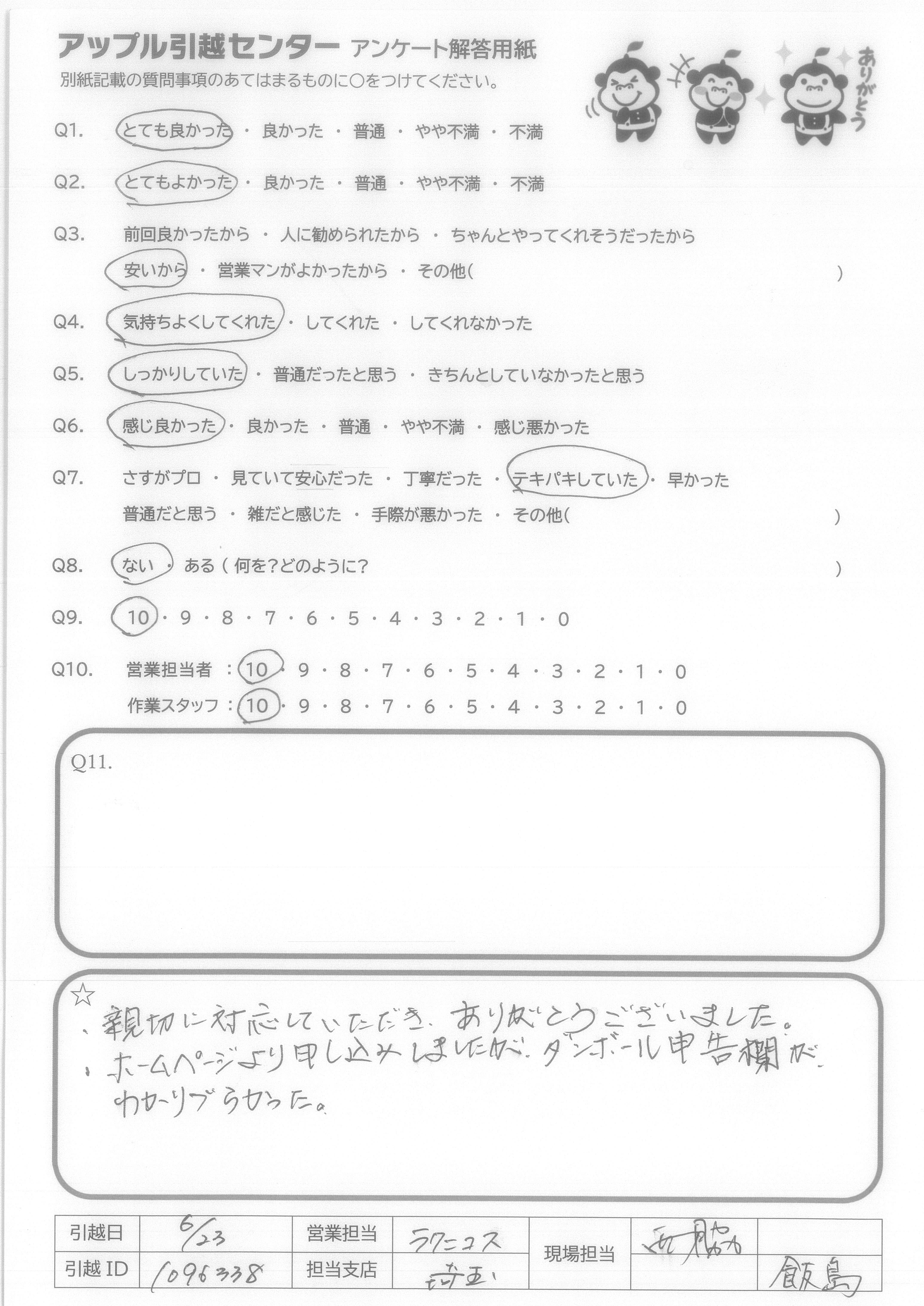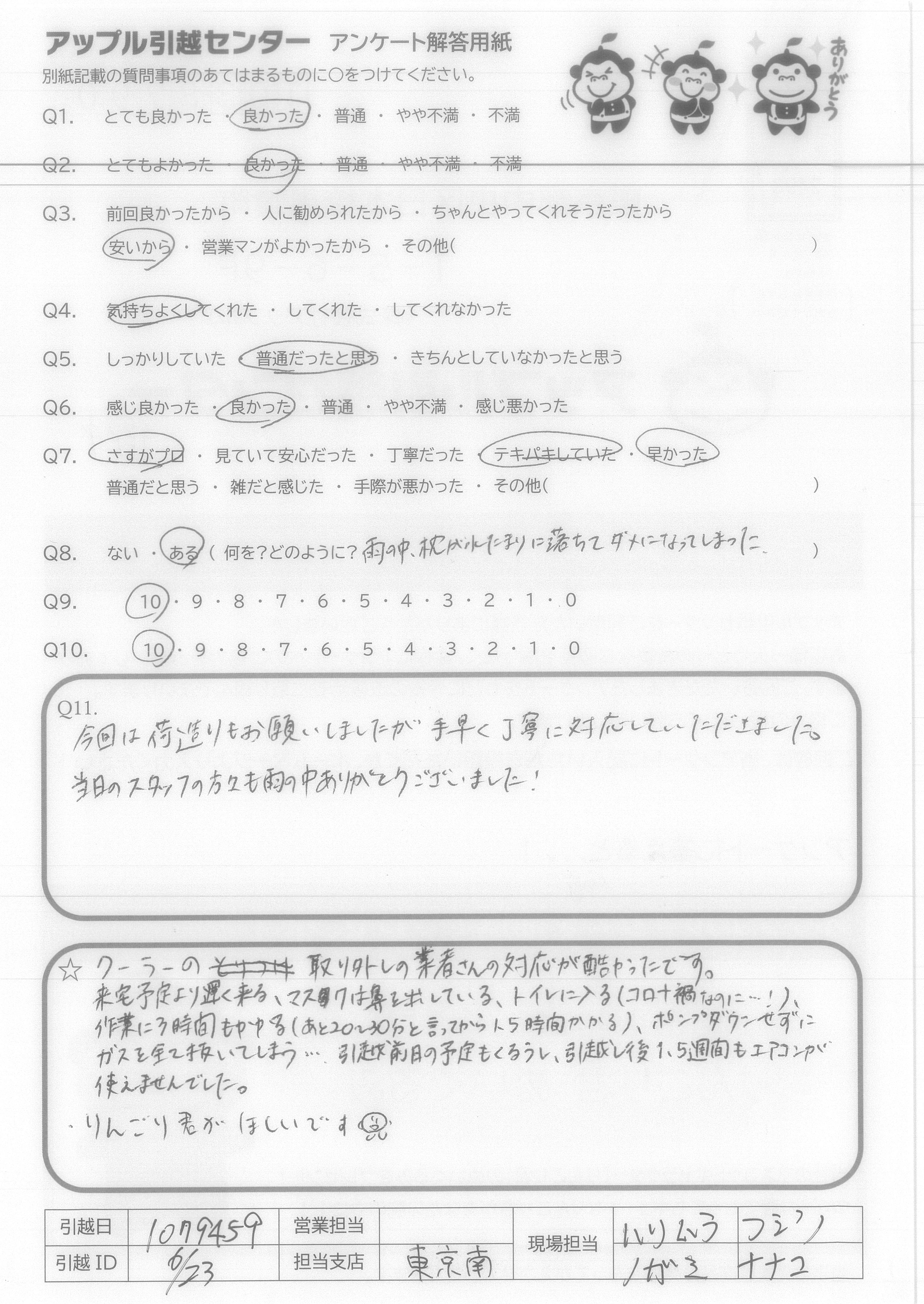 A.Q9→今回はじめての利用でしたが他社と比べて料金が安く作業時間もとても早かった。当日に荷物が増えても嫌な顔せず応じてくれた。 Q10→他の担当者の方々も利用してみたい為。