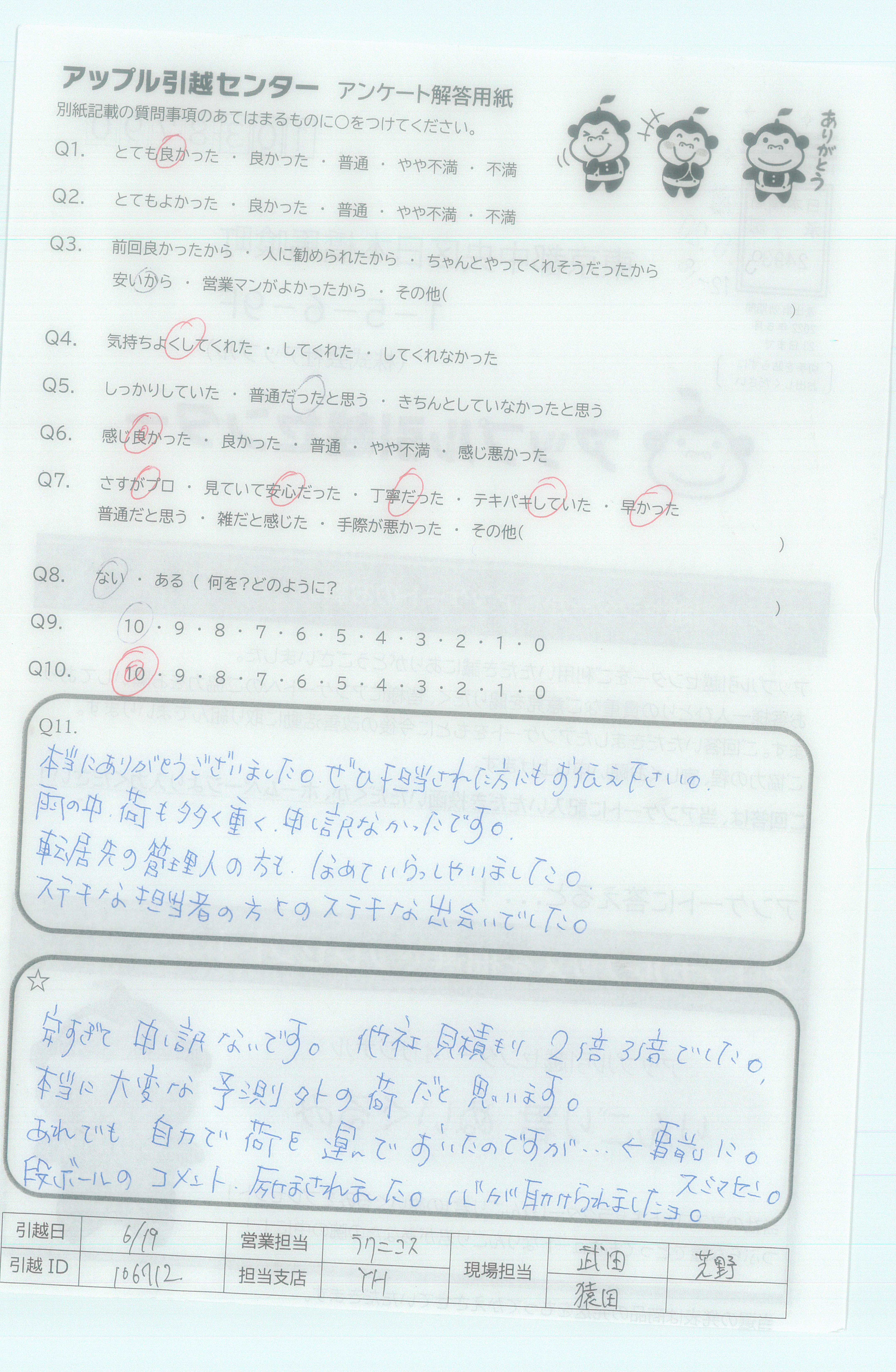 A.本当にありがとうございました。ぜひ担当された方にもお伝え下さい。 雨の中、荷も多く重く、申し訳なかったです。 転居先の管理人の方も、ほめていらっしゃいました。 ステキな担当者の方とのステキな出会いでした。