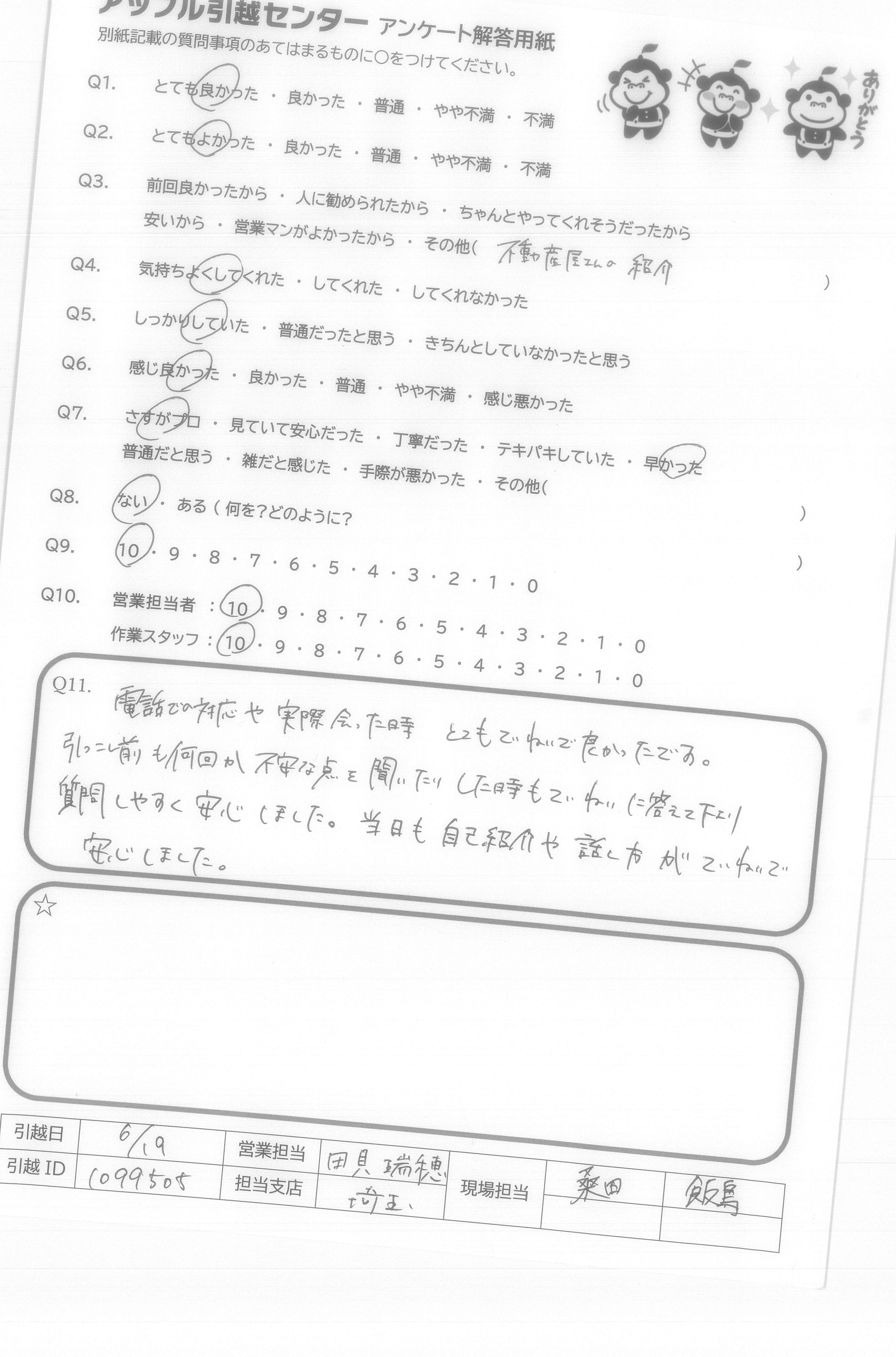A.電話での対応や実際会った時とてもていねいで良かったです。 引っこし前も何回か不安な点を聞いたりした時もていねいに答えて下さい質問しやすく安心しました。当日も自己紹介や話し方がていねいで安心しました。