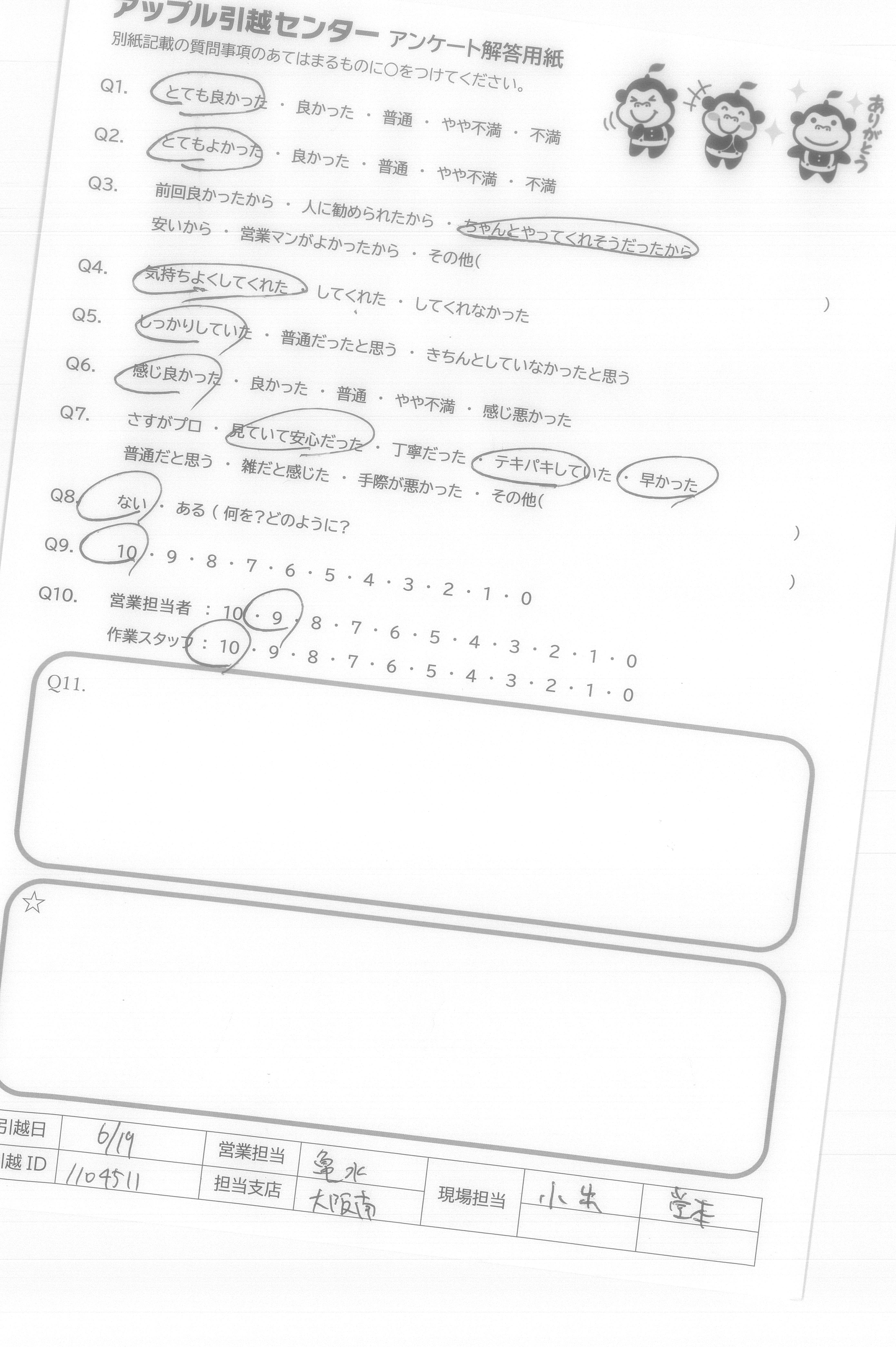 A.価格も高額でなく、とても作業が、素早く丁寧に対応して下さって、引越し経験のほとんどなかったのですが、分かりやすくて良かったです。ありがとうございました。