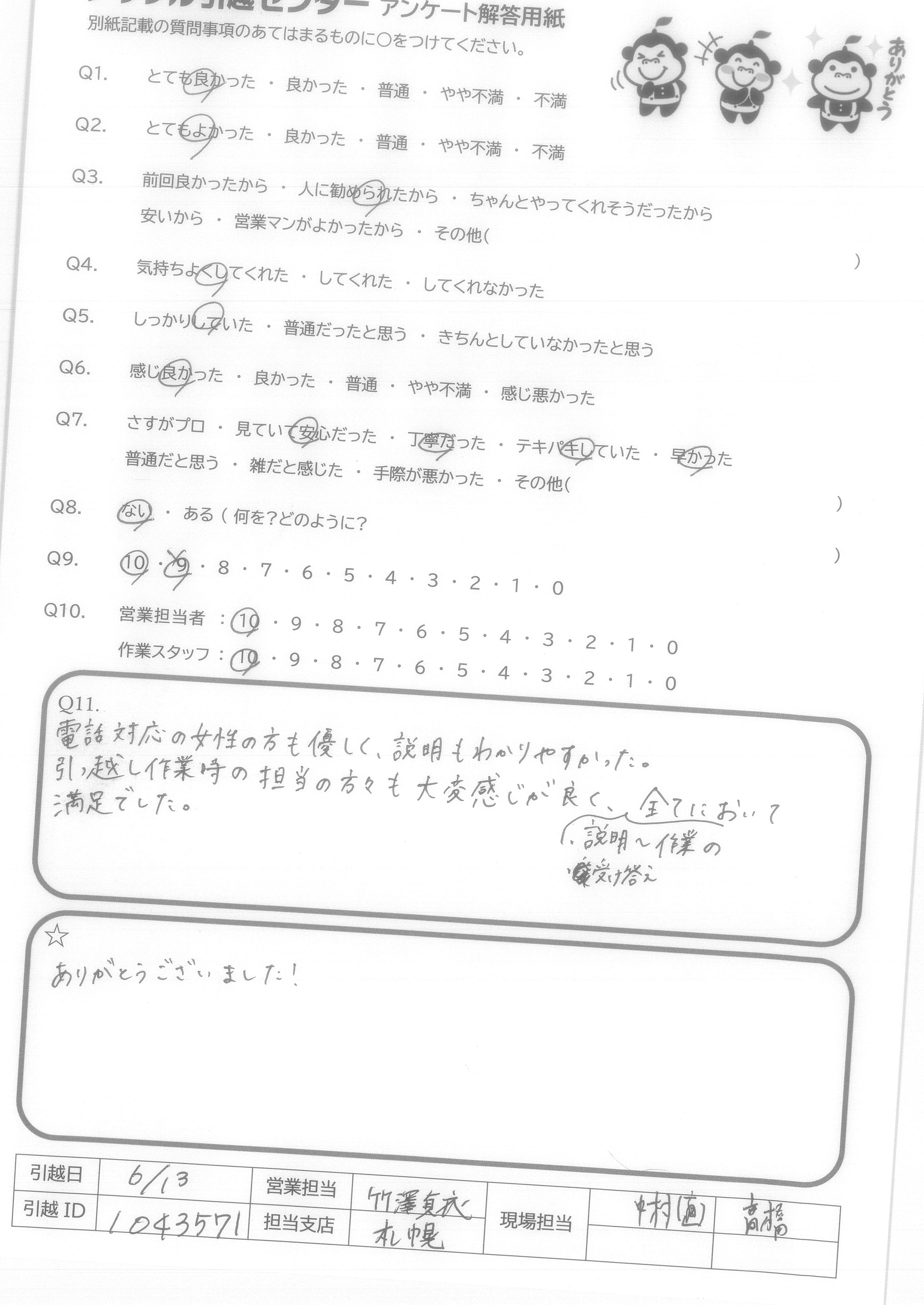A.明るく元気でテキパキされていて、安心してお任せできました。 沢山荷物があって申し訳なかったです… ありがとうございました!!