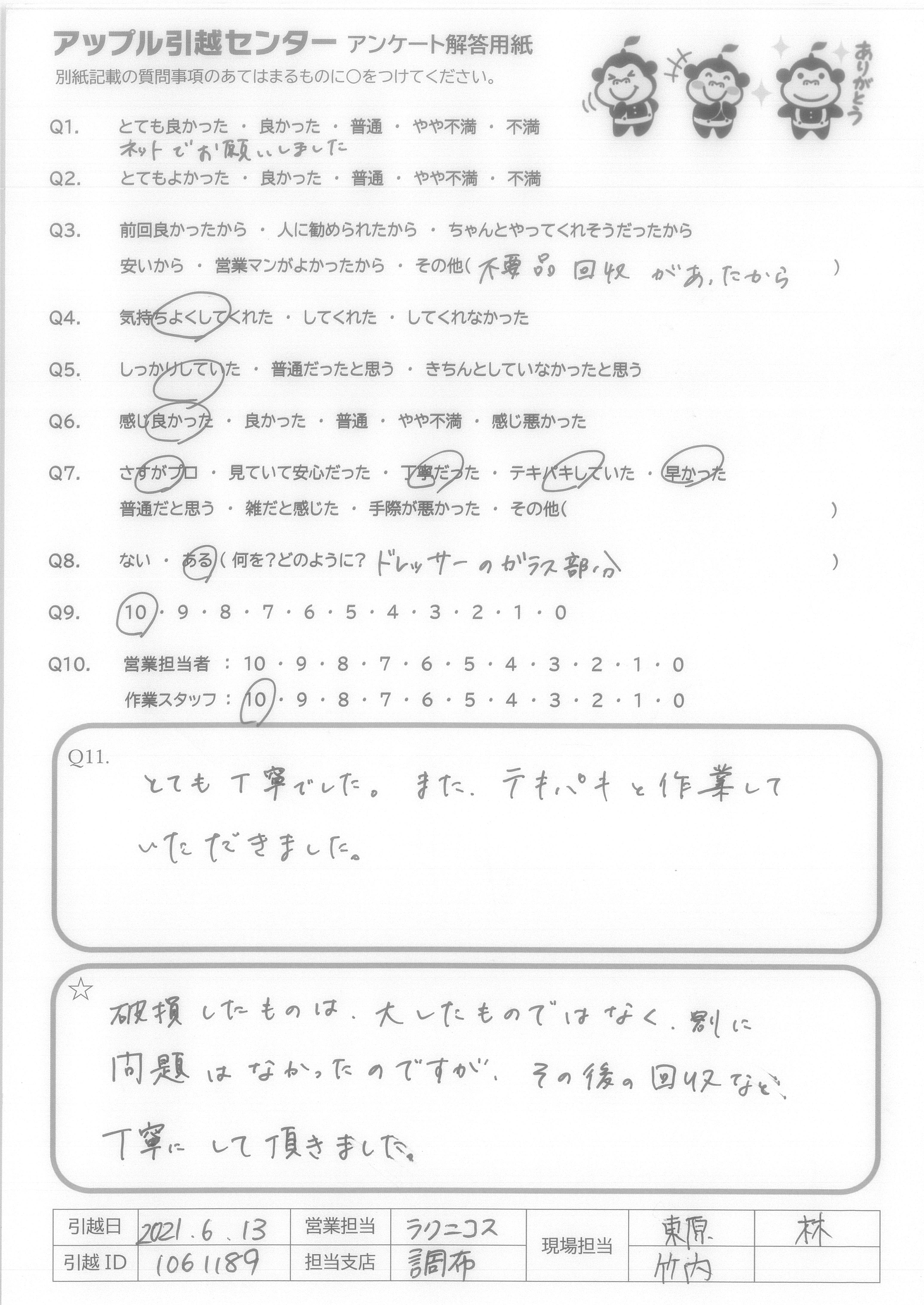 A.急な引き取り品の追加、家具の配置・組み立てなど快く引き受けて頂き助かリました。ありがとうございました。
