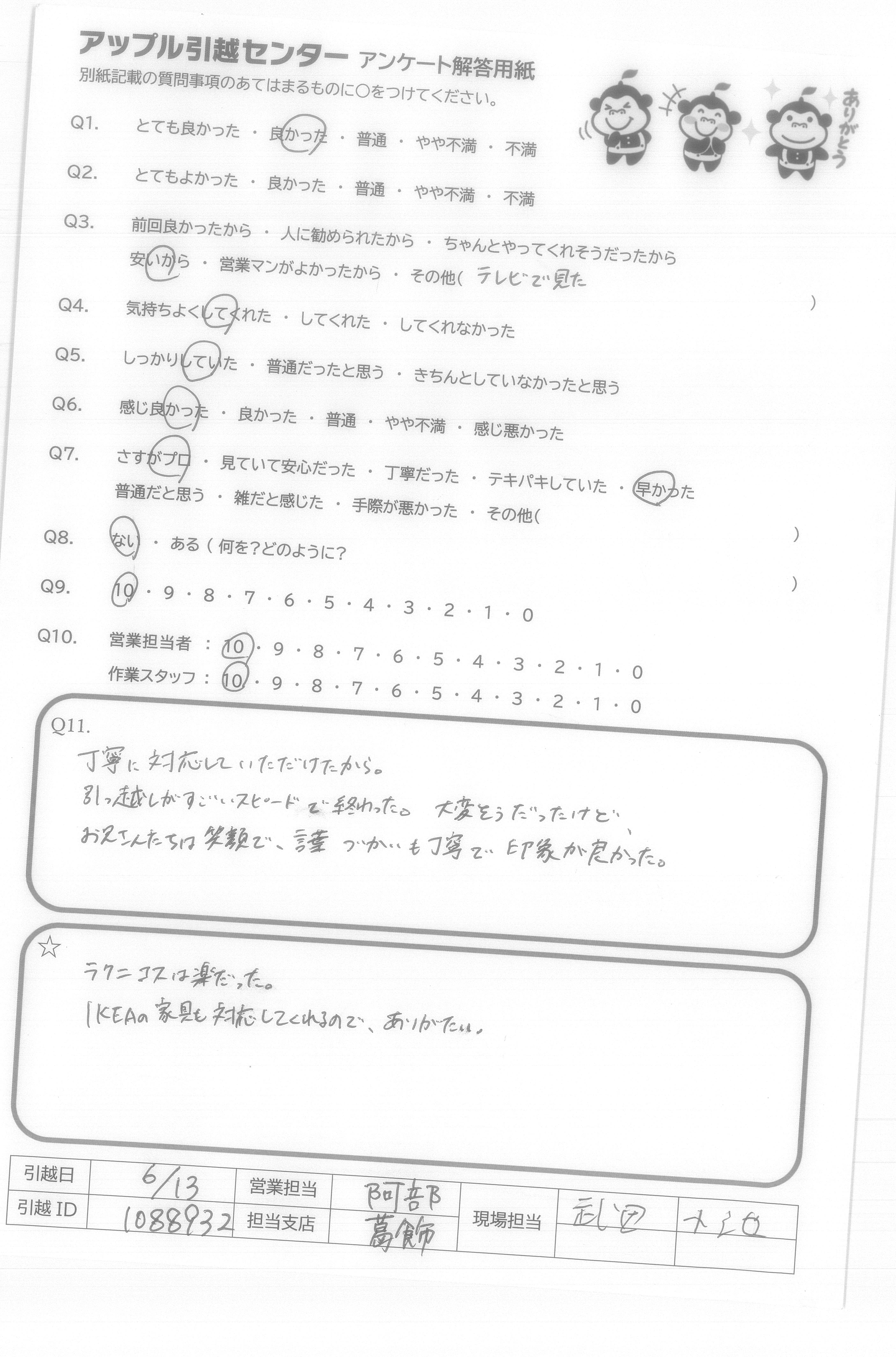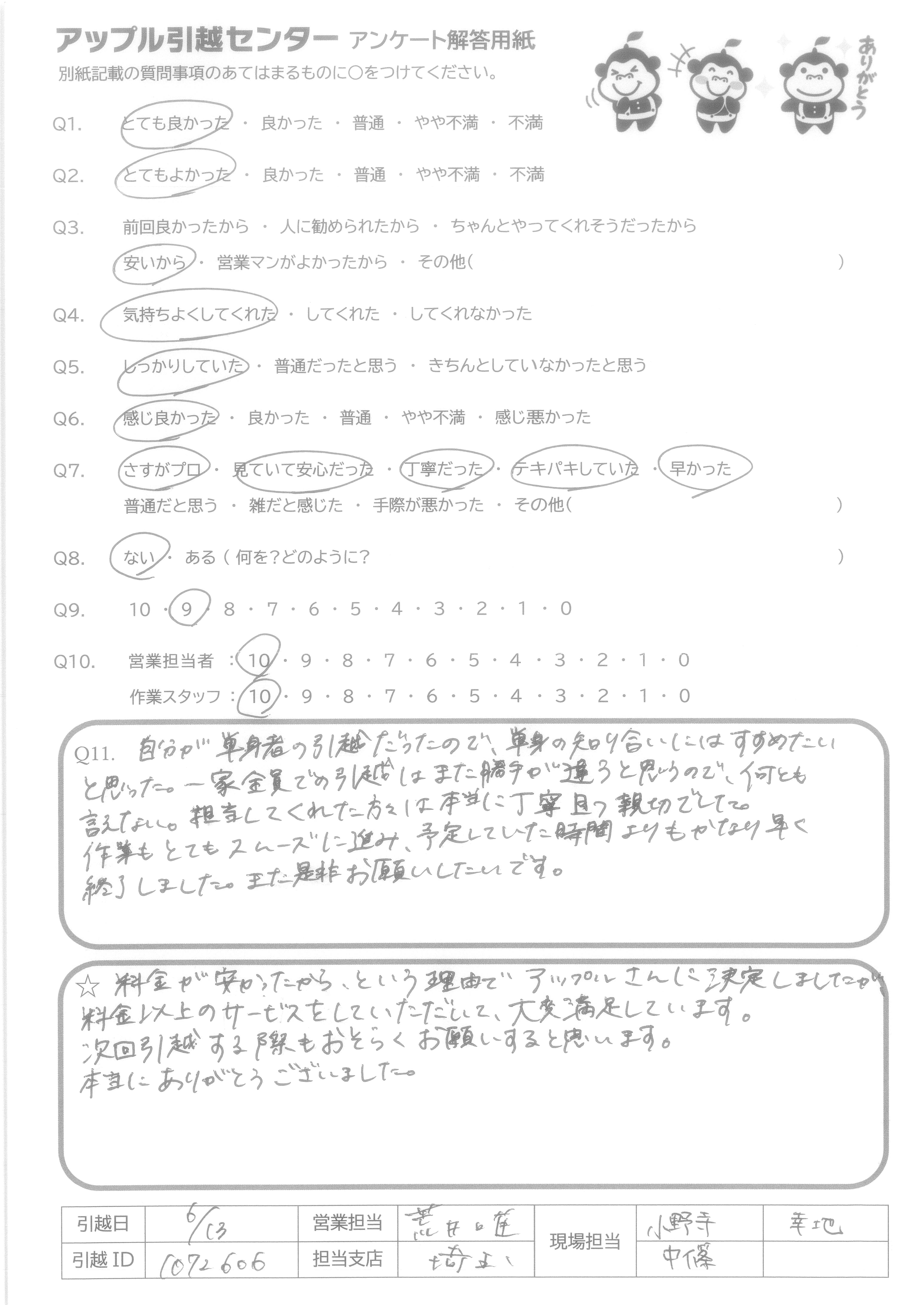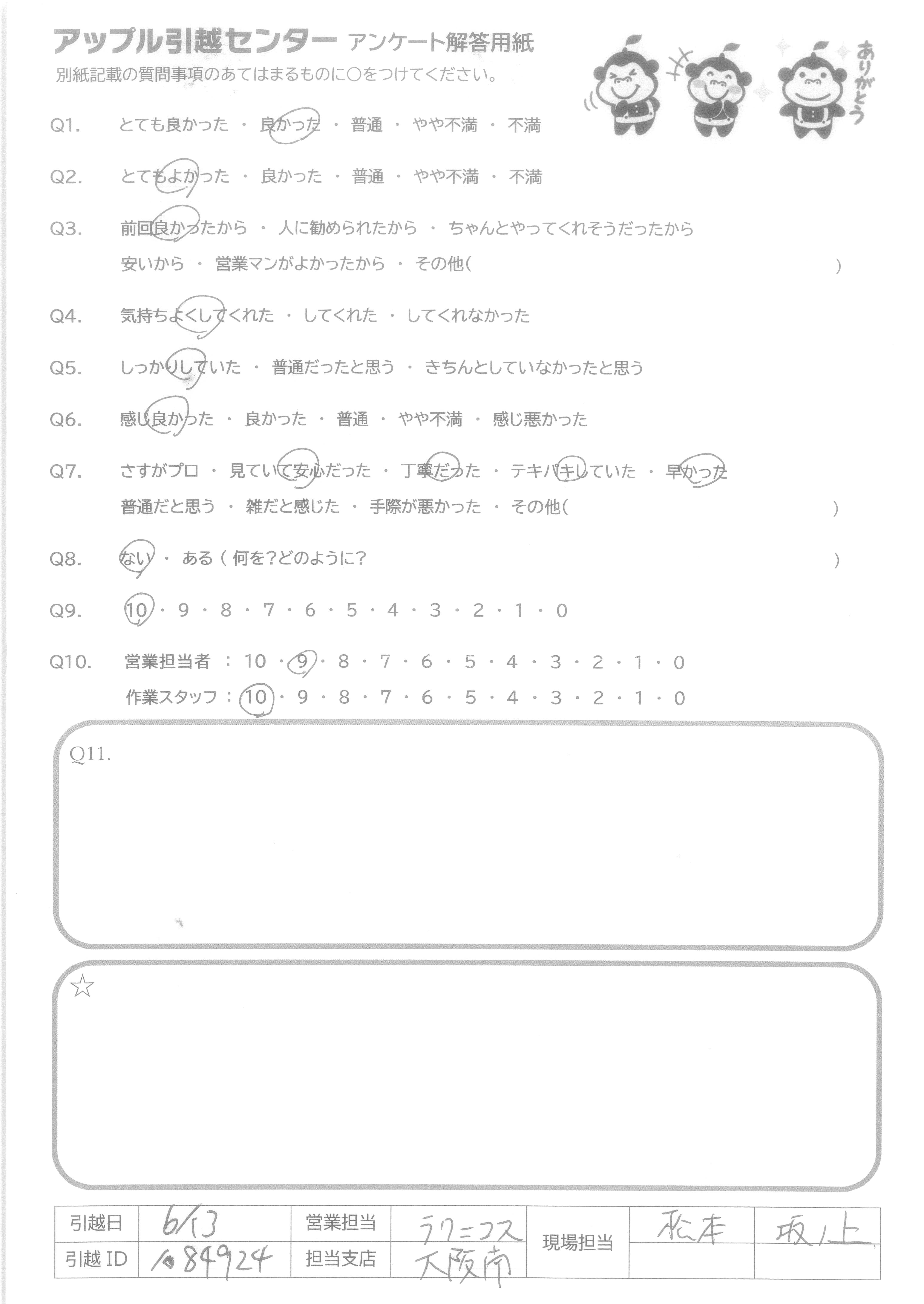 A.料金が安かったから、という理由でアップルさんに決定しましたが、料金以上のサービスをしていただいて、大変満足しています。次回引越する際もおそらくお願いすると思います。 本当にありがとうございました。