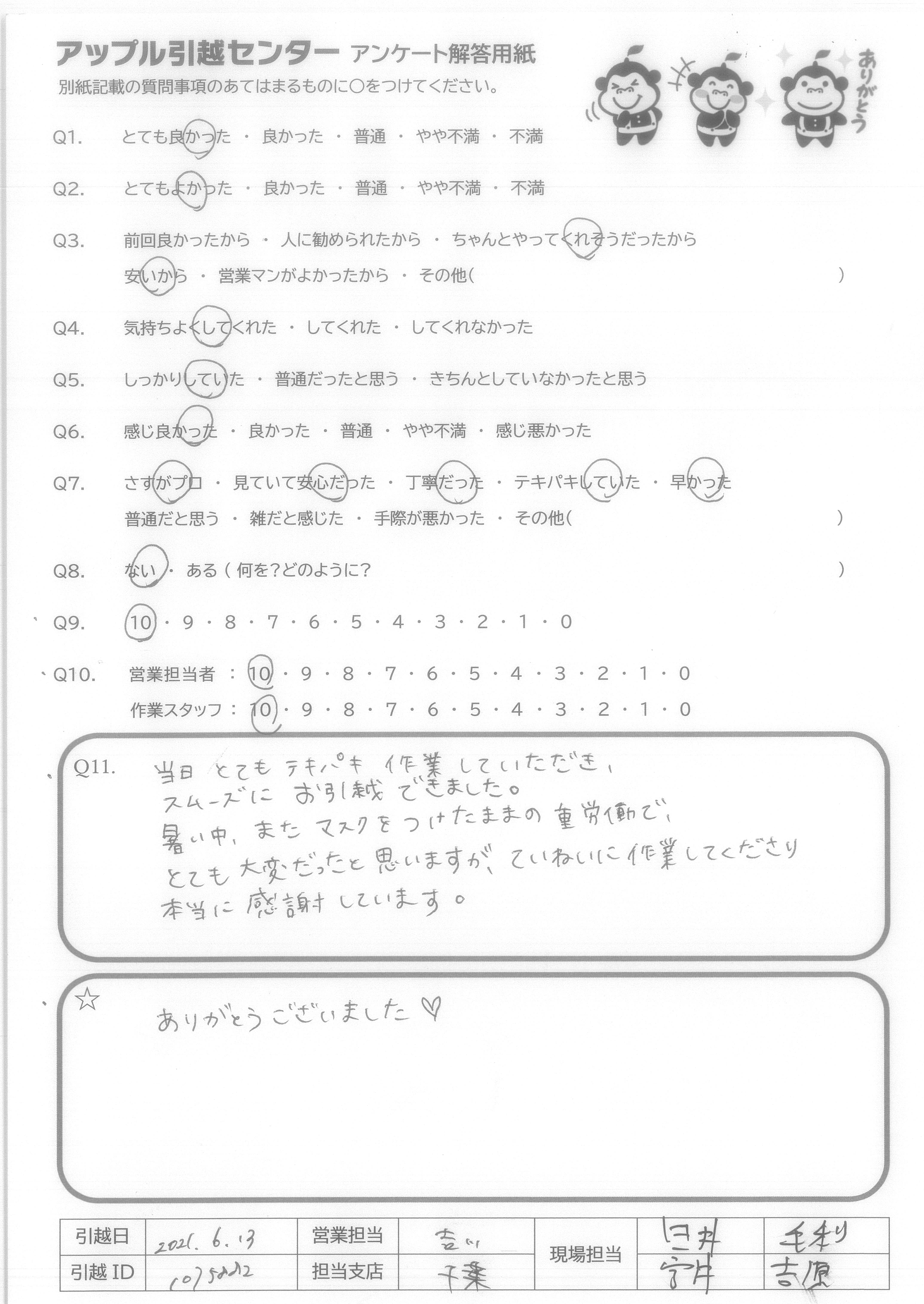 引越し日:2021年06月13日 エリア:千葉県千葉市若葉区