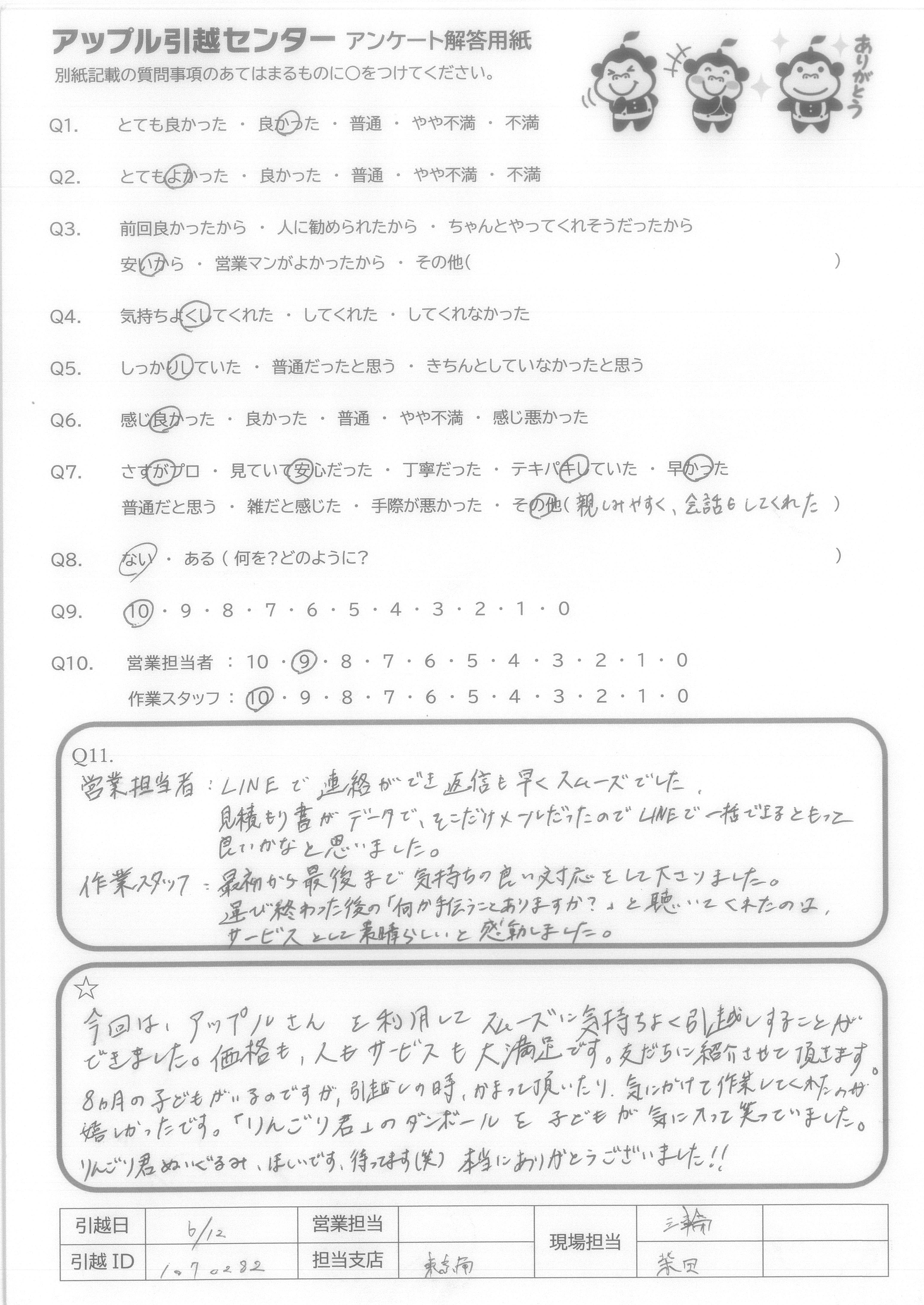 A.今回はアップルさんを利用してスムーズに気持ちよく引っ越しすることができました。価格も、人もサービスも大満足です。友だちに紹介させて頂きます。 8カ月の子どもがいるのですが、引越しの時、かまって頂いたり、気にかけて作業してくれたのが嬉しかったです。「りんごり君」のダンボールを子どもが気に入って笑っていました。 りんごり君ぬいぐるみ、ほしいです。待ってます(笑)本当にありがとうございました!!!