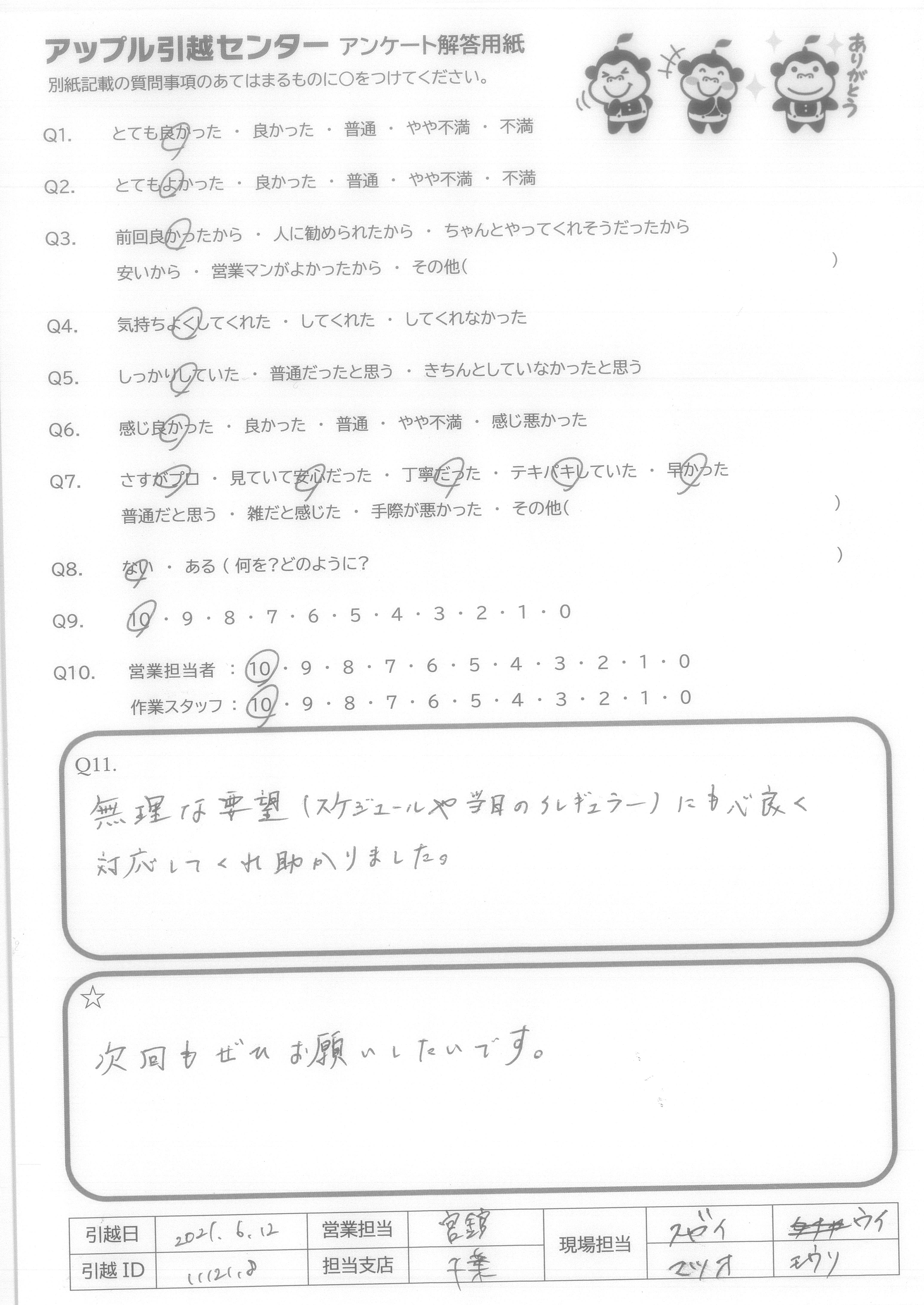 引越し日:2021年06月12日 エリア:千葉県千葉市花見川区