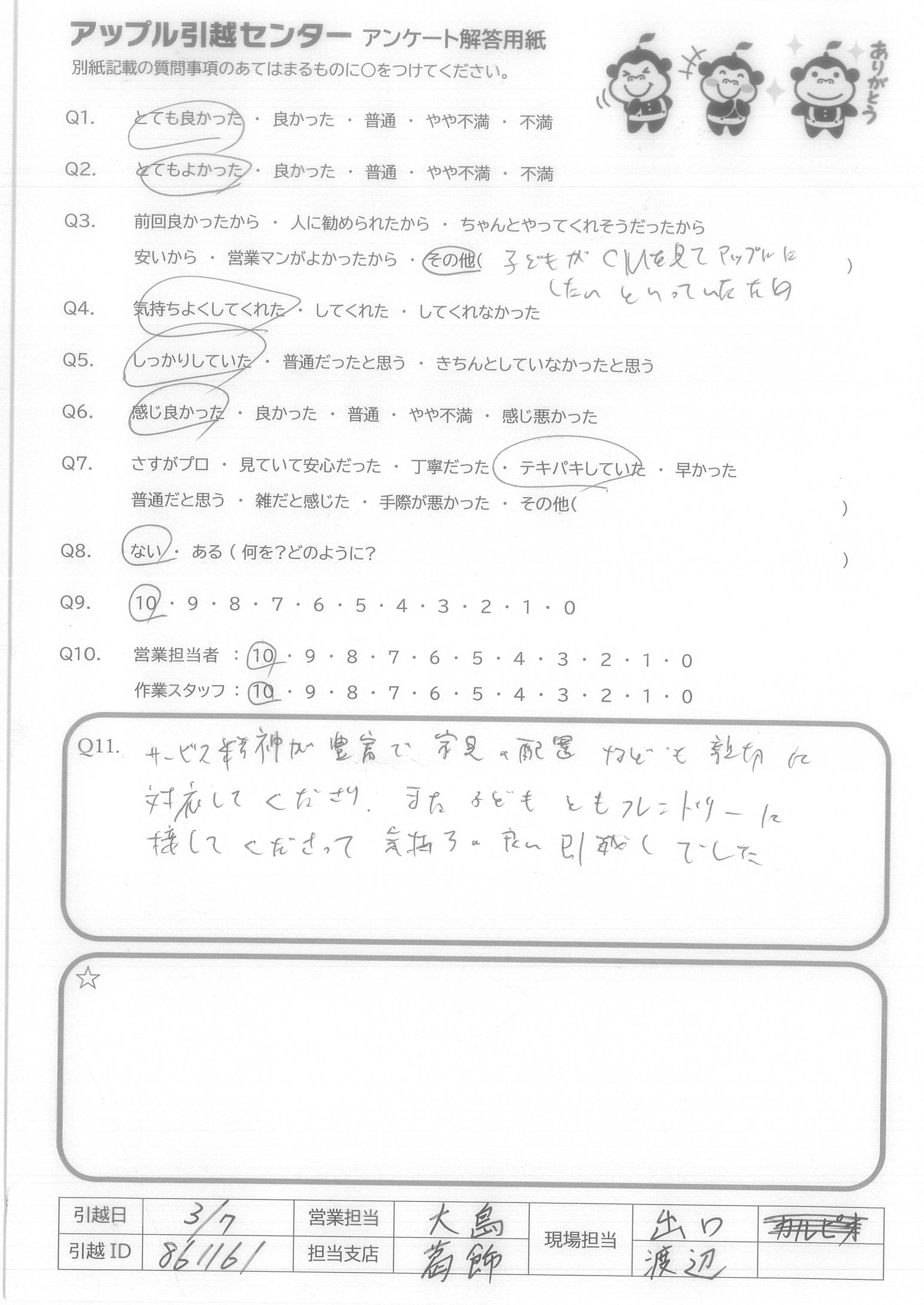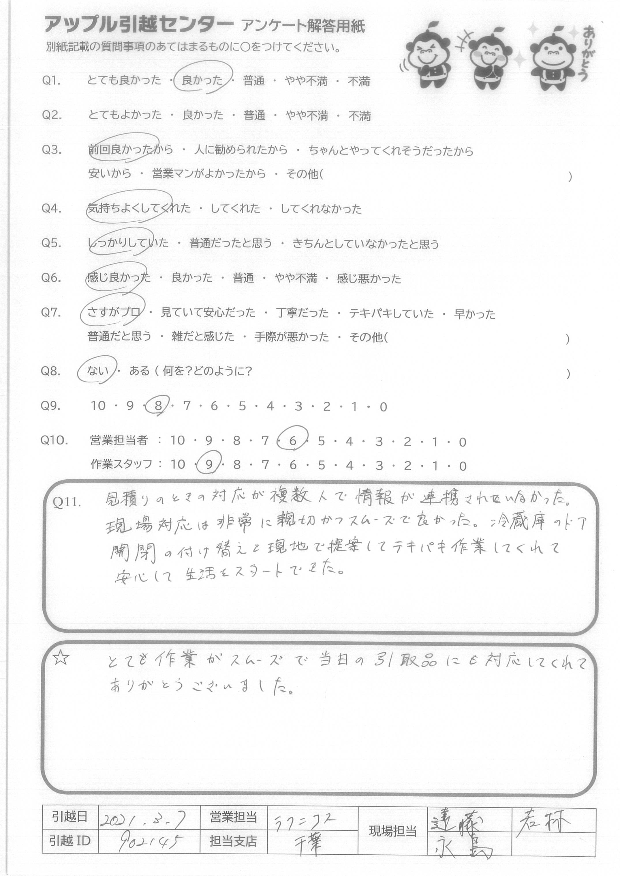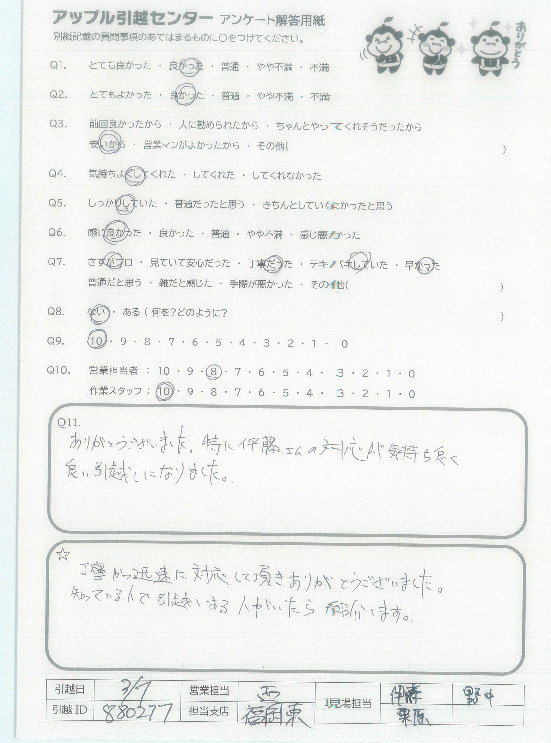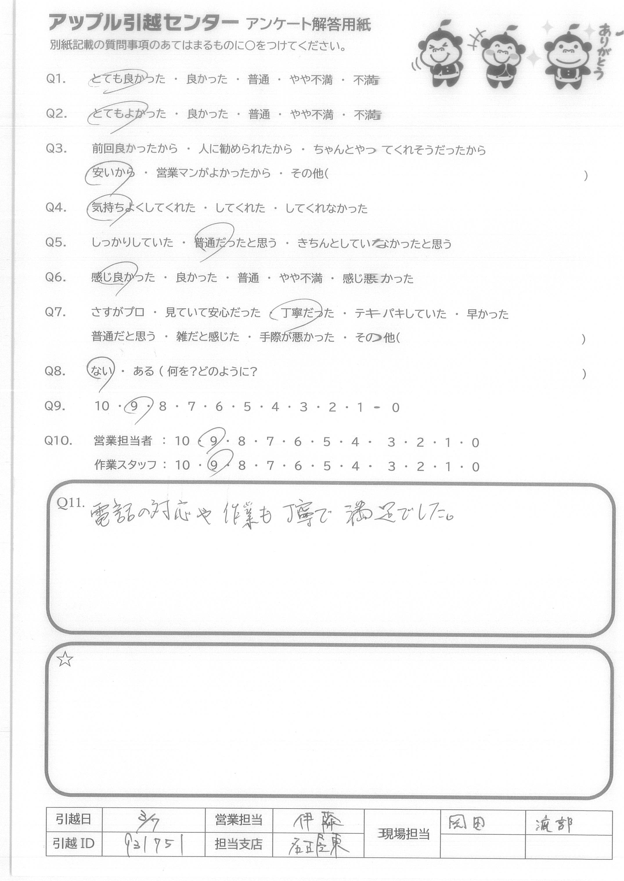 A.ありがとうございました。特に伊藤さんの対応が気持ち良く良い引越しになりました。