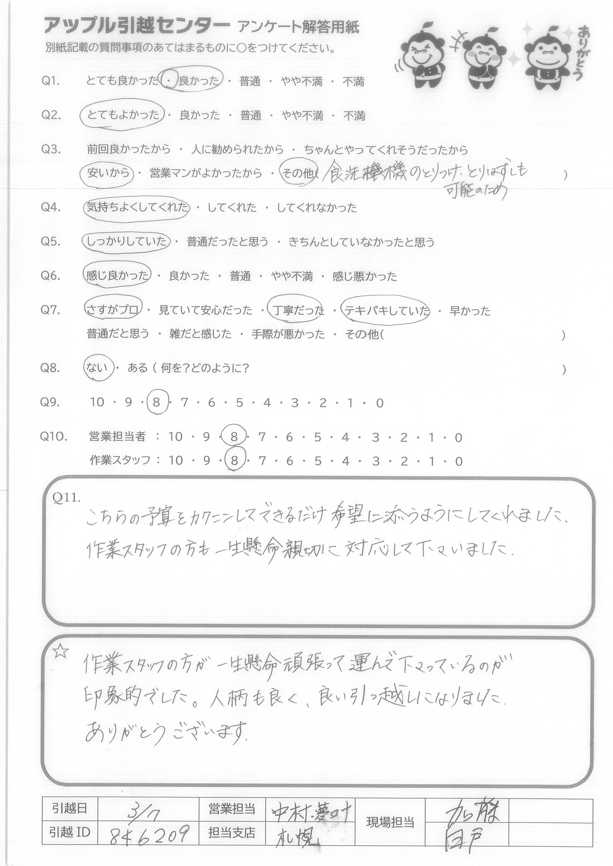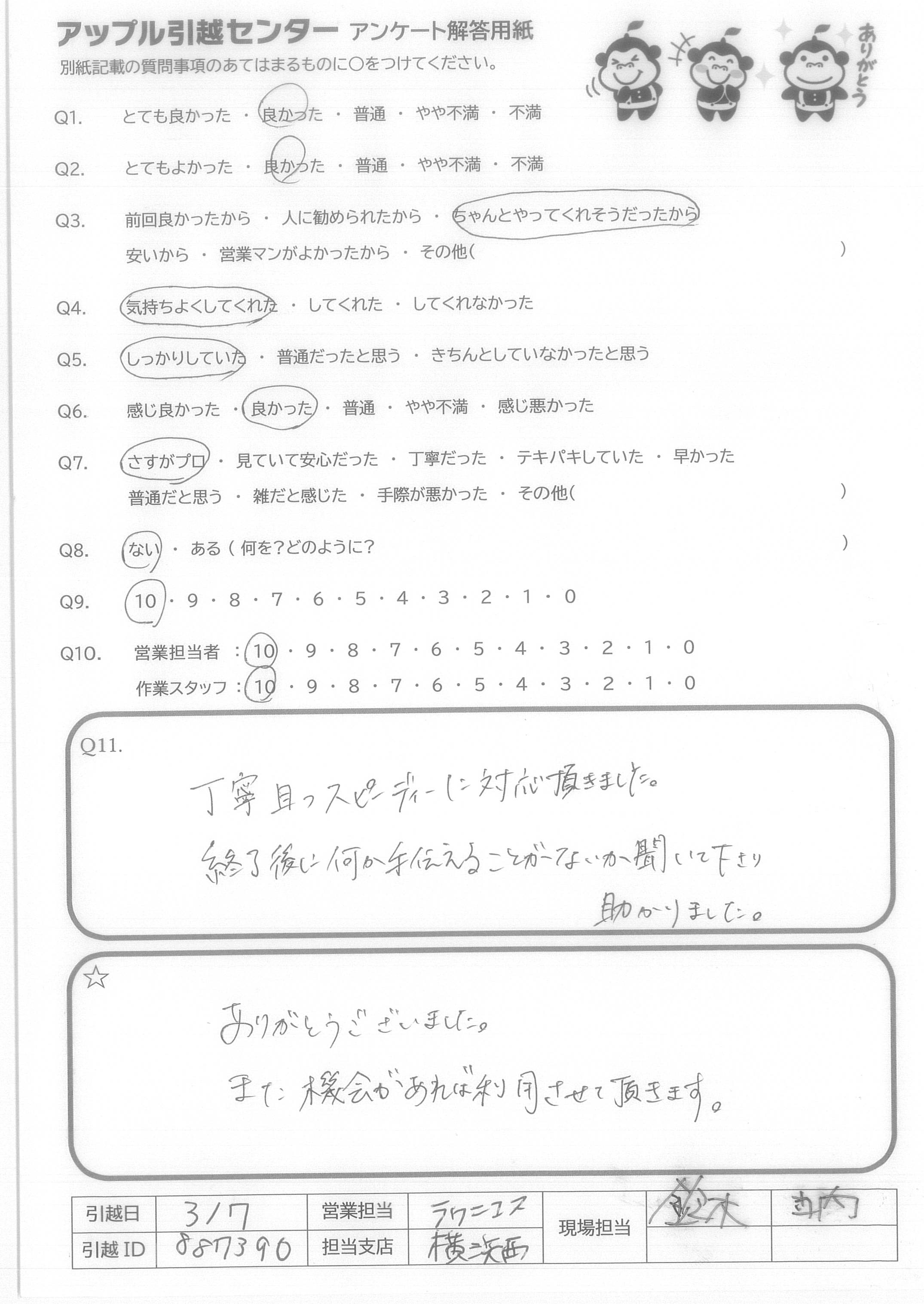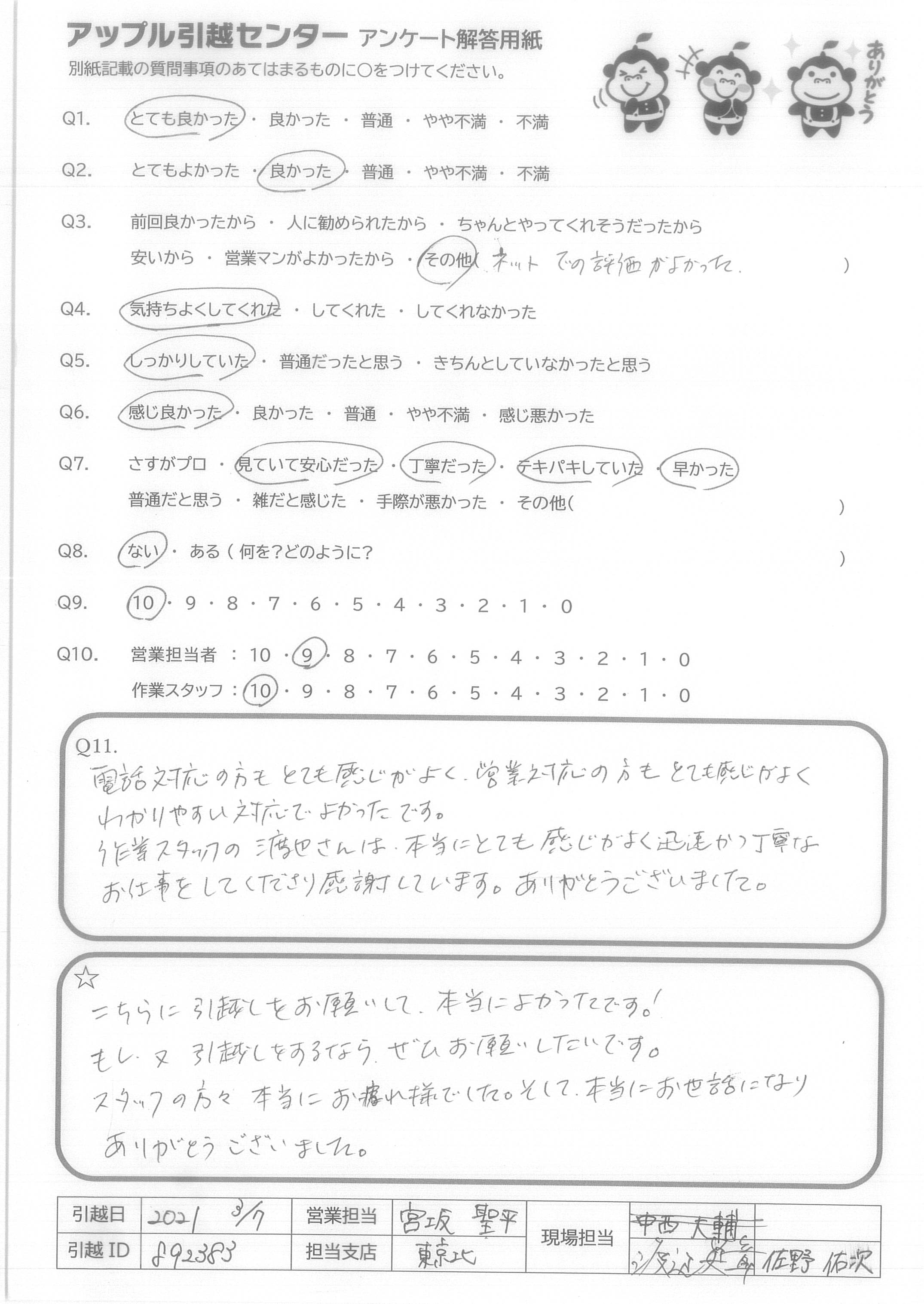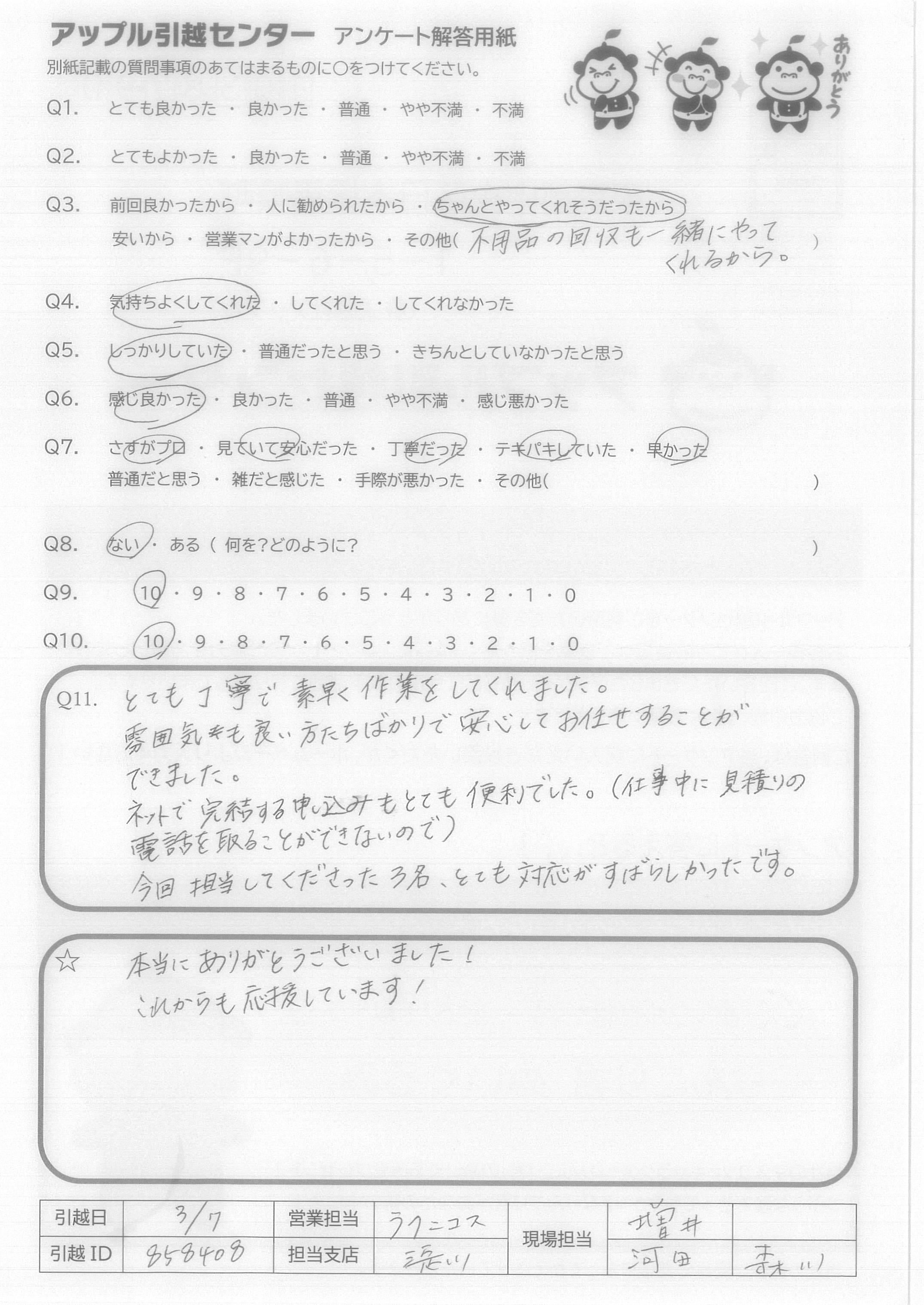 A.ありがとうございました。特に伊藤さんの対応が気持ち良く良い引越しになりました。