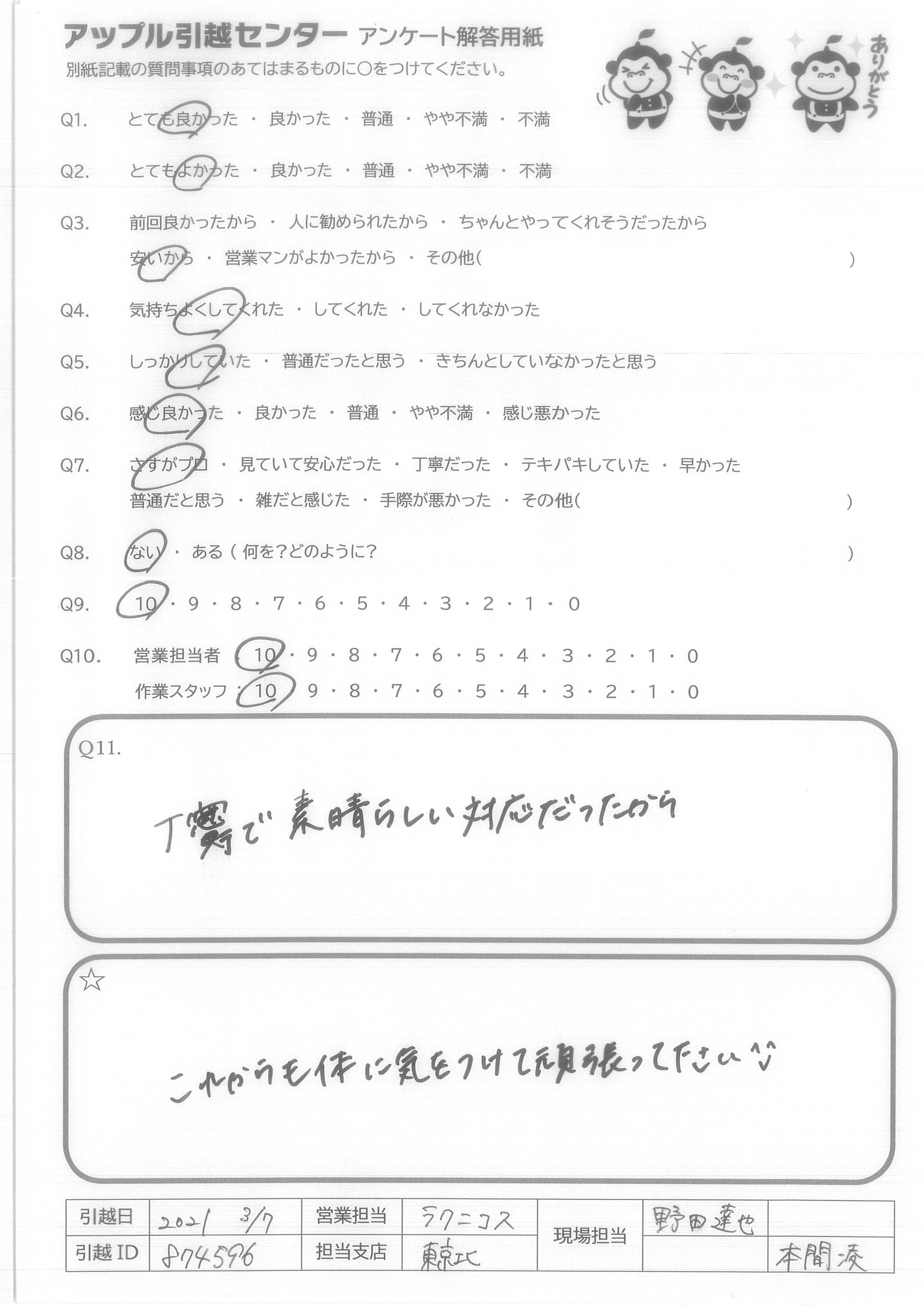 A.丁寧かつ迅速に対応して頂きありがとうございました。知ってる人で引越しする人がいたら紹介します。