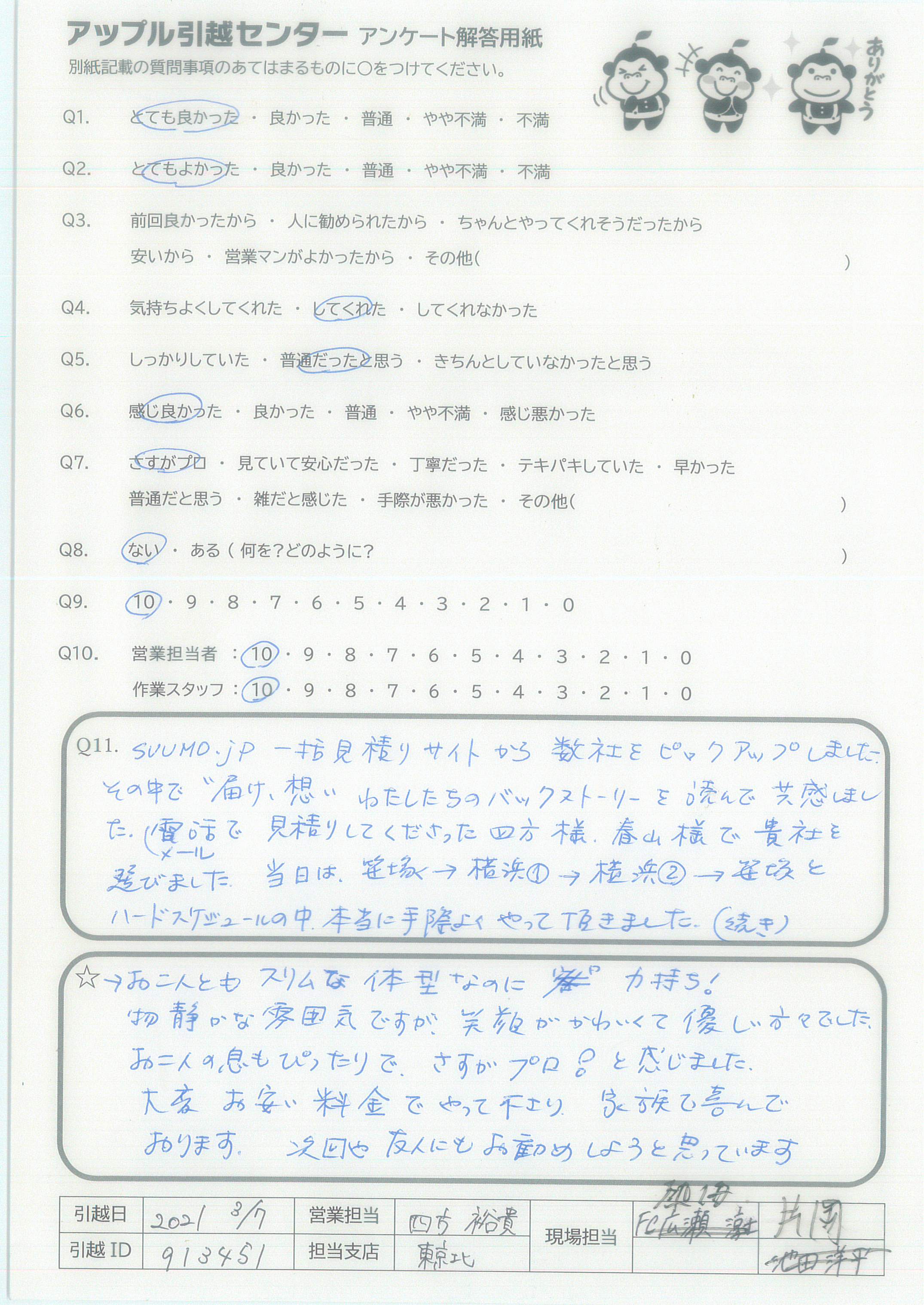 A.SUUMO.jp一括見積りサイトから数社をピックアップしました。その中で”届け、想い わたしたちのバックストーリーを呼んで共感しました。(電話で見積りしてくださった四方様、春山様で貴社を選びました。当日は笹塚→横浜1→横浜2→笹塚とハードスケジュールの中、本当に手際よくやって頂きました。(続き)