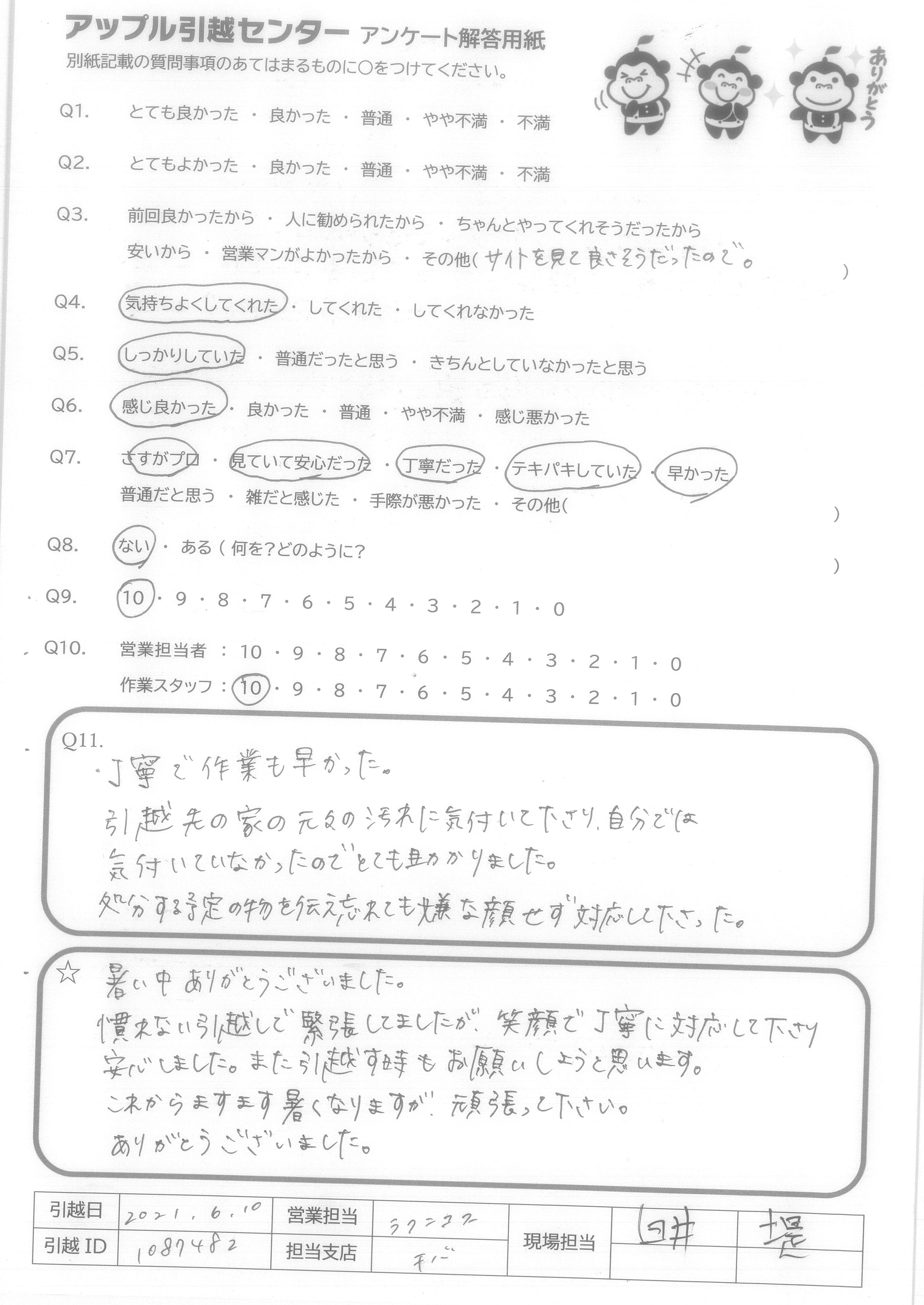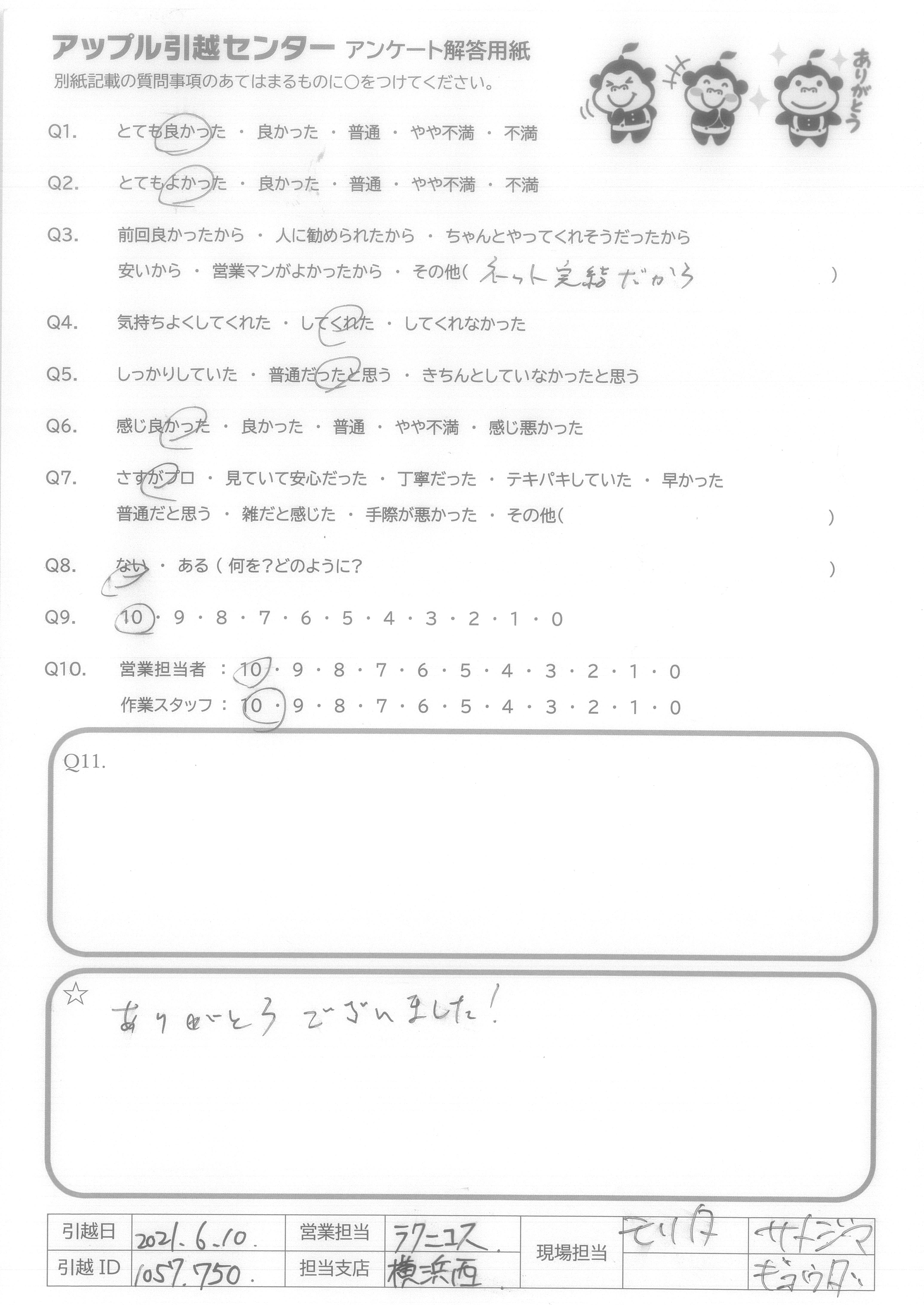 引越し日:2021年06月10日 エリア:神奈川県横浜市港北区