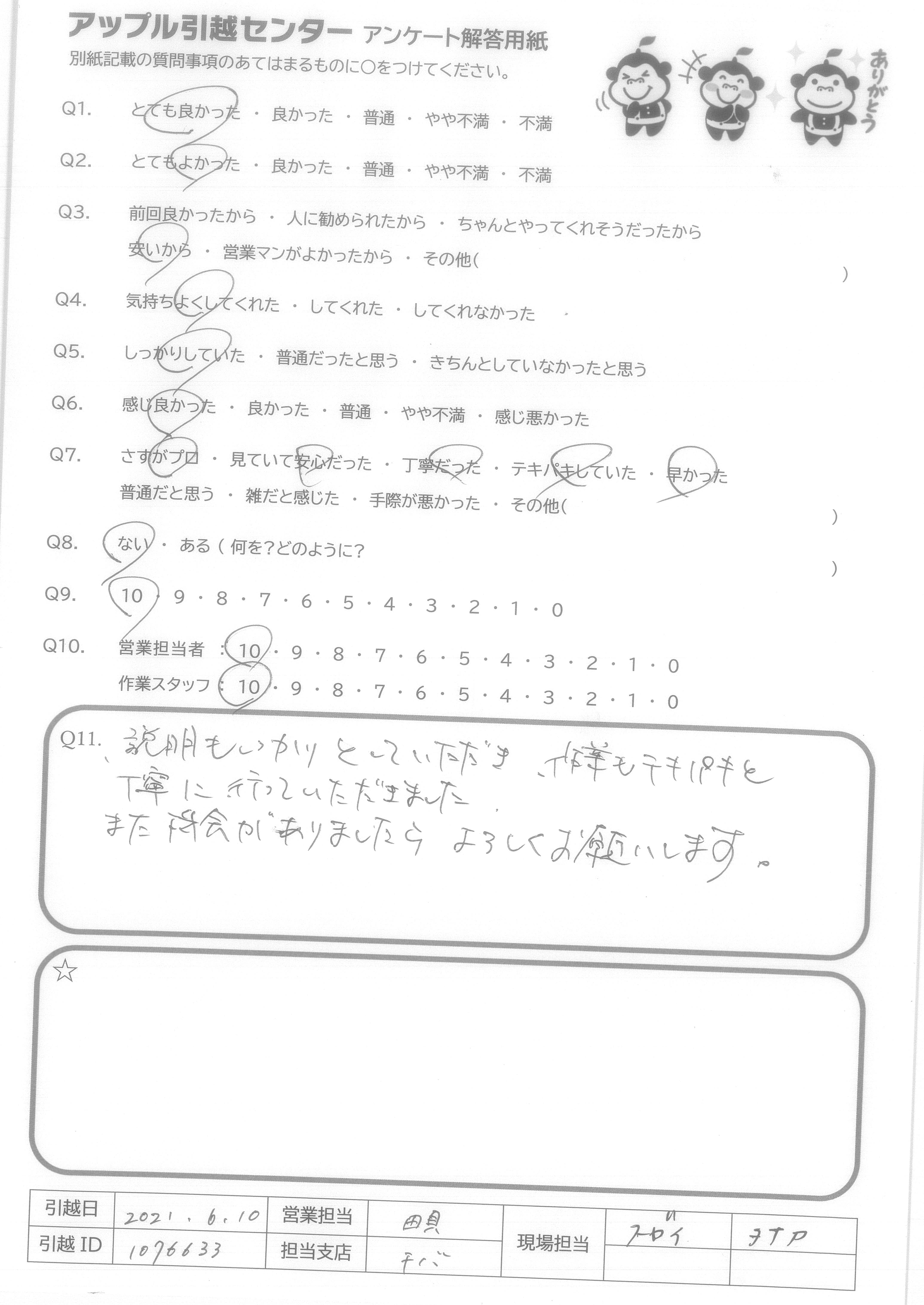 A.説明もしっかりとしていただき、作業もテキパキと丁寧に行っていただきました。また機会がありましたらよろしくお願いします。