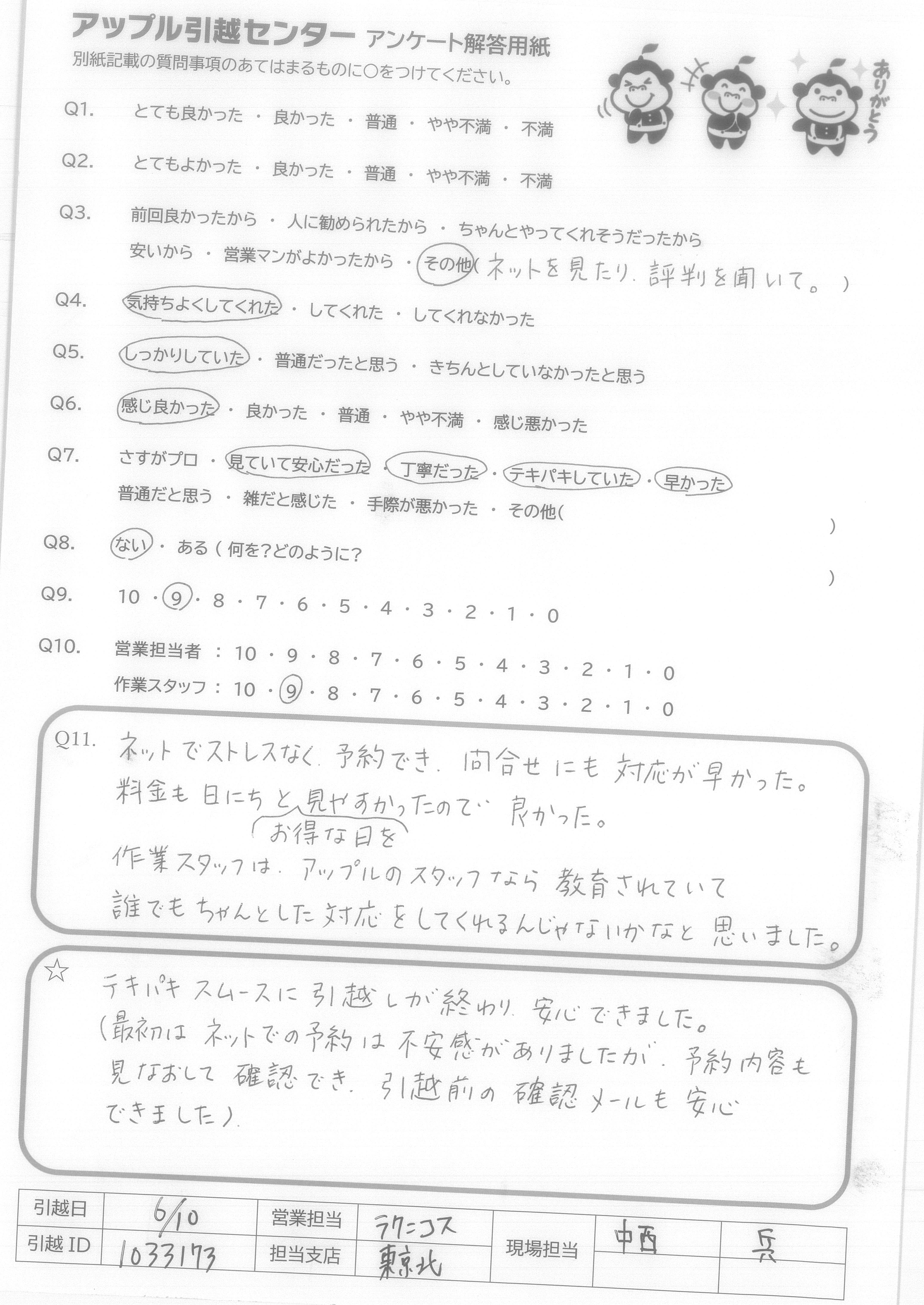 A.テキパキスムーズに引越しが終わり安心できました。 (最初はネットでの予約は不安感がありましたが、予約内容も見なおして確認でき、引越前の確認メールも安心できました。)