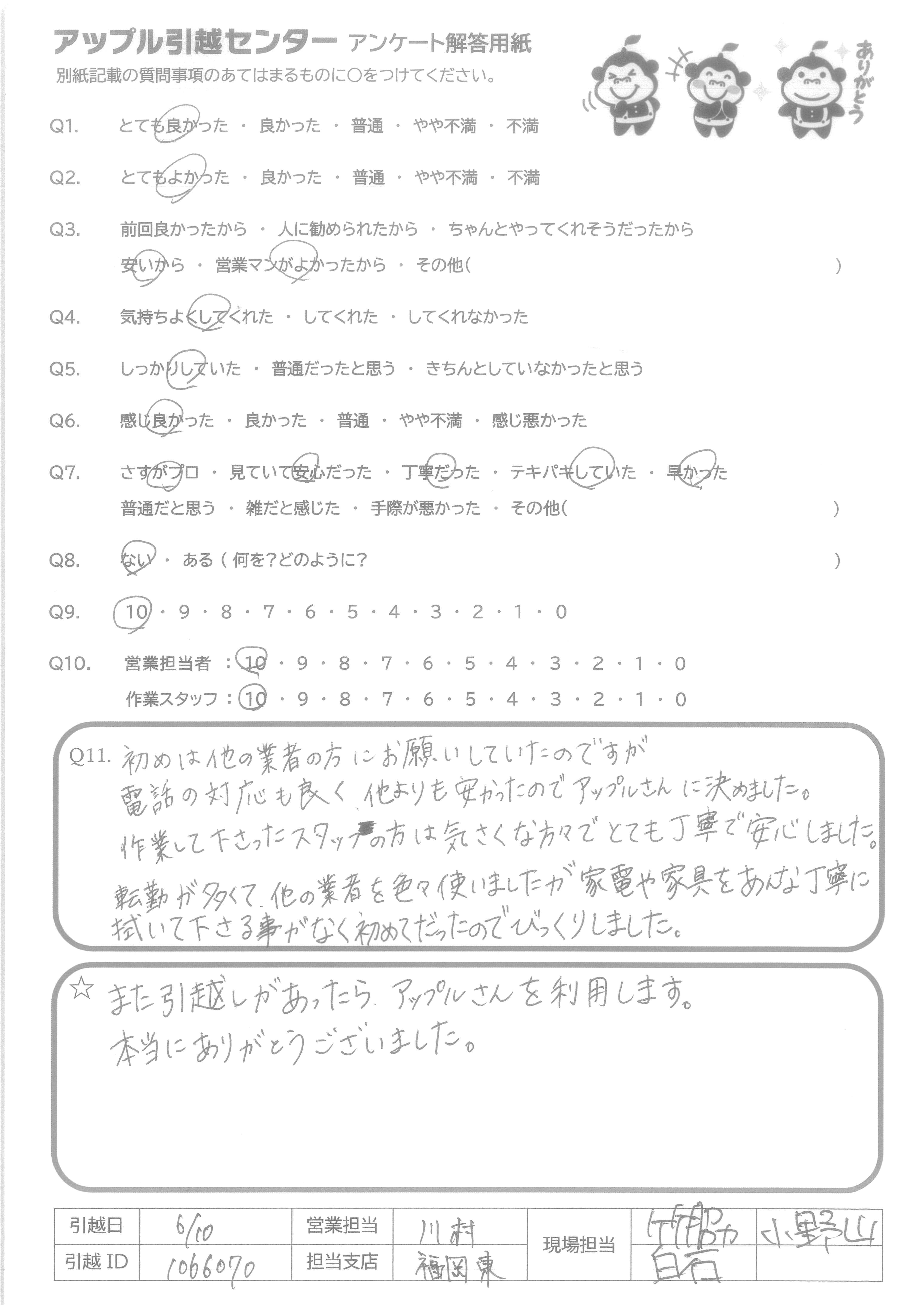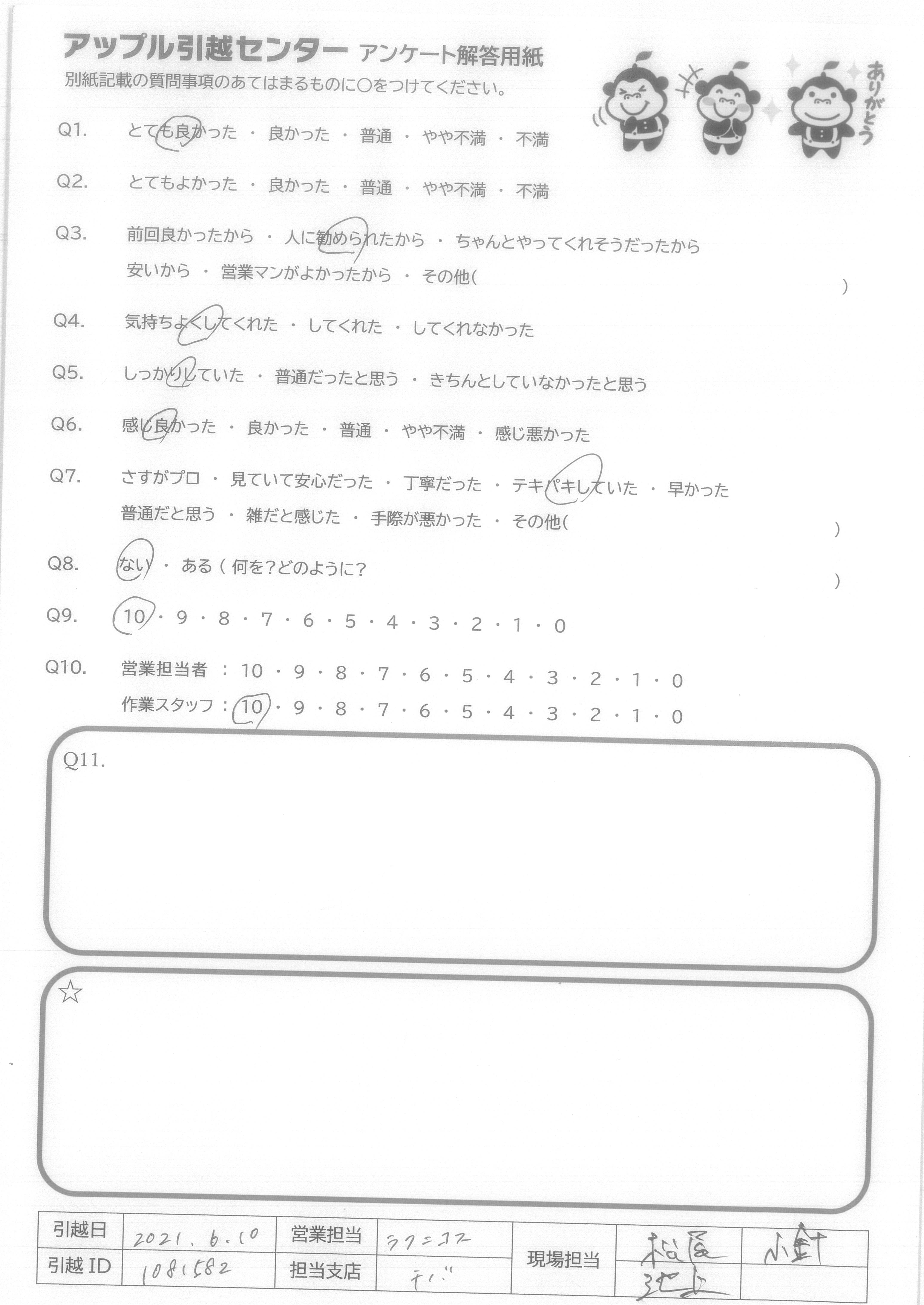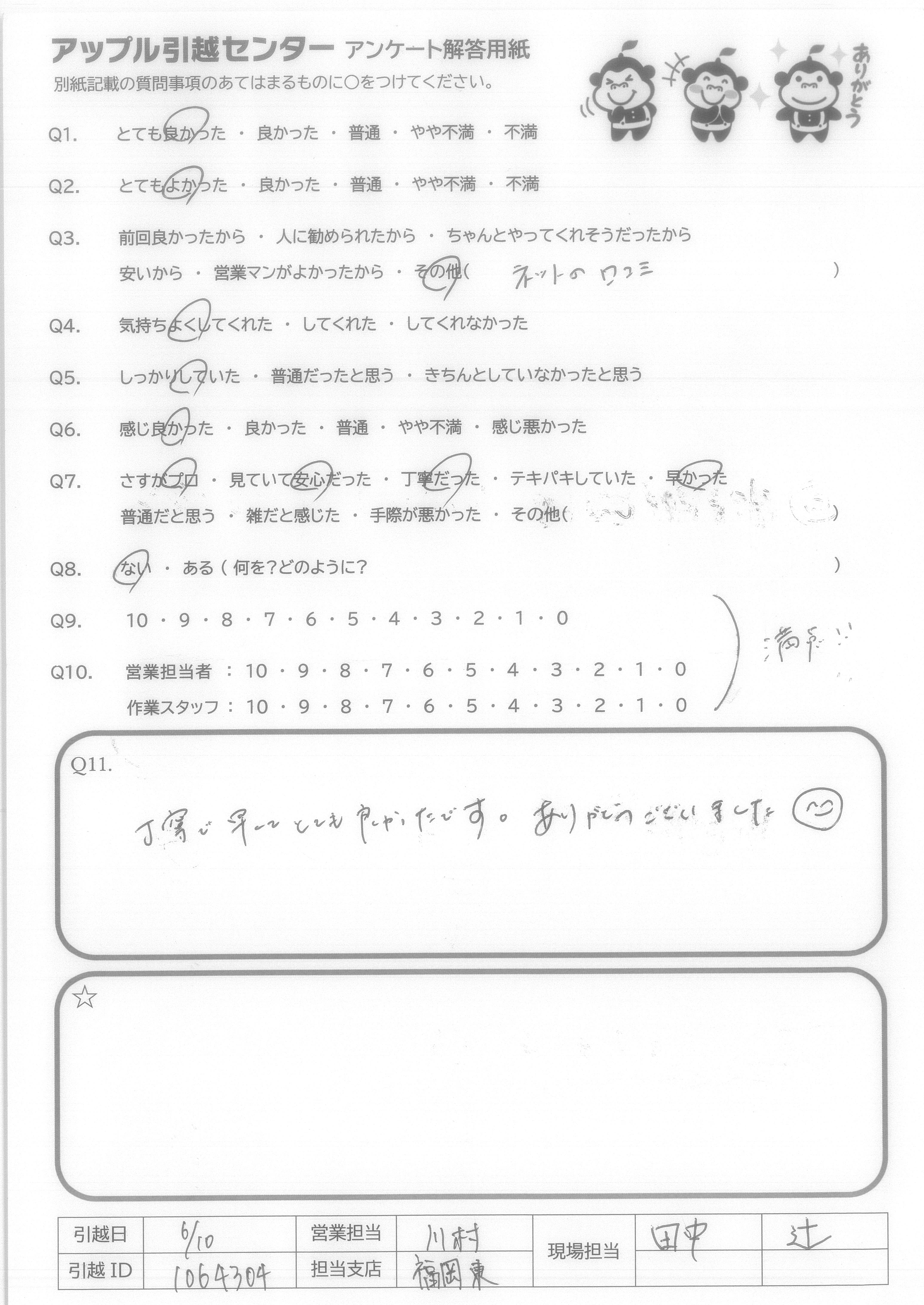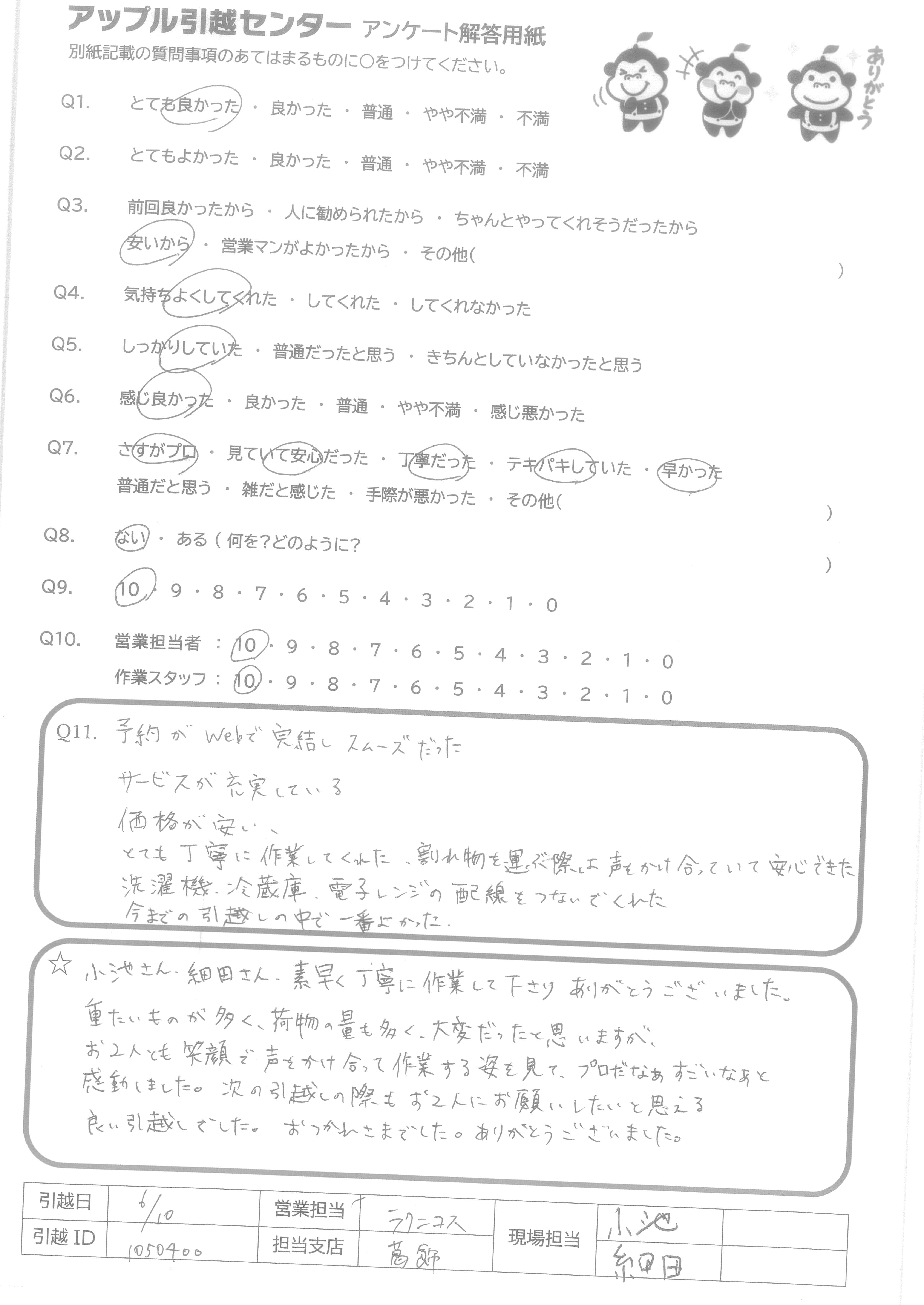 A.小池さん、細田さん、素早く丁寧に作業して下さりありがとうございました。 重たいものが多く、荷物の量も多く、大変だったと思いますが、 お2人とも笑顔で声をかけ合って作業する姿を見て、プロだなあすごいなあと感動しました。次の引越しの際もお2人にお願いしたいと思える良い引越しでした。おつかれさまでした。ありがとうございました。