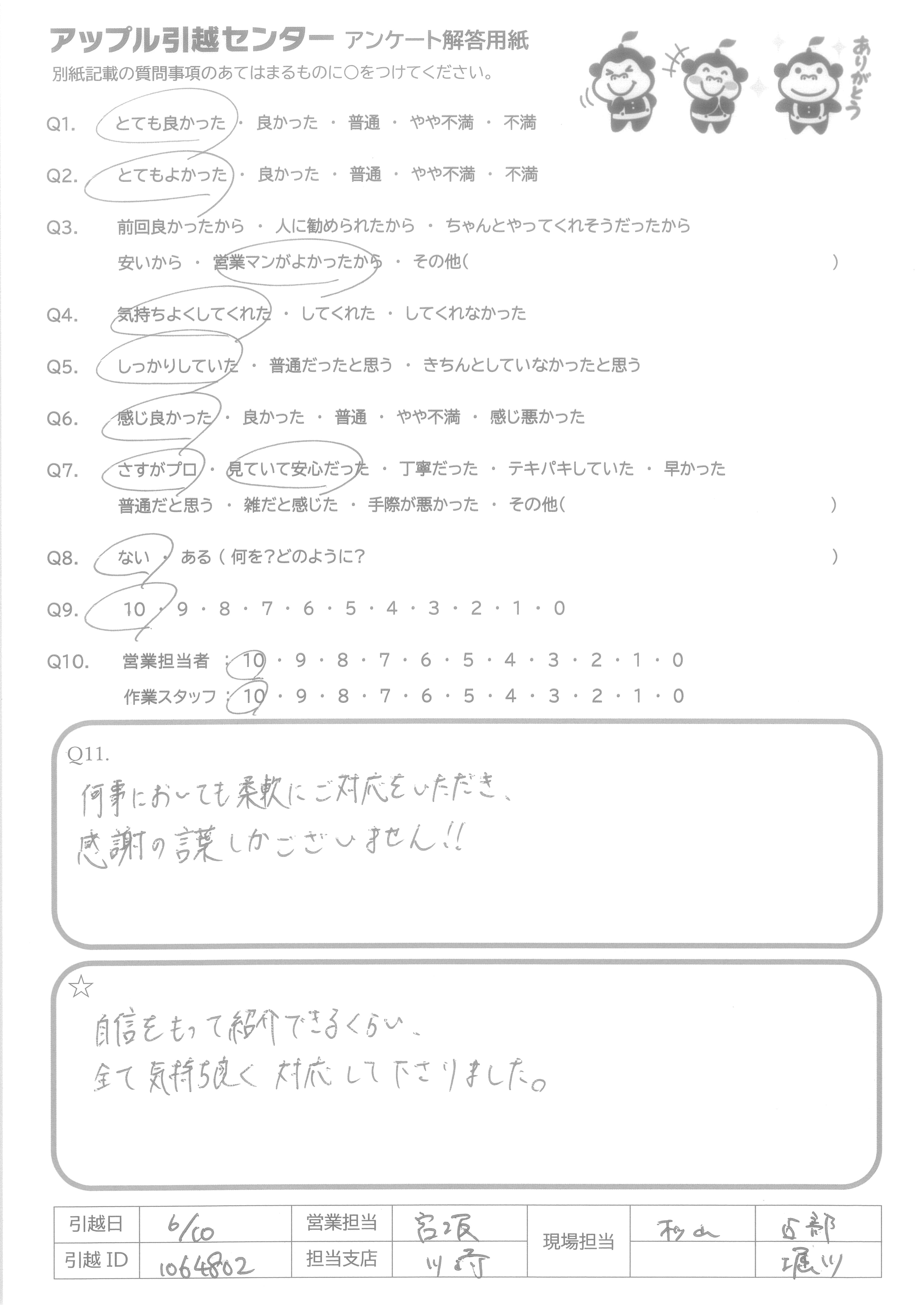 A.引越ということが私としては、初めてのことだったので、始まるまでは心配していましたが、皆さんがスピーディーにテキパキと作業していただいたので、安心してまかせることができました。次回もまた、お願いしたいと思っています。
