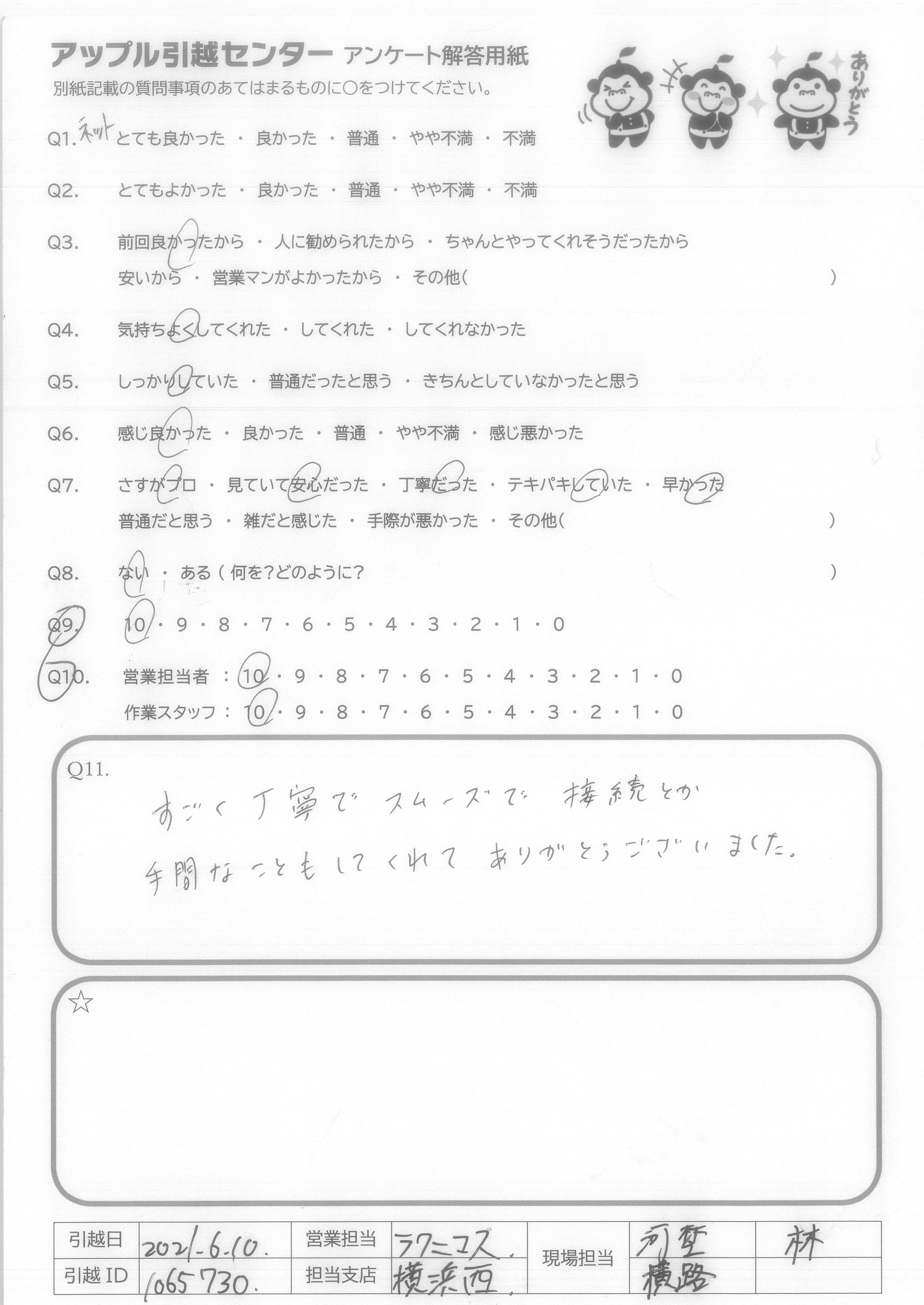 A.すごく丁寧でスムーズで接続とか手間なこともしてくれてありがとうございました。