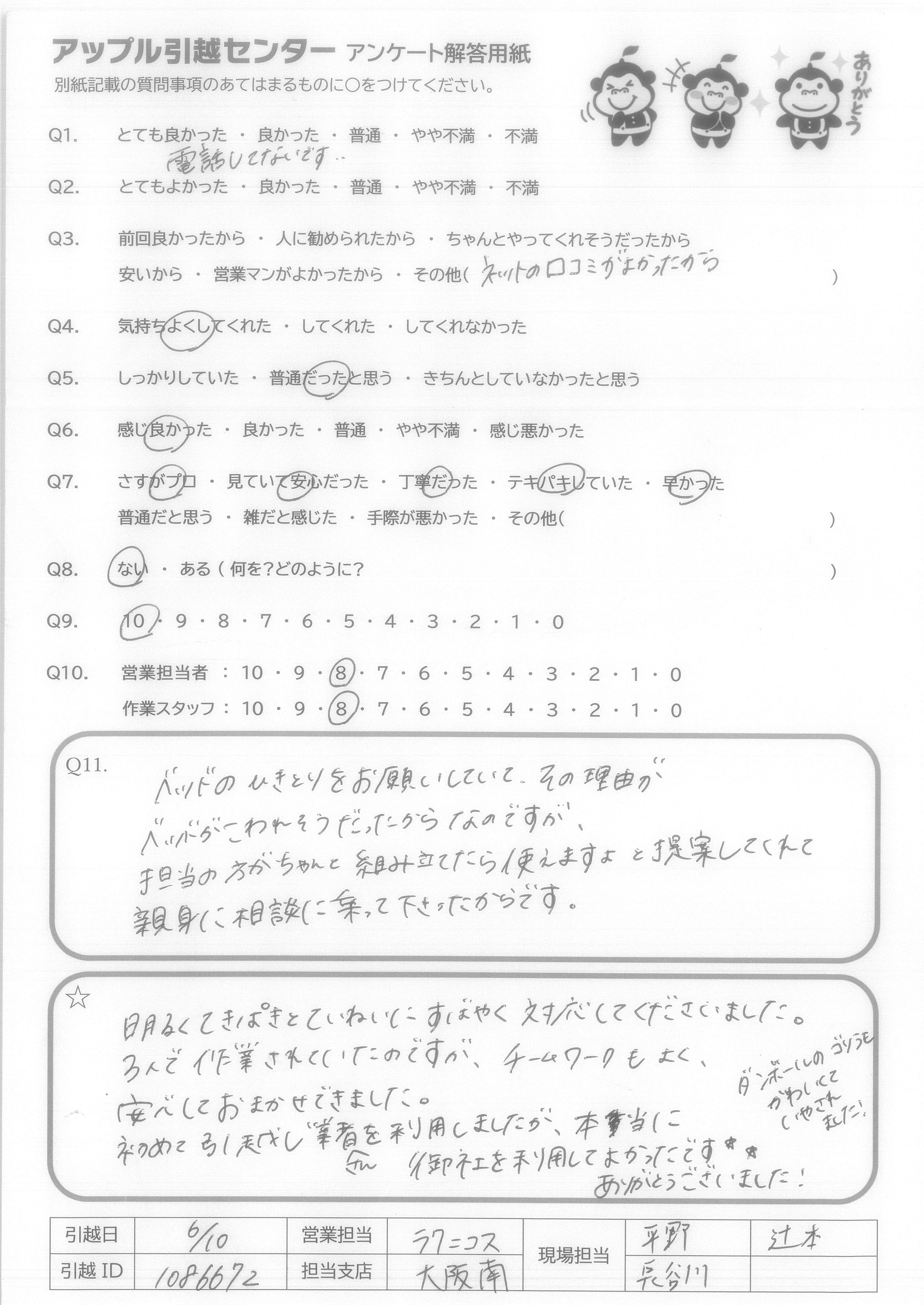 A.営業担当の方は見積りも早く内容も分かり易かったです。 作業スタッフの森田さんは主に説明や運び出しを行ってくれましたが、丁寧で感じが良かったです。運び出しの手伝いをしてくれた方もお声掛けいただけたり良かったのですが、下で積み込み作業されていた方は最後まであいさつも無く、そこだけ残念だったかなと思います!!