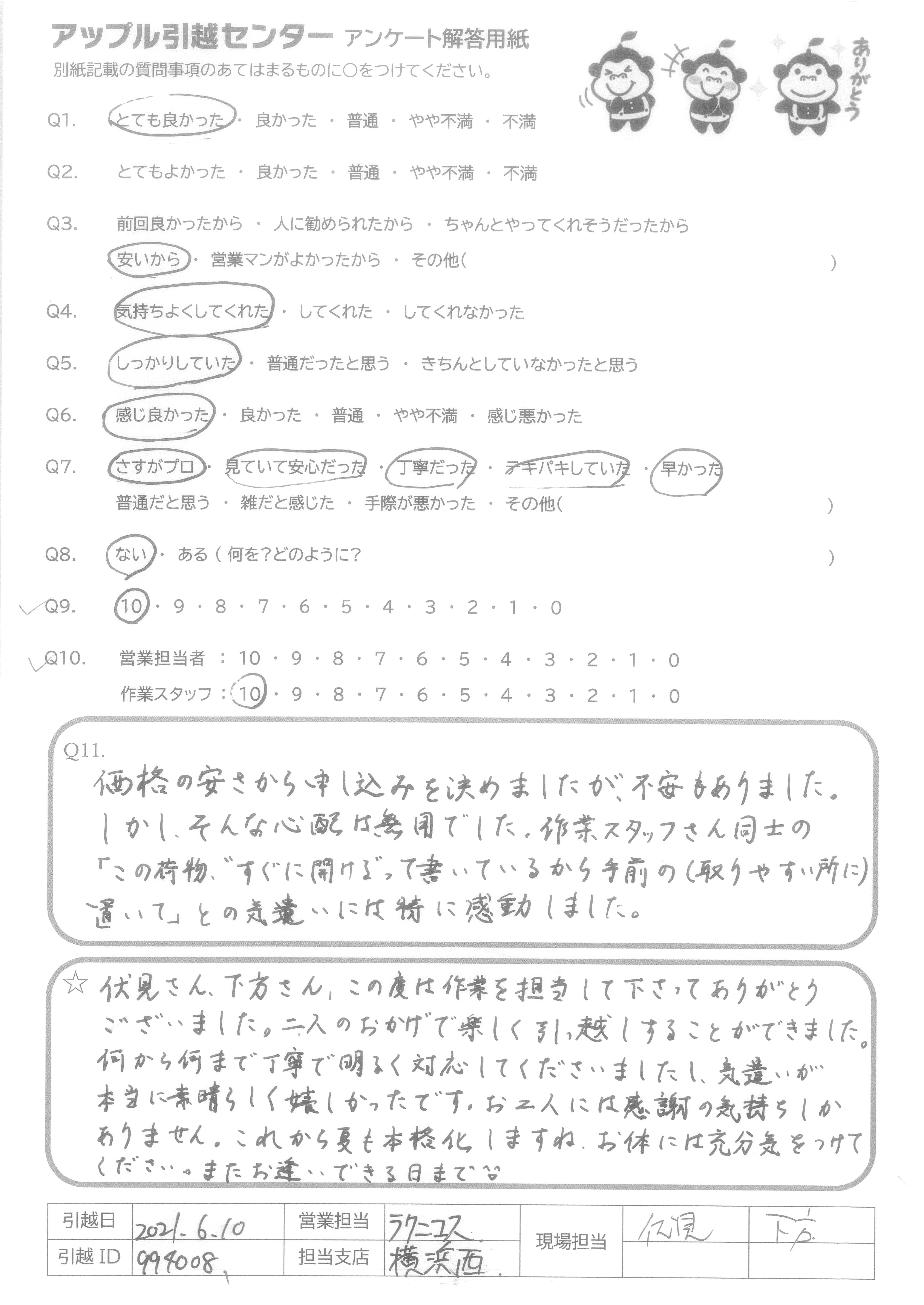 A.伏見さん、下方さん、この度は作業を担当して下さってありがとうございました二人のおかげで楽しく引っ越しすることができました。 何から何まで丁寧で明るく対応してくださいましたし、気遣いが本当に素晴らしく嬉しかったです。お二人には感謝の気持ちしかありません。これから夏も本格化しますね。お体には充分気をつけてください。またお逢いできる日まで^^