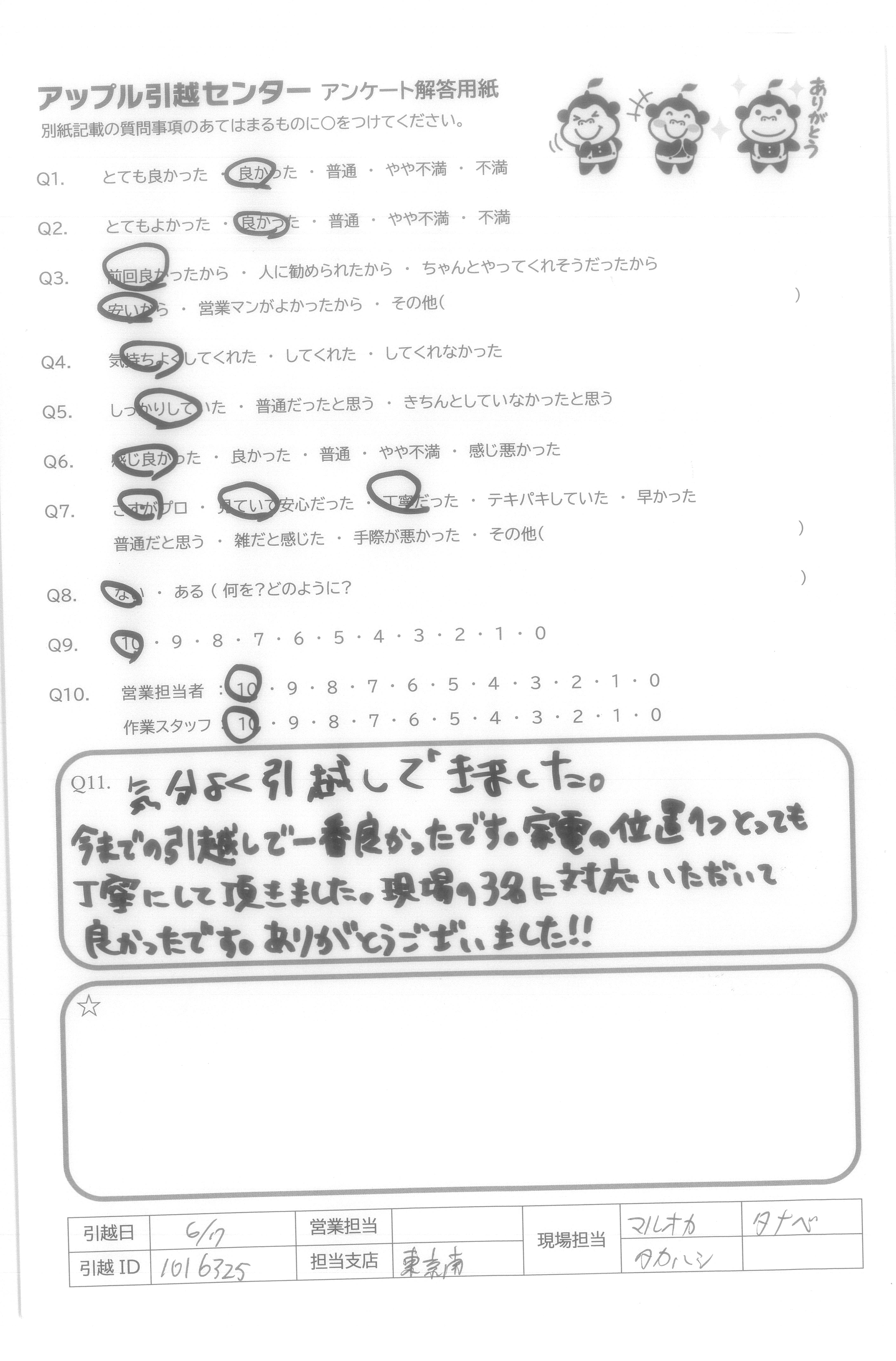 A.電話の受け付の時も感じが良く、ダンボールもすぐに送ってくれて対応が良いので友人にも引っ越はアップルをおすすめしたいです!作業スタッフの方はテキパキしていて、丁寧でとても良かったです。