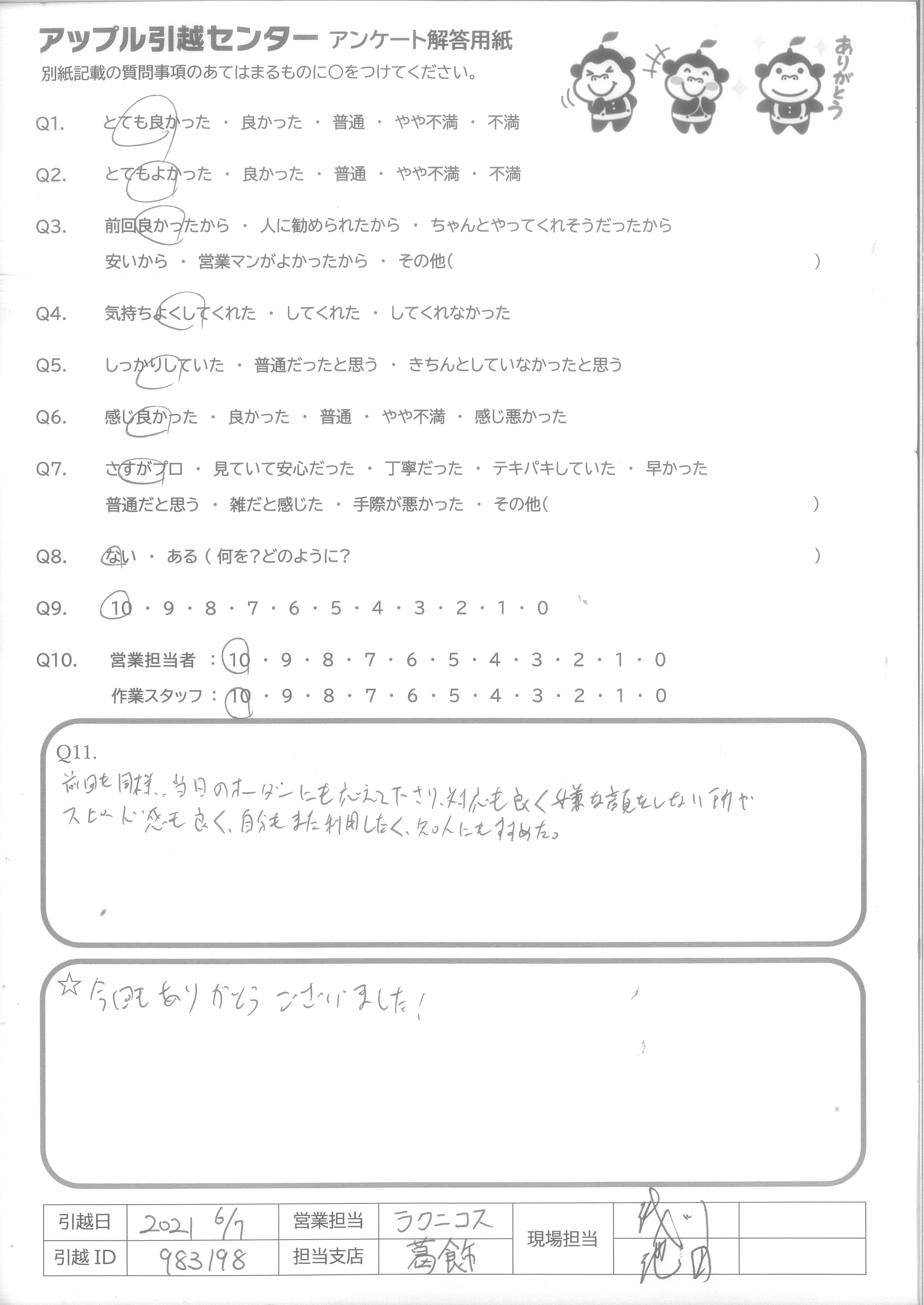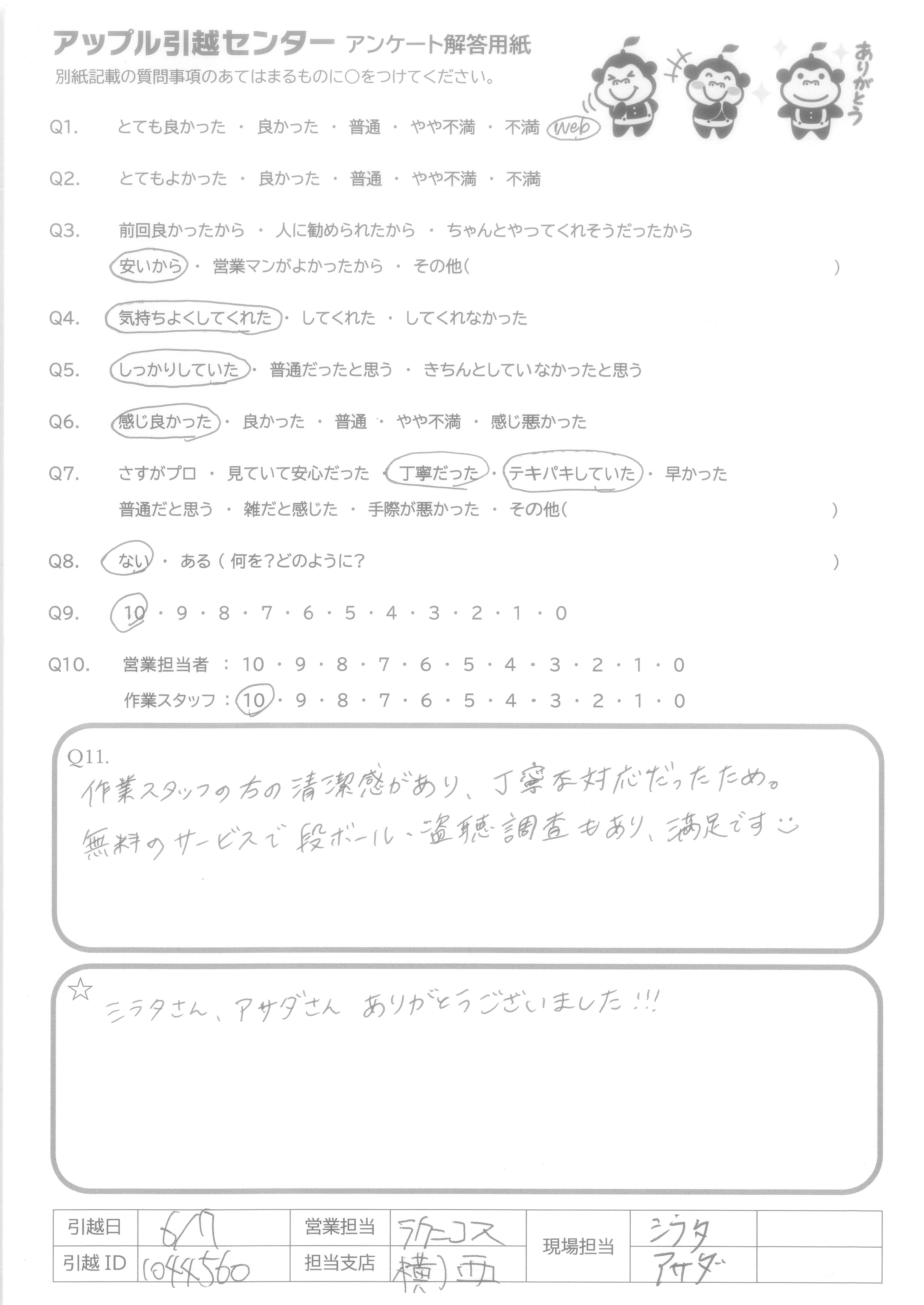 A.気分よく引越しできました。 今までの引越しで一番良かったです。家電の位置1つとっても丁寧にして頂きました。現場の3名に対応いただいて良かったです。ありがとうございました!!!