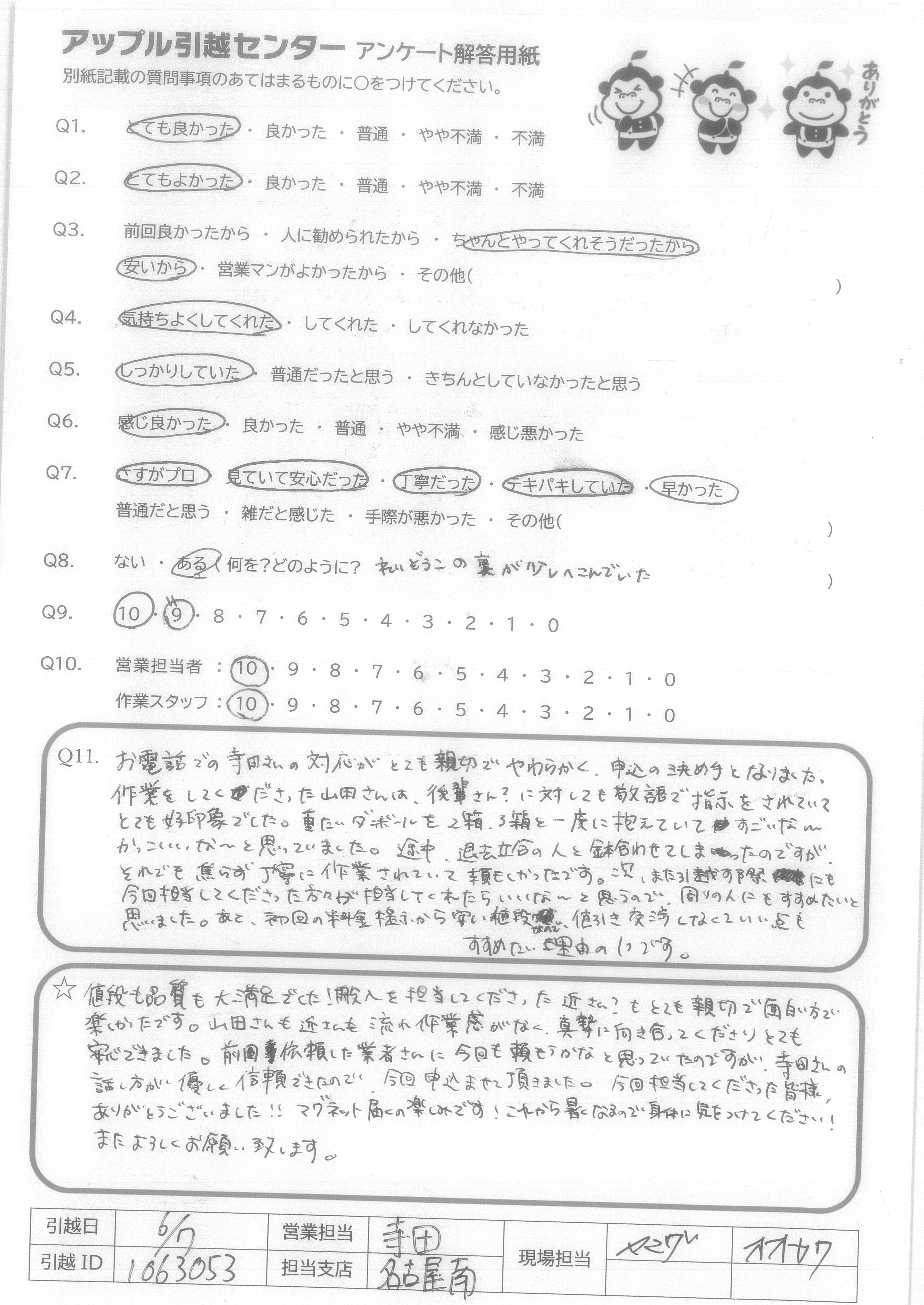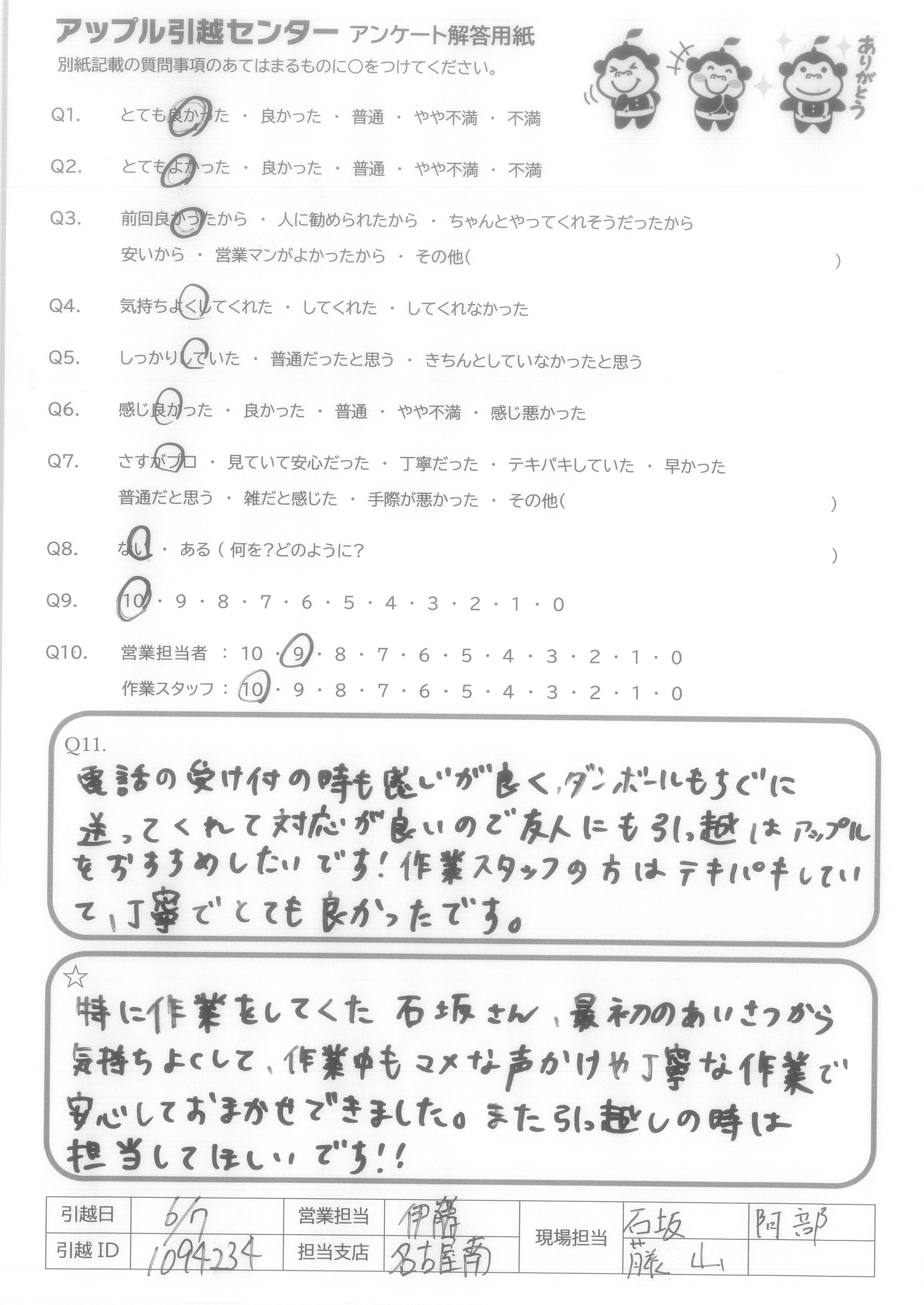 A.特に作業をしてくれた石坂さん、最初のあいさつから気持ちよくして、作業中もマメな声かけや丁寧な作業で安心しておまかせできました。また引っ越しの時は担当してほしいです!!