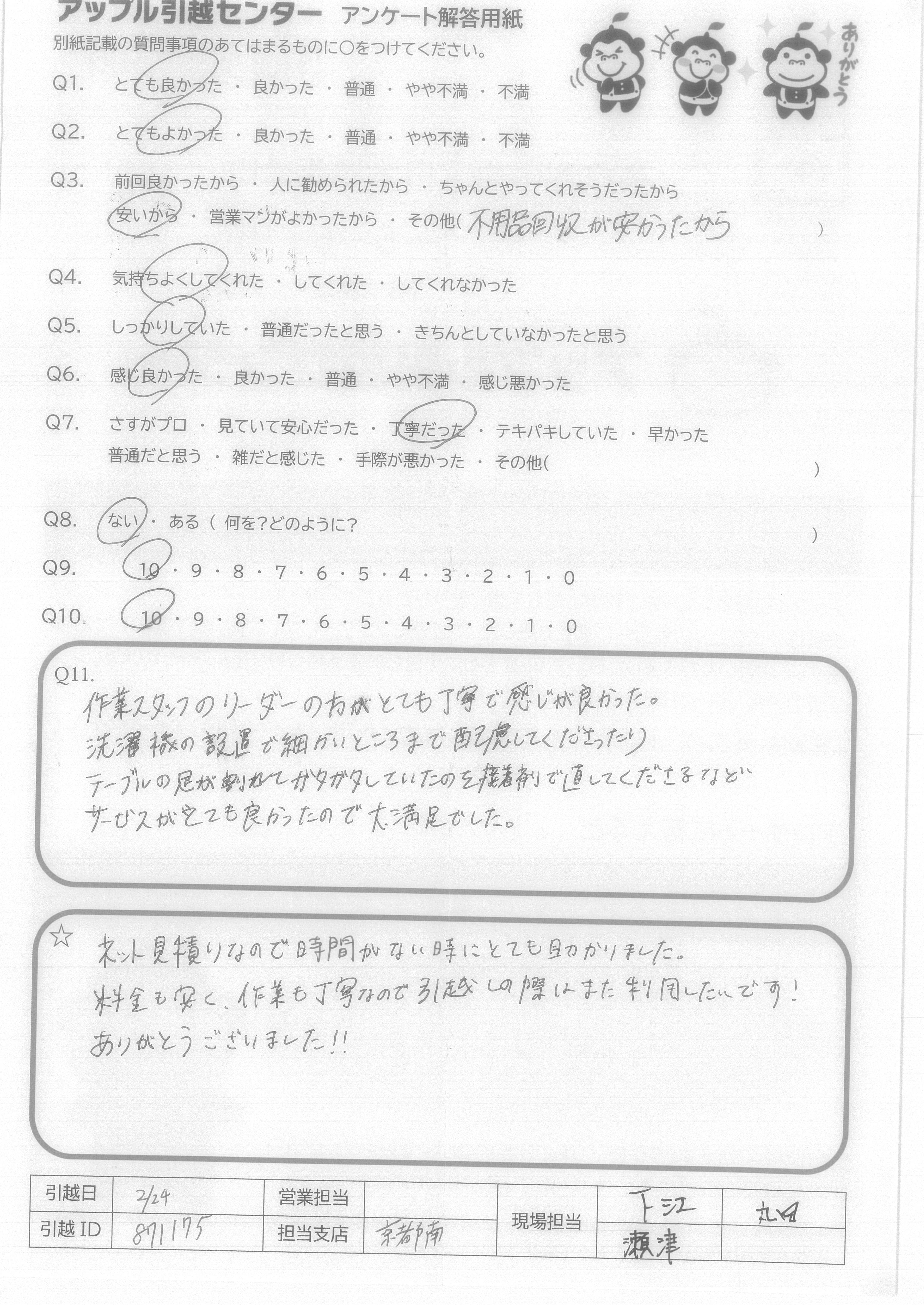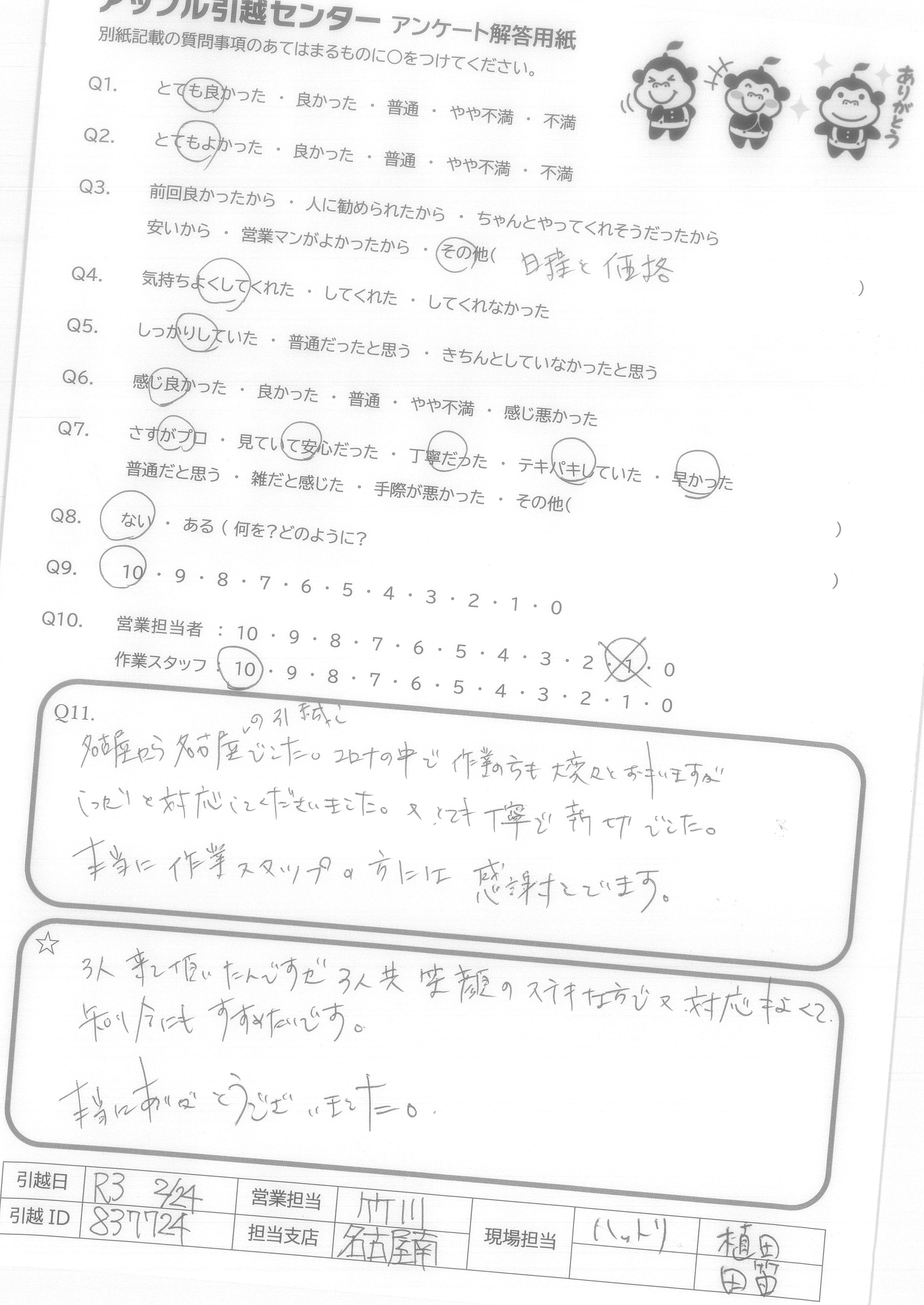 A.てきぱき素早く作業してくれたので良かったです。私が転居先の住所(番地)を間違えて申し込んでしまったが、嫌な顔1つせず対応してくれました。ありがとうございました。