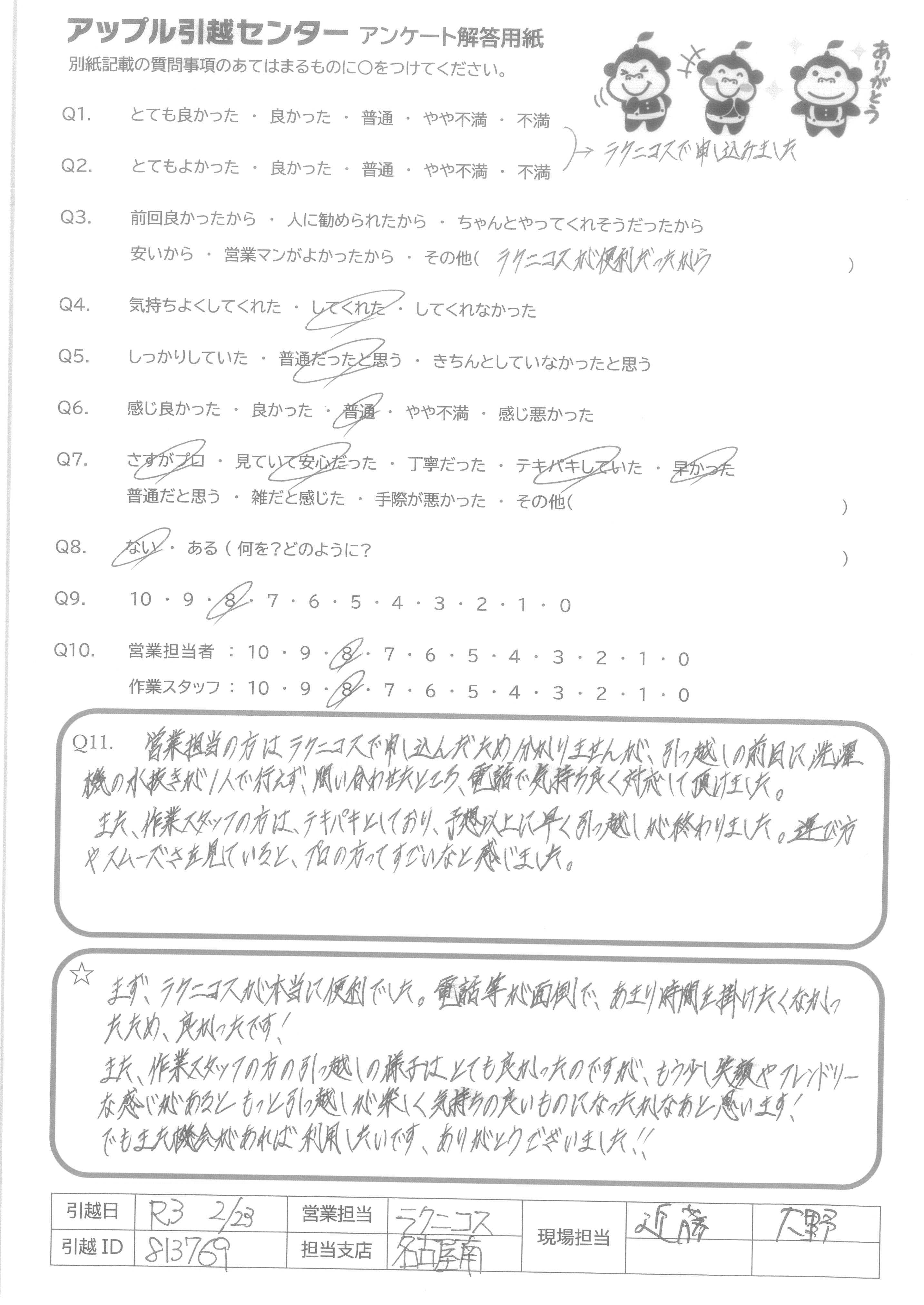 A.まず、ラクニコスが本当に便利で、あまり時間を掛けたくなかったたため、良かったです! また、作業スタッフの方の引っ越しの様子はとても良かったのですが、もう少し笑顔やフレンドリーな感じがあるともっと引っ越しが楽しく気持ちの良いものになったかなあと思います! でもまた機会があれば利用したいです、ありがとうございました!!