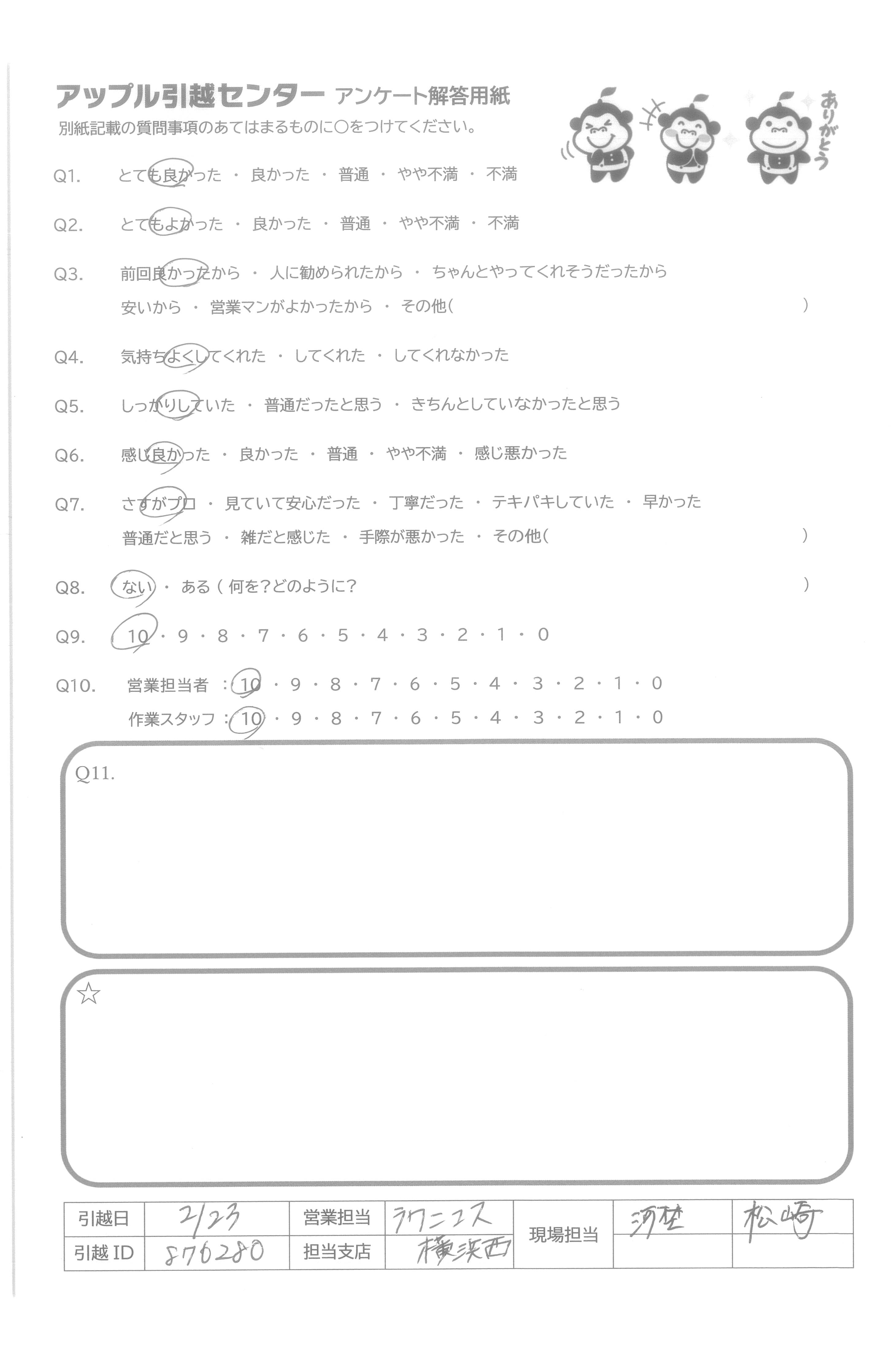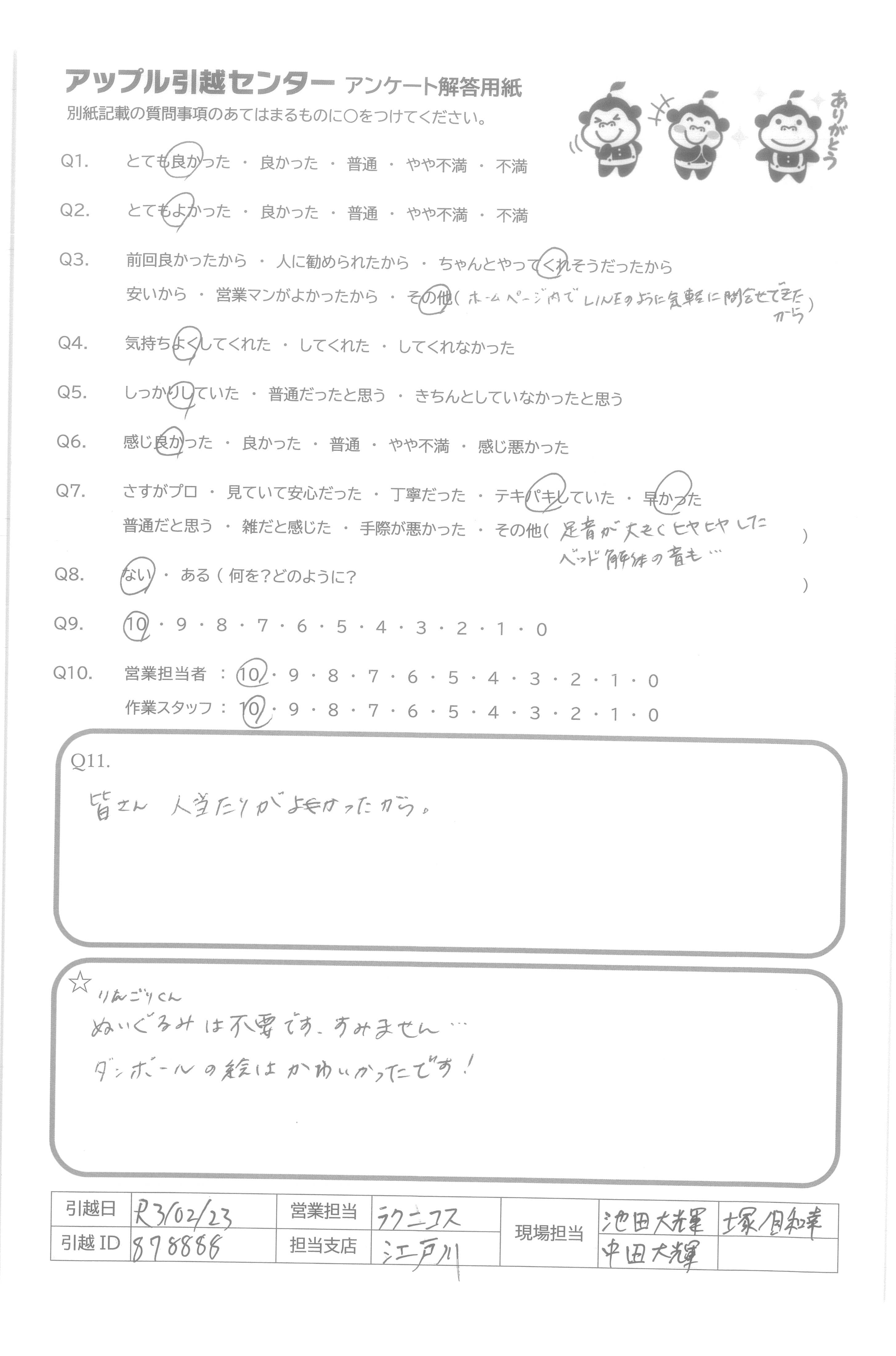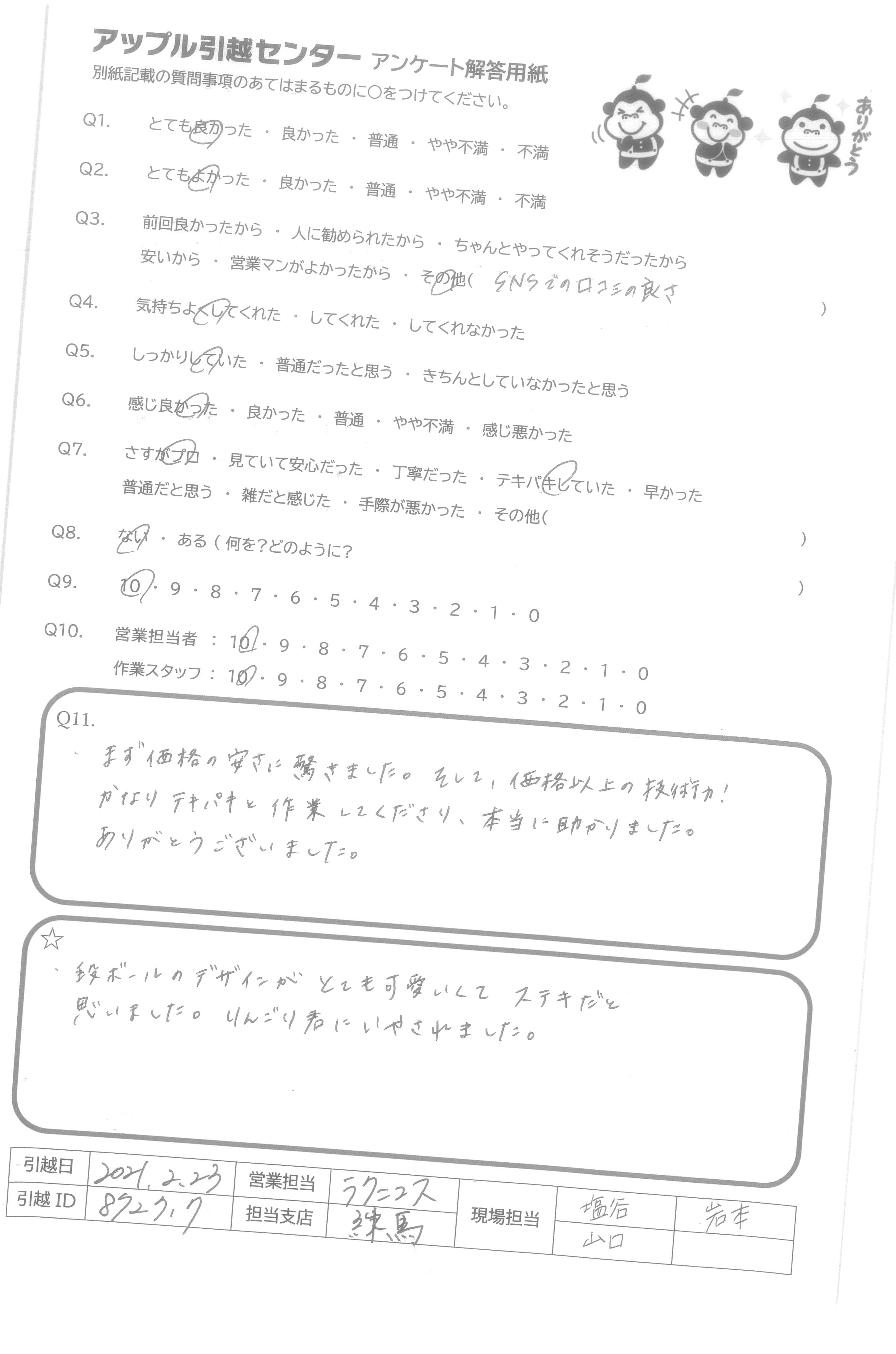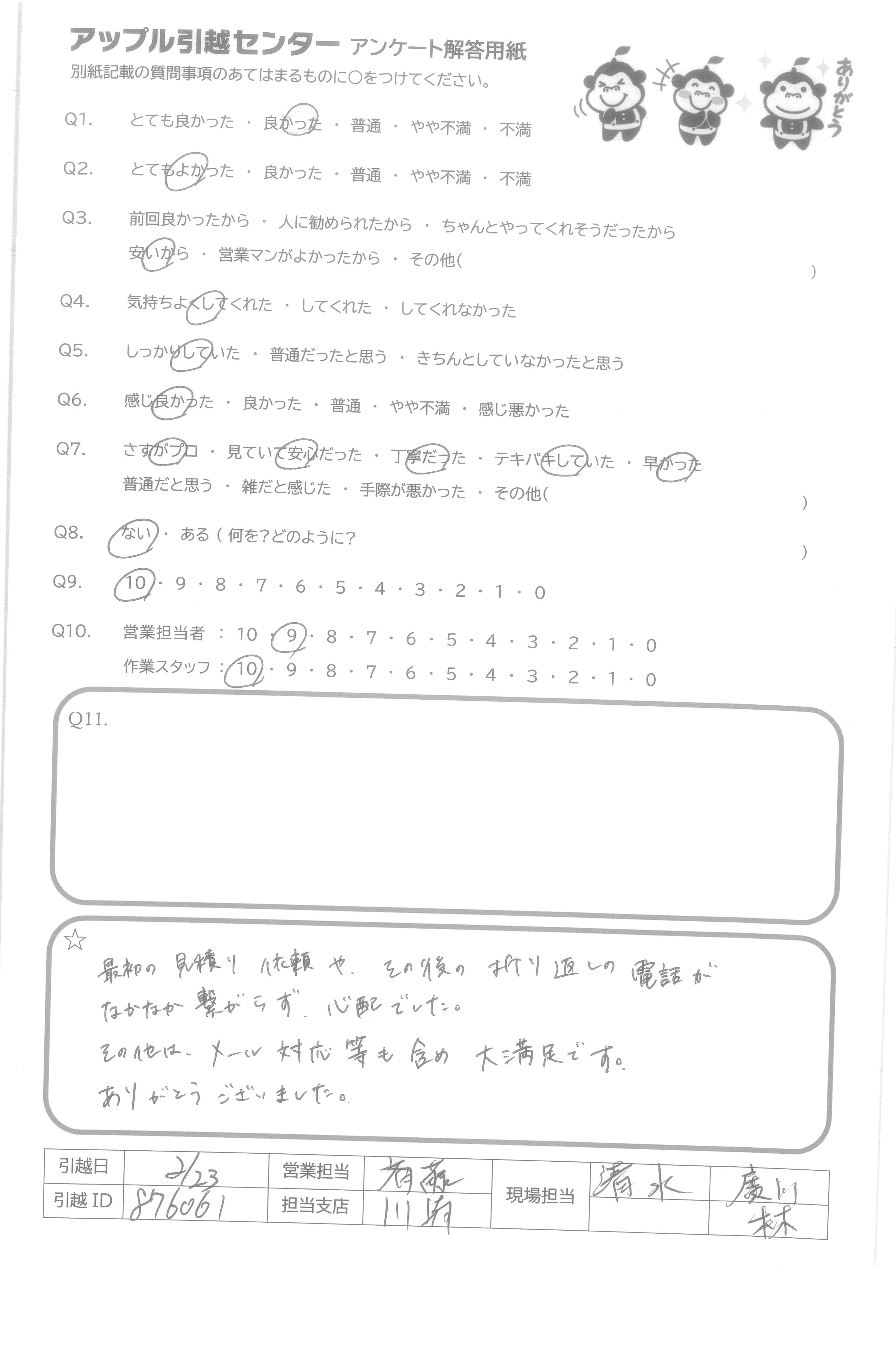 A.気持ちよく引っ越しさせていただきました。ありがとうございました。