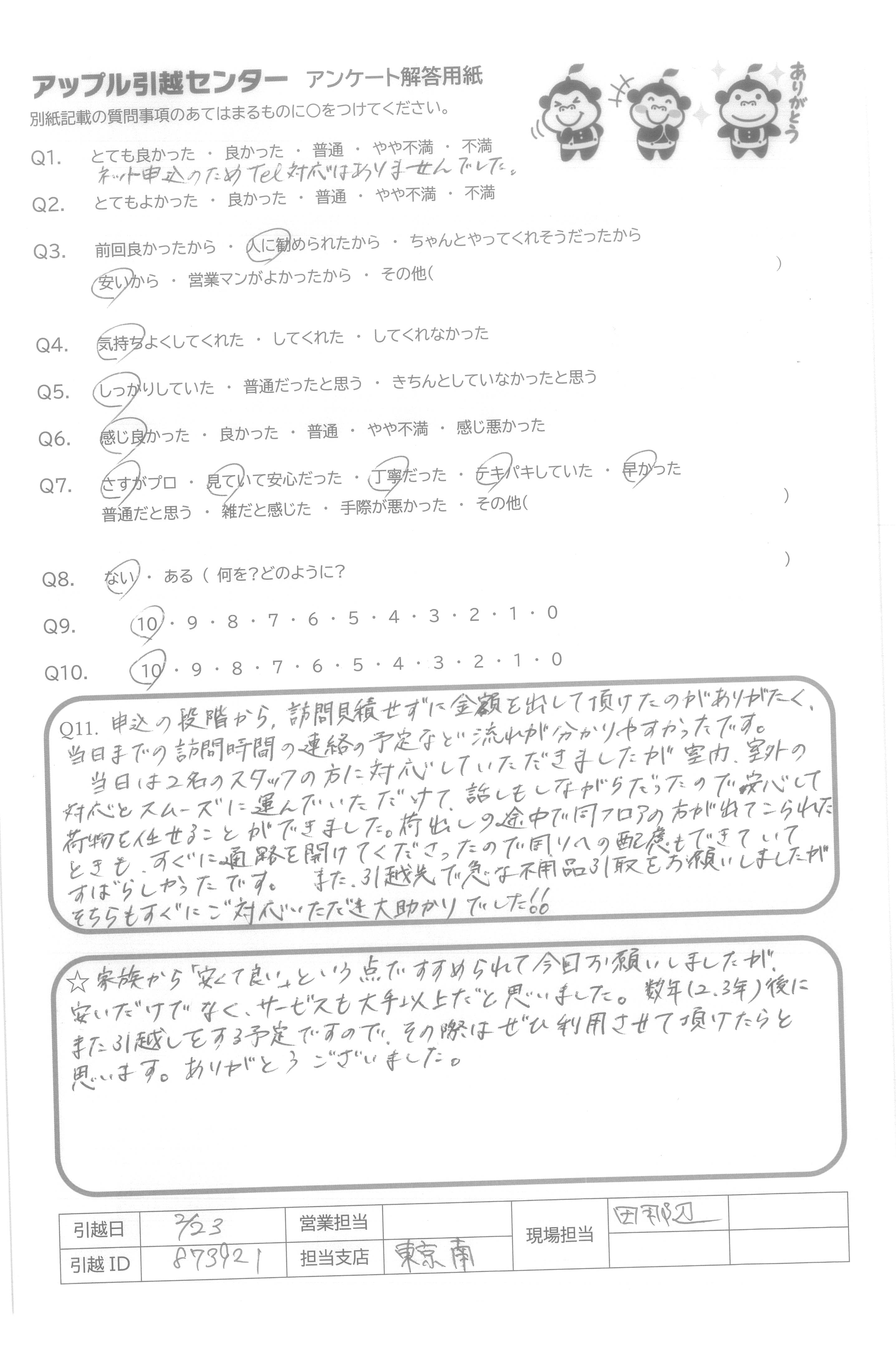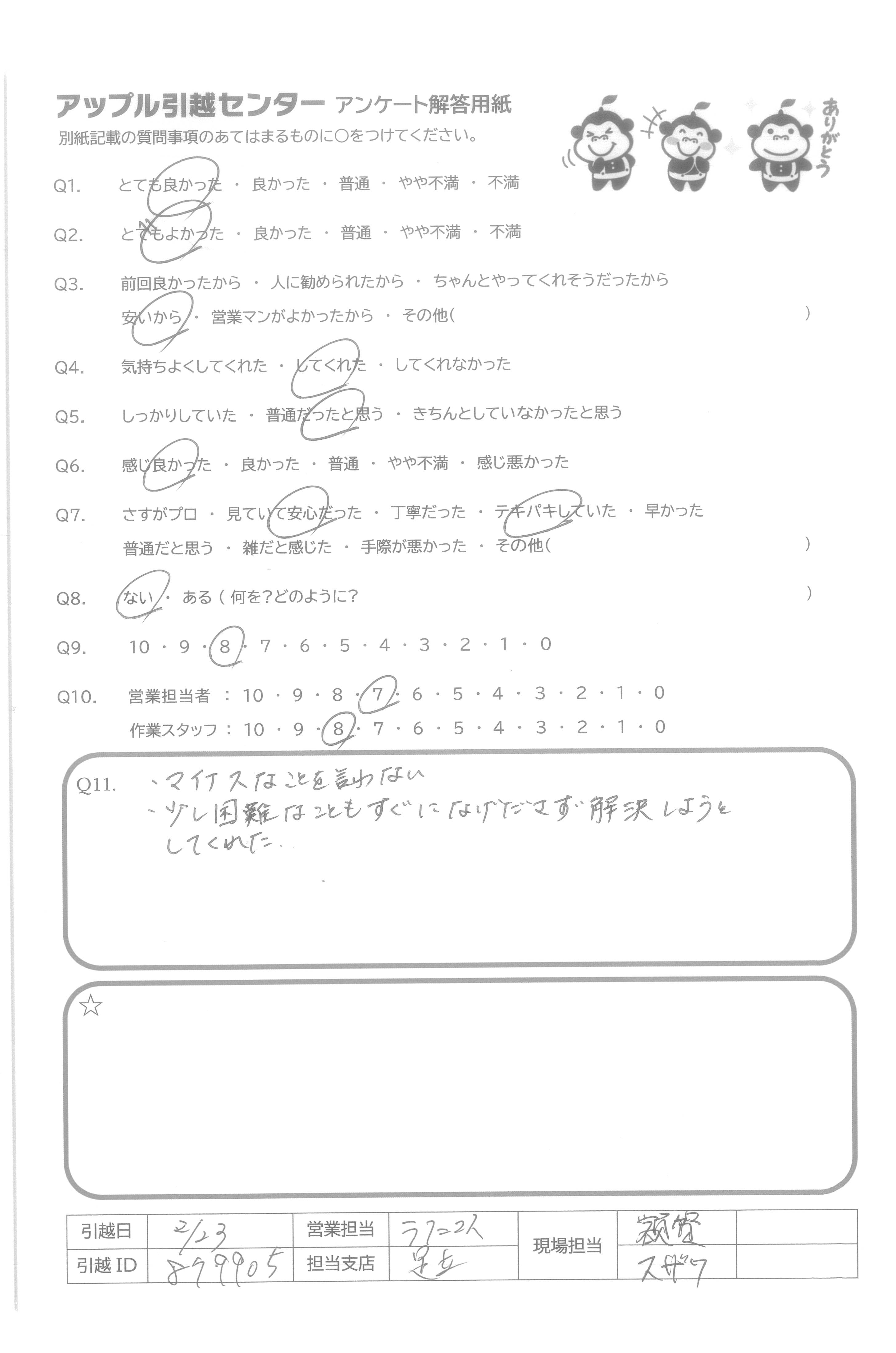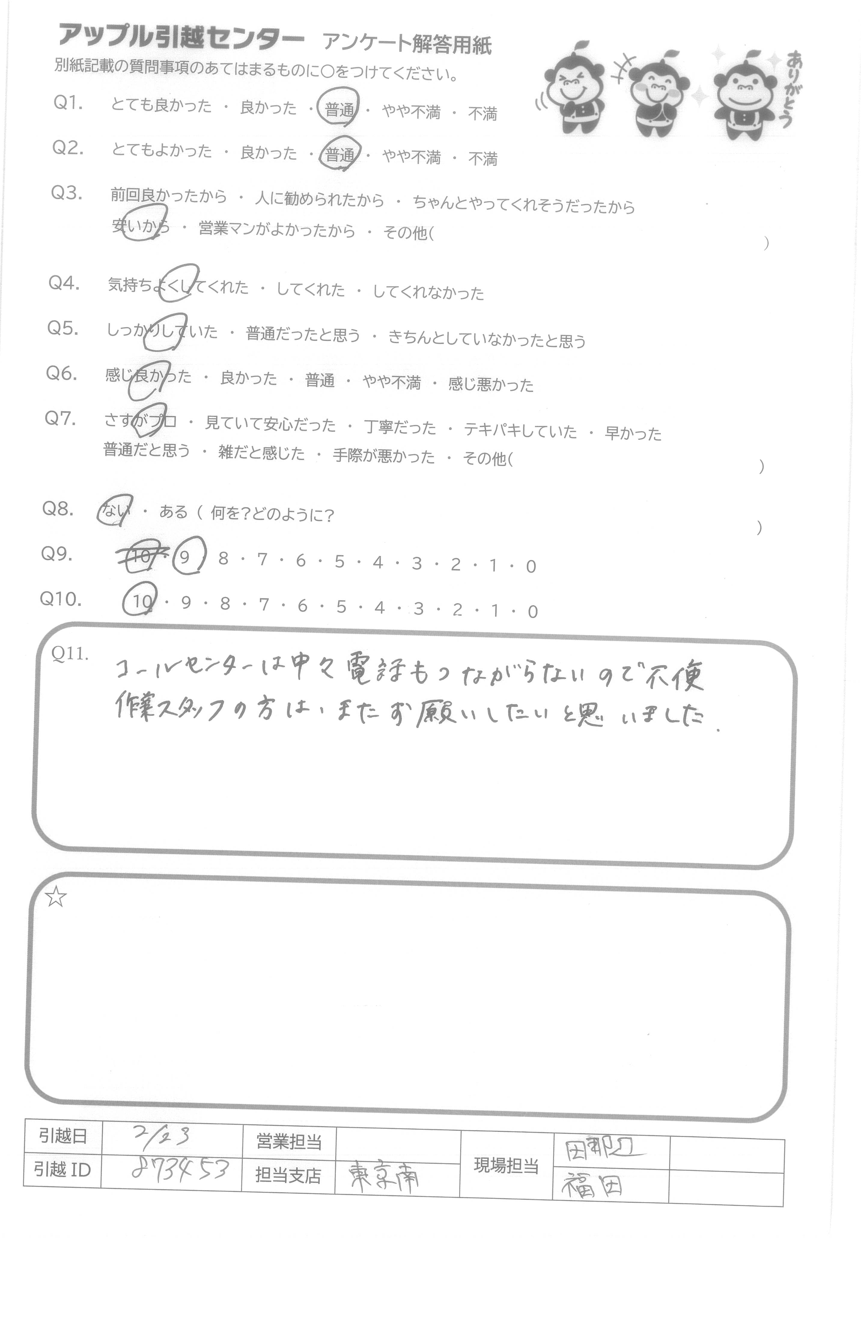 A.安い金額なのに電話も作業もとても丁寧に対応していただいて安心して引っ越しできました。 ありがとうございました。 また頼みたいです。