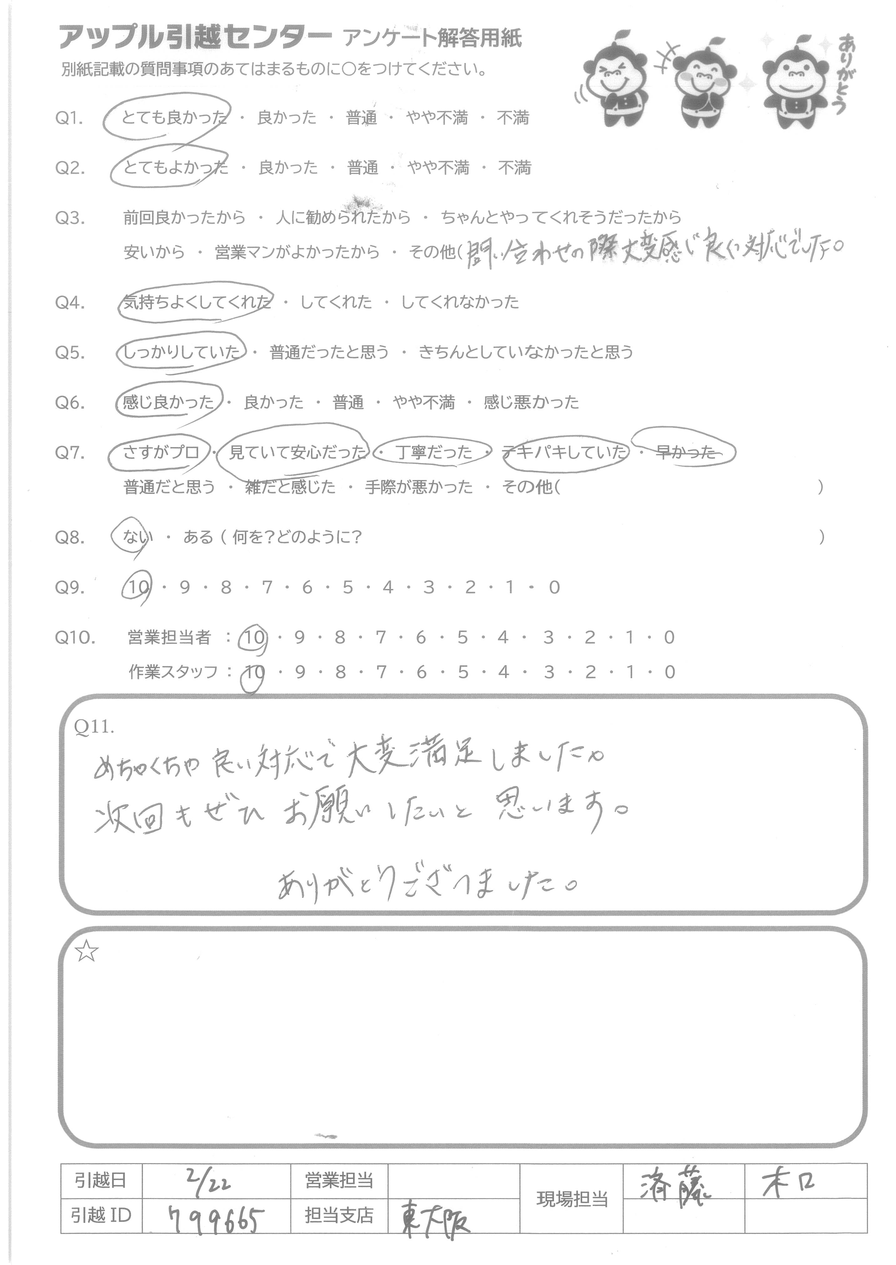 A.しばらく引っ越しする予定はないが、もしあればまたぜひお願いしたいほど。 「対応が素晴らしいですね」と言ったら会社や社長の方針のおかげとおっしゃってました。