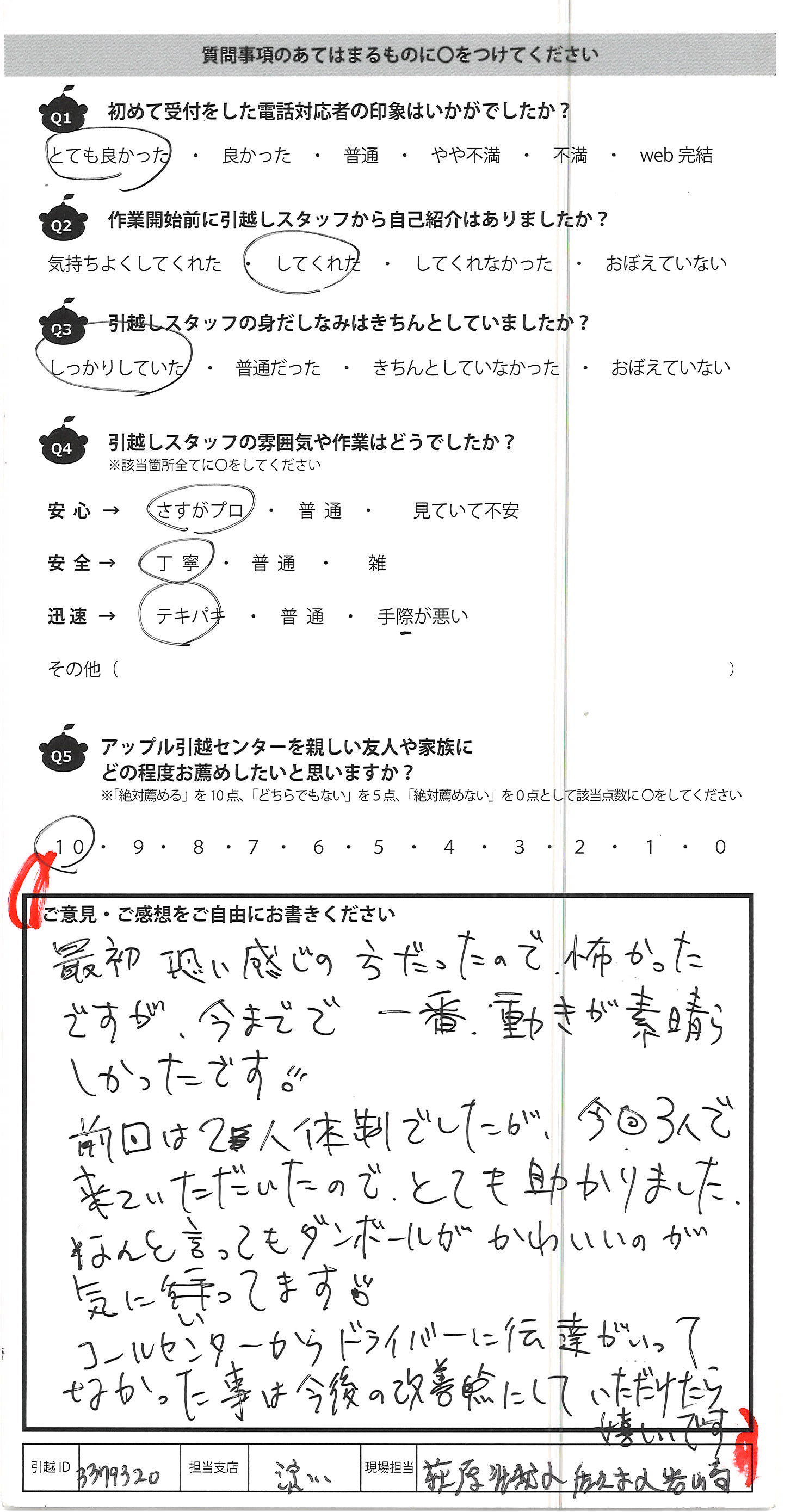 A.最初恐い感じの方だったので、怖かった ですが、今までで一番、動きが素晴ら しかったです。 前回は2人体制でしたが、今回3人で 来ていただいたので、とても助かりました。 なんと言ってもダンボールがかわいいのが 気にいってます コールセンターからドライバーに伝達がいって なかった事は今後の改善点にしていただけたら 嬉しいです