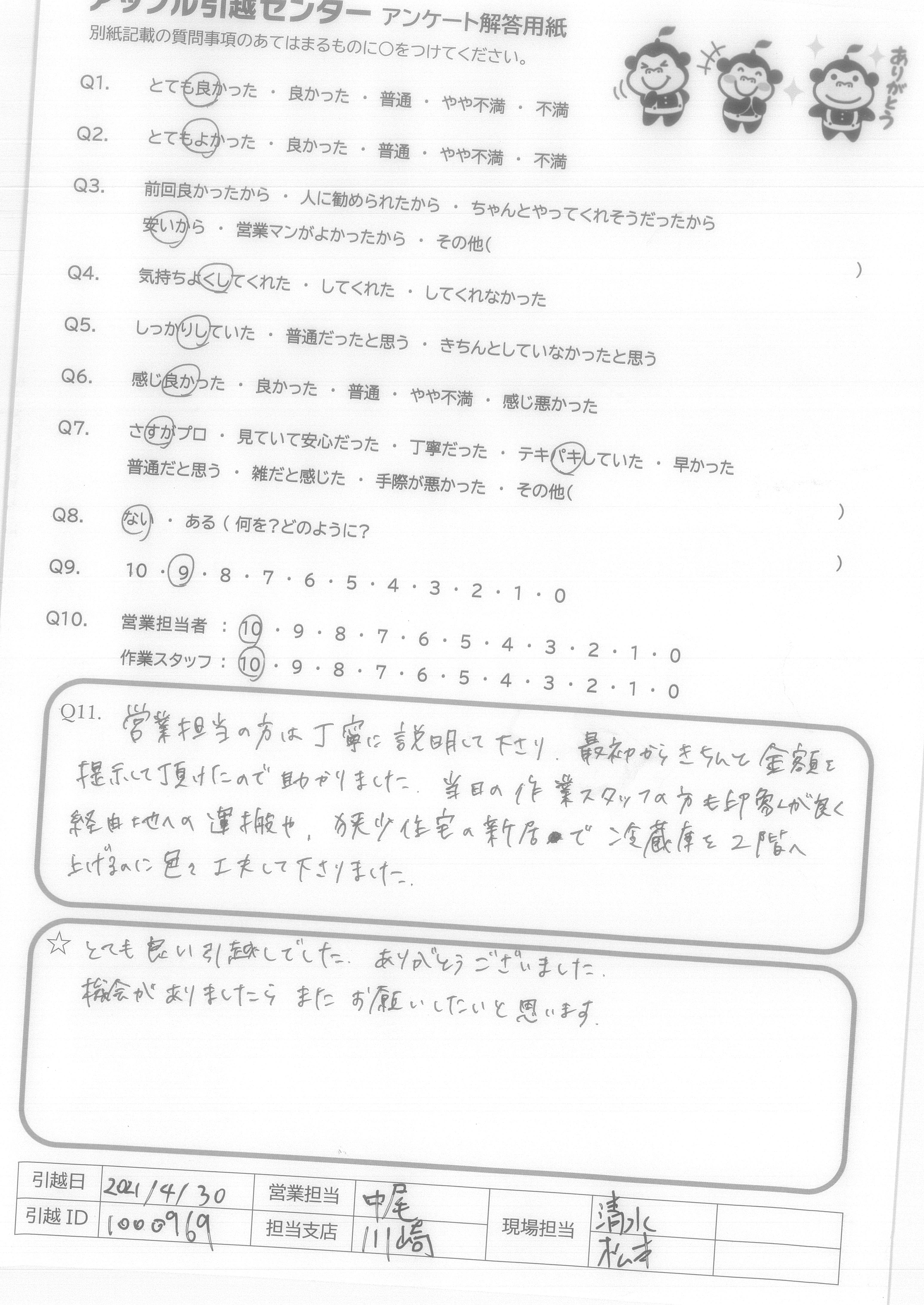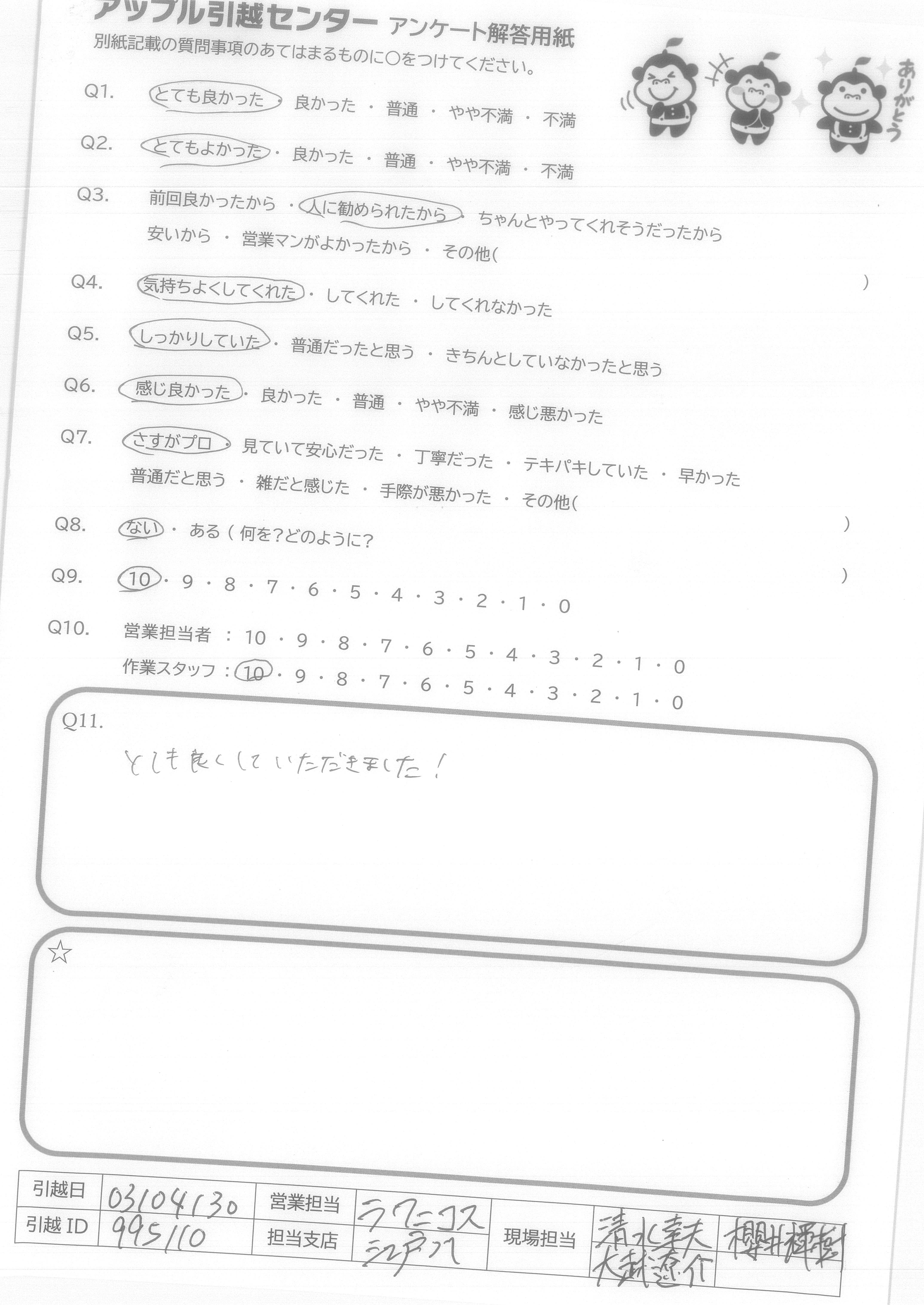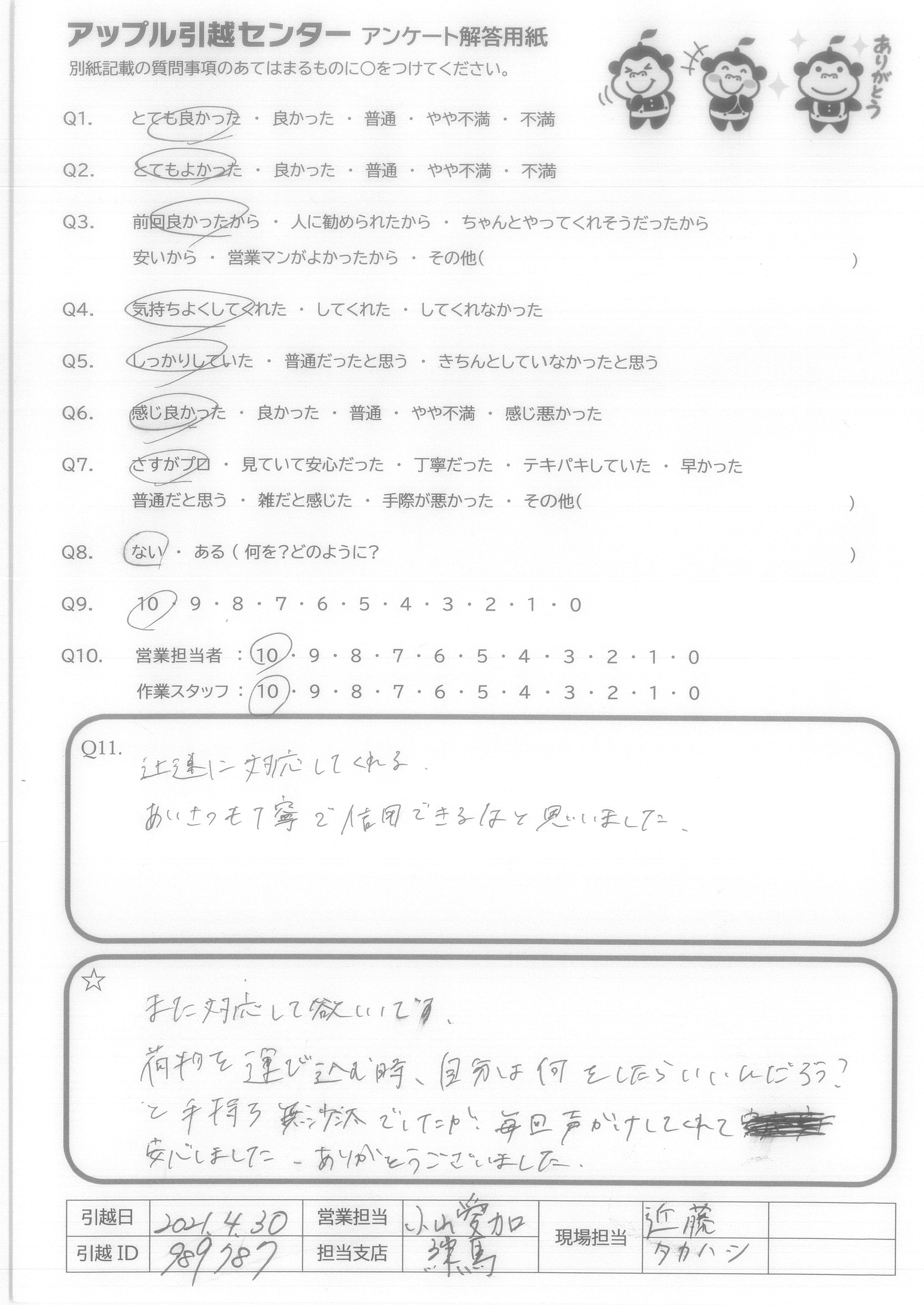 A.とても良い引越しでした。ありがとうございました。 機会がありましたらまたお願いしたいと思います。