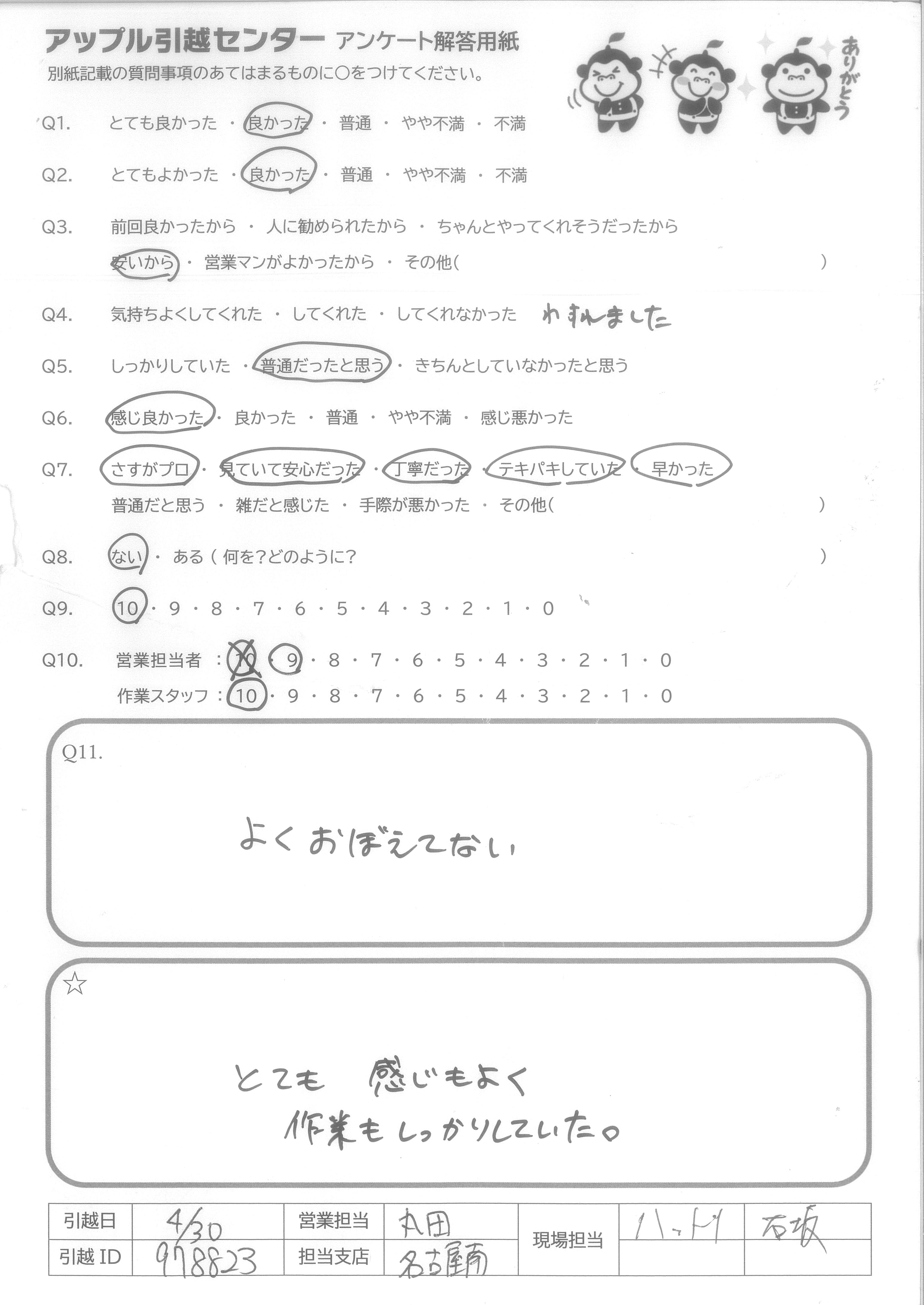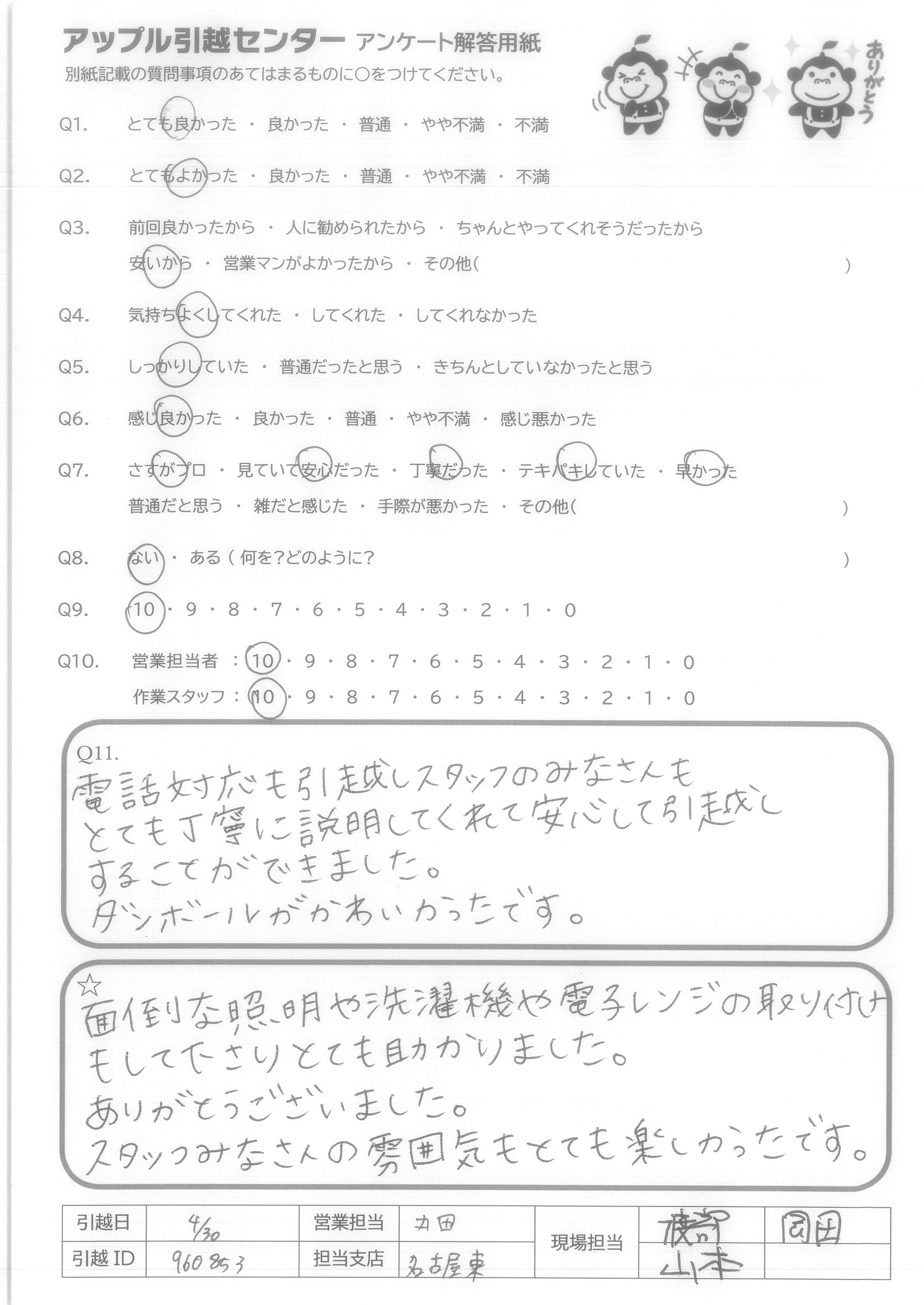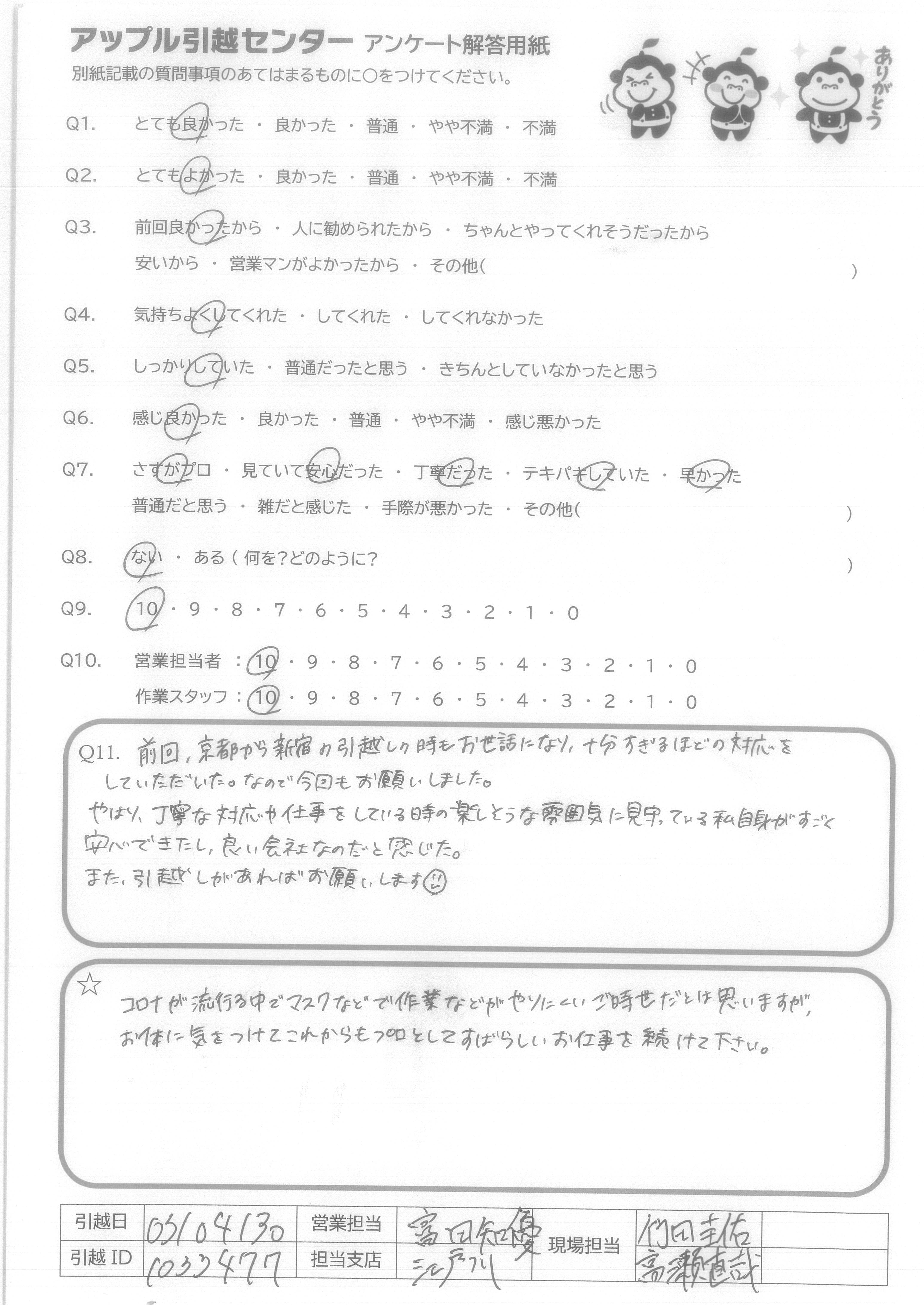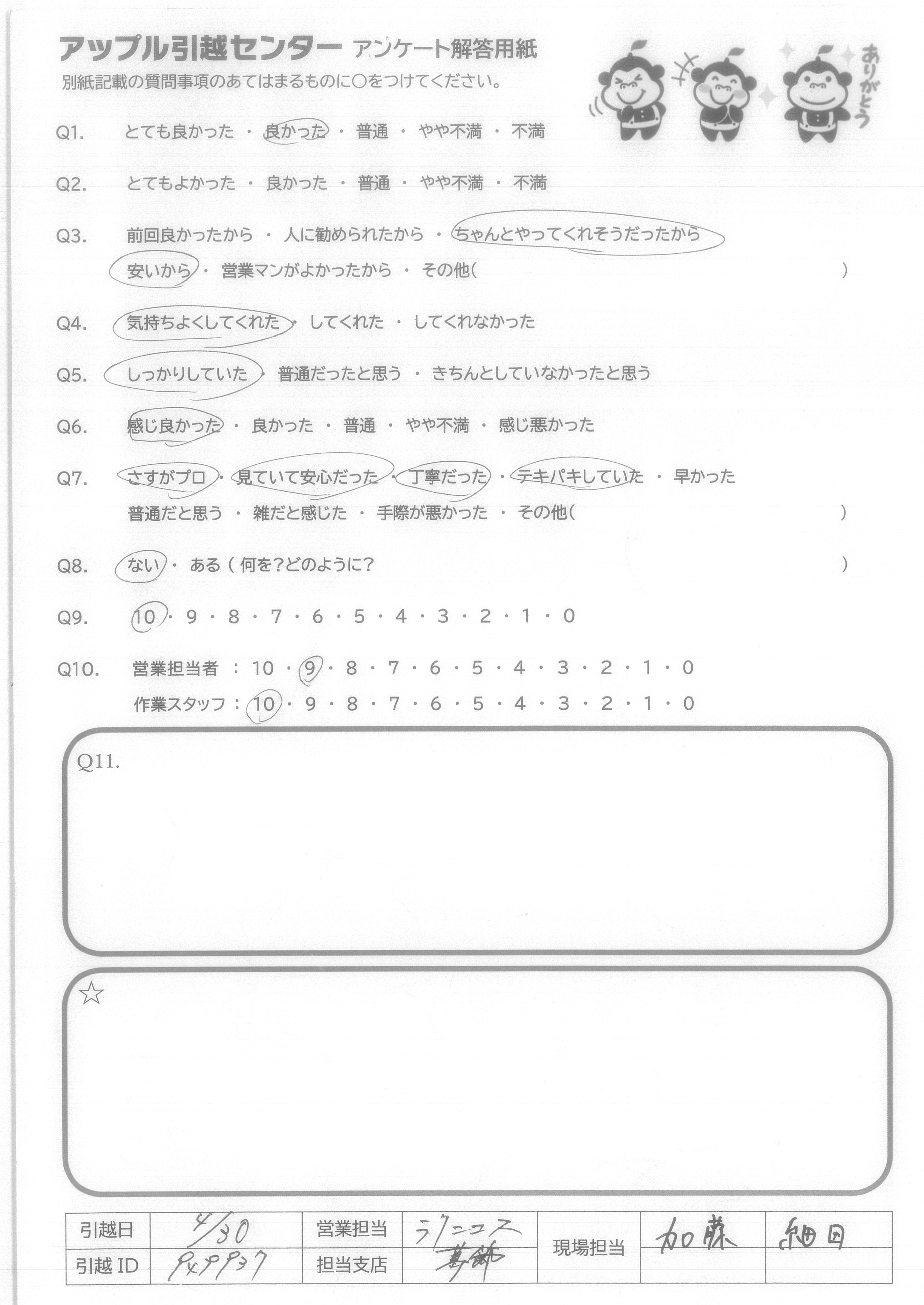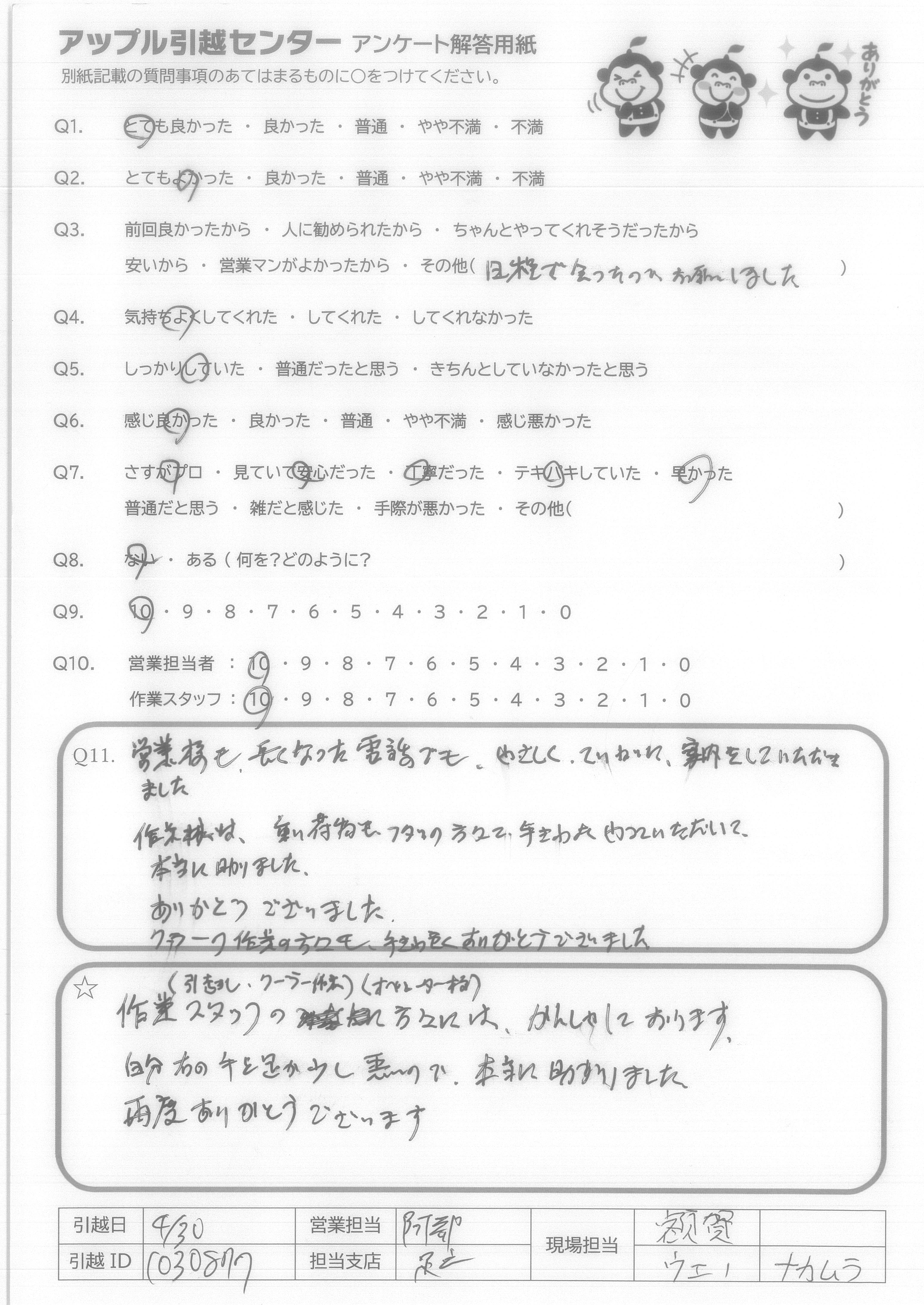 A.今月の4/18に長女、4/20に次女の引越しをアップルさんにお願いして、ホントに大満足でしたので、今回私の引越しも、少しの不安もなくすべておまかせ出来ました。「アップルさんにお願いして、本当によかった!」と娘達と話しております。 P.S 赤岩さん。いろいろお世話になりました。ありがとうございました。