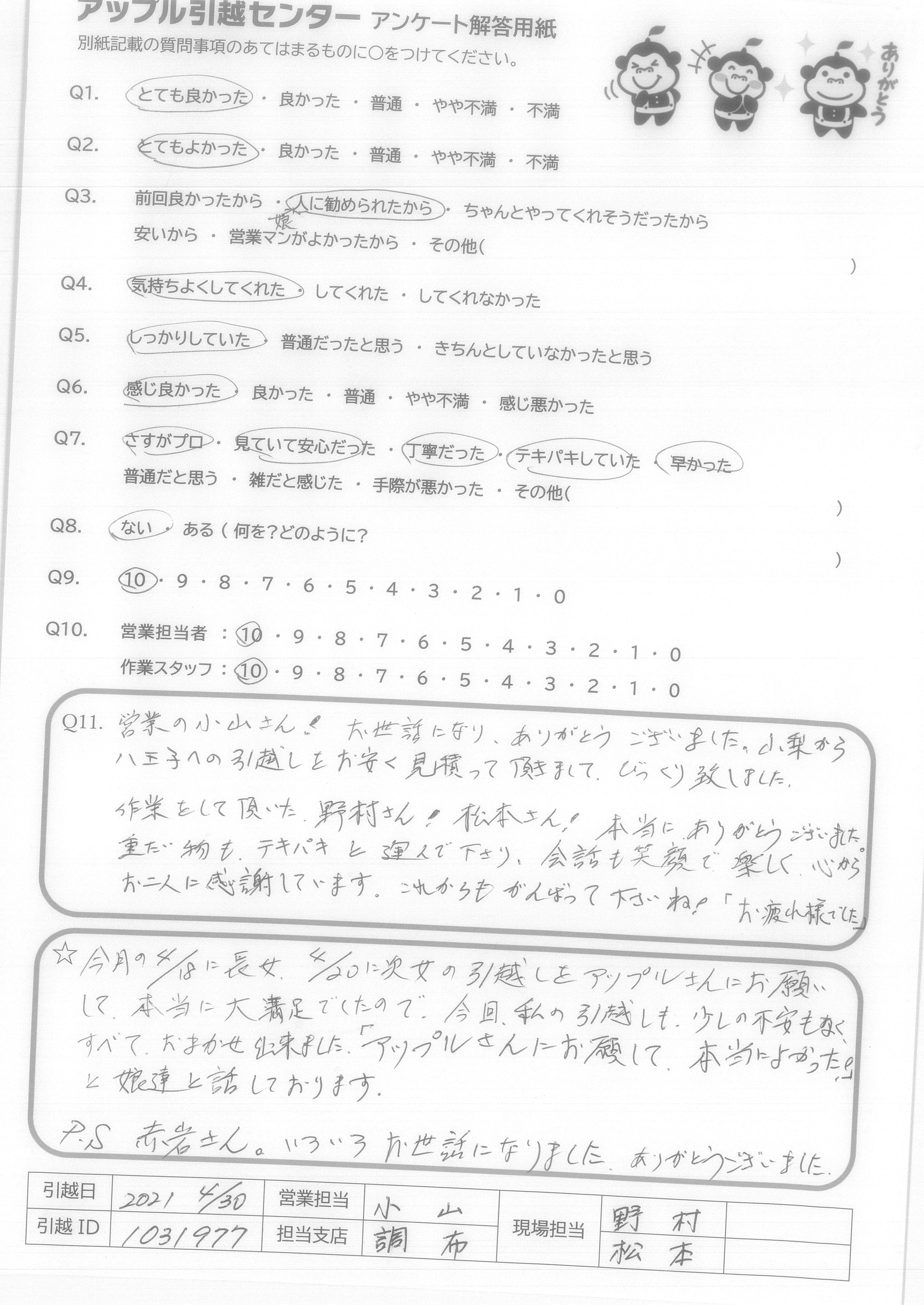 A.営業の小山さん!お世話になり、ありがとうございました。山梨から八王子への引越しをお安く見積って頂きまして、びっくり致しました。 作業をして頂いた野村さん!松本さん!本当にありがとうございました。重たい物もテキパキと運んで下さり、会話も笑顔で楽しく心からお二人に感謝しています。これからもがんばって下さいね!「お疲れ様でした」
