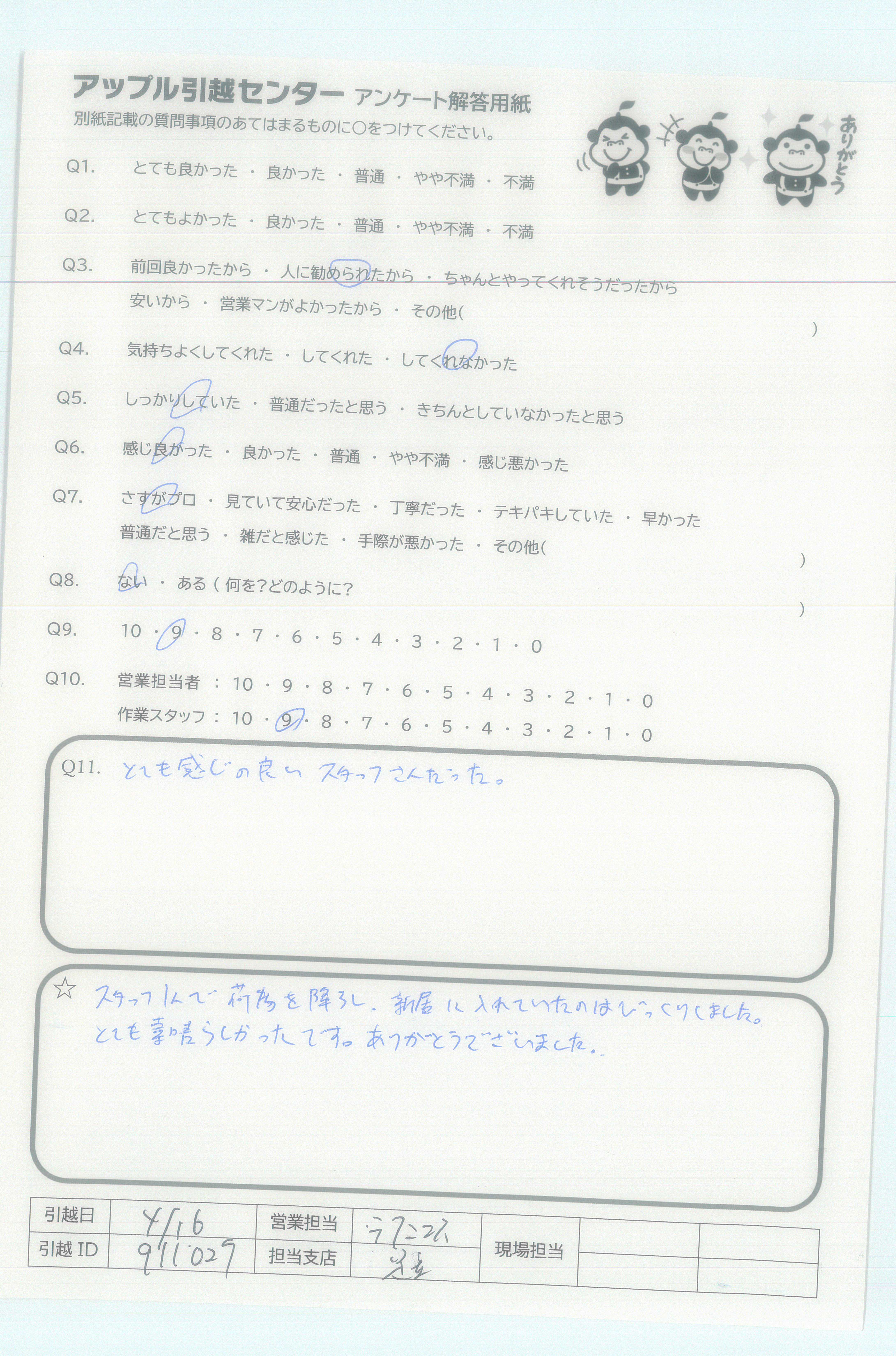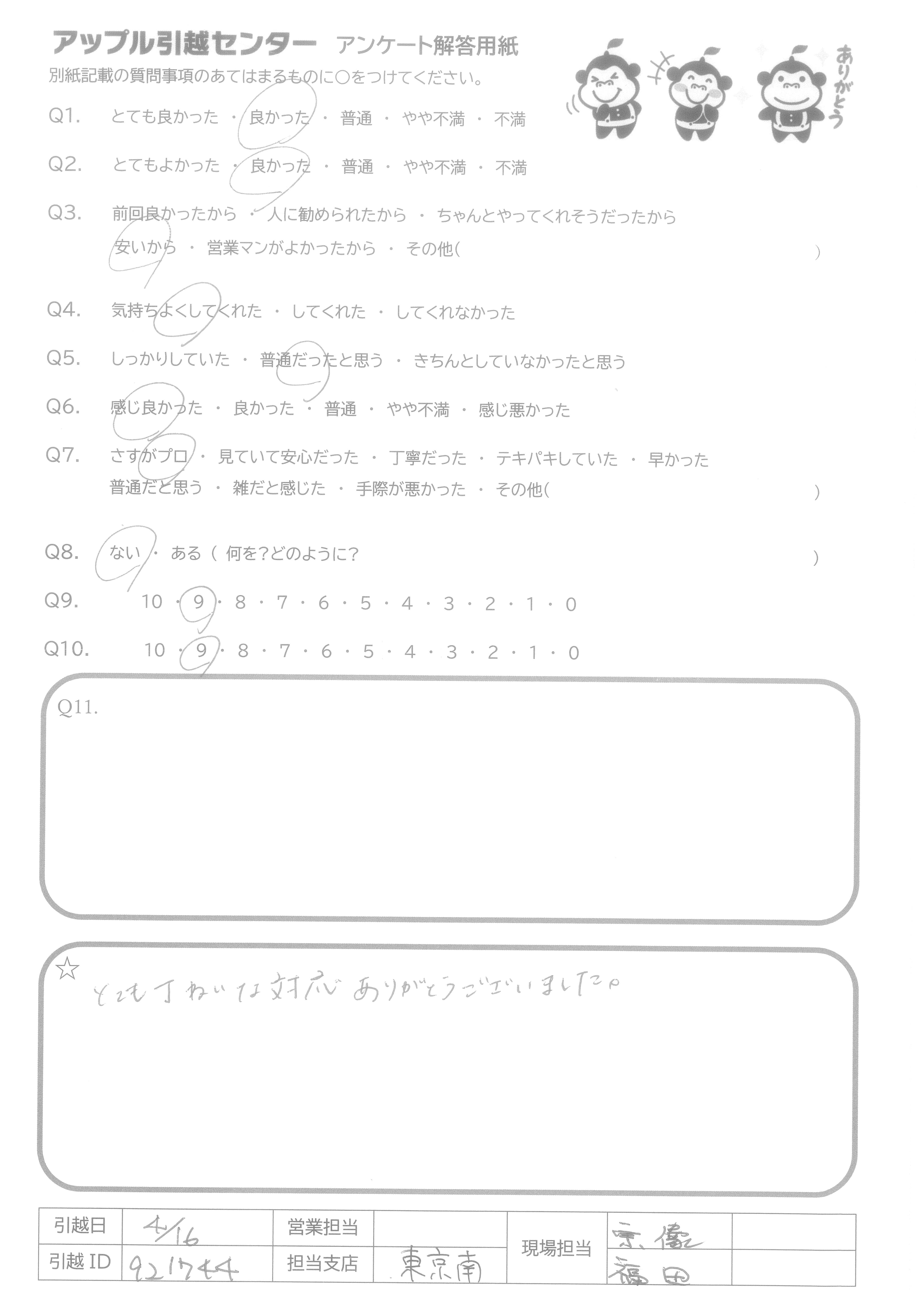 A.とても丁寧にご対応いただき感謝です!! 他社と比較しても価格の安さが別格で大丈夫なのかな?と思いましたが当日のスタッフの方々のきめ細かいお心遣いの数々に安心してお任せすることができました。また、こちらのわがままな意見(家具を戻して欲しいと・・・)にも心よくご対応さらには再度もってきていただく等驚くほどご丁寧です!本当にありがとうございました。