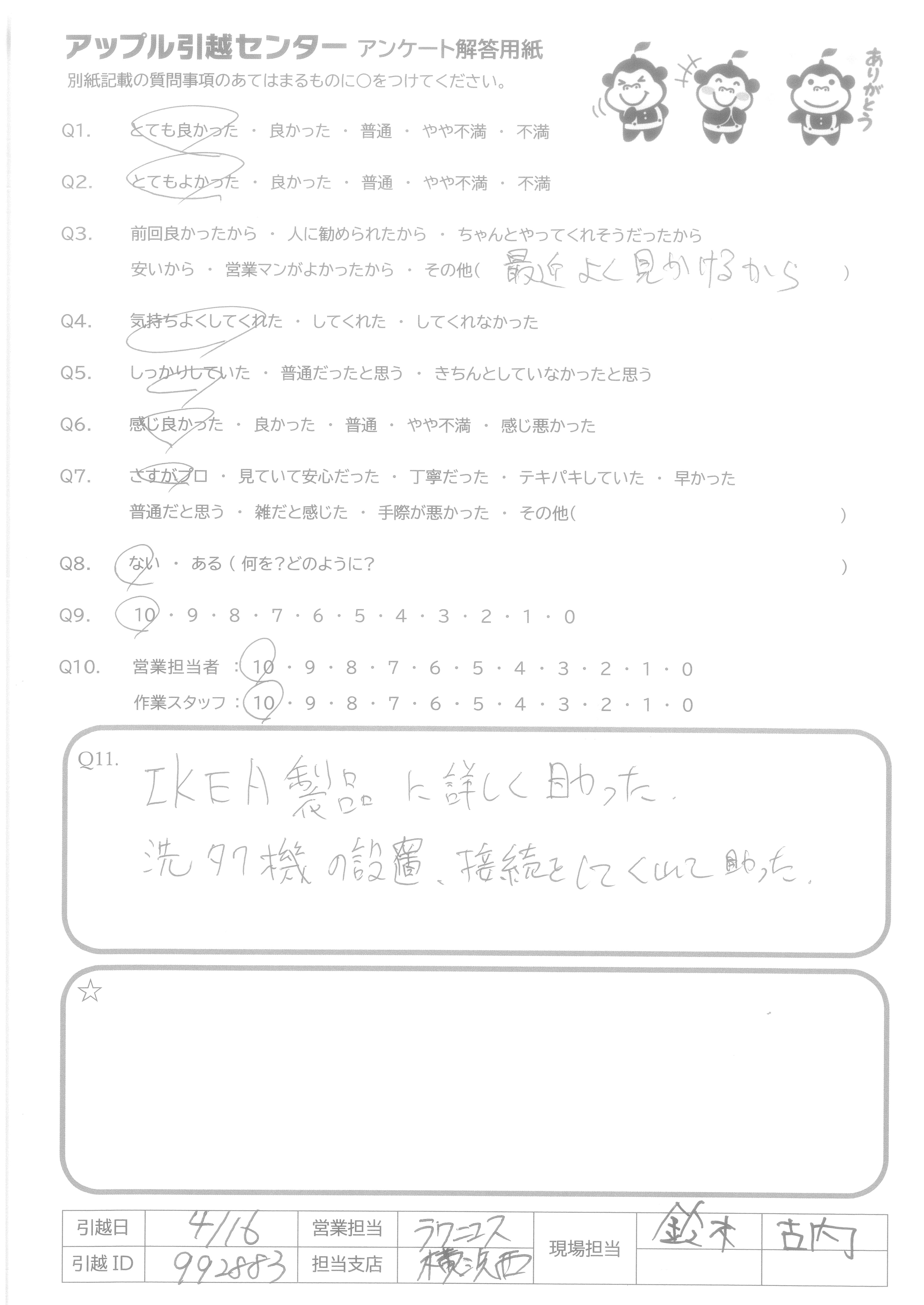 A.IKEA製品に詳しく助かった 洗タク機の設置、接続をしてくれて助った。