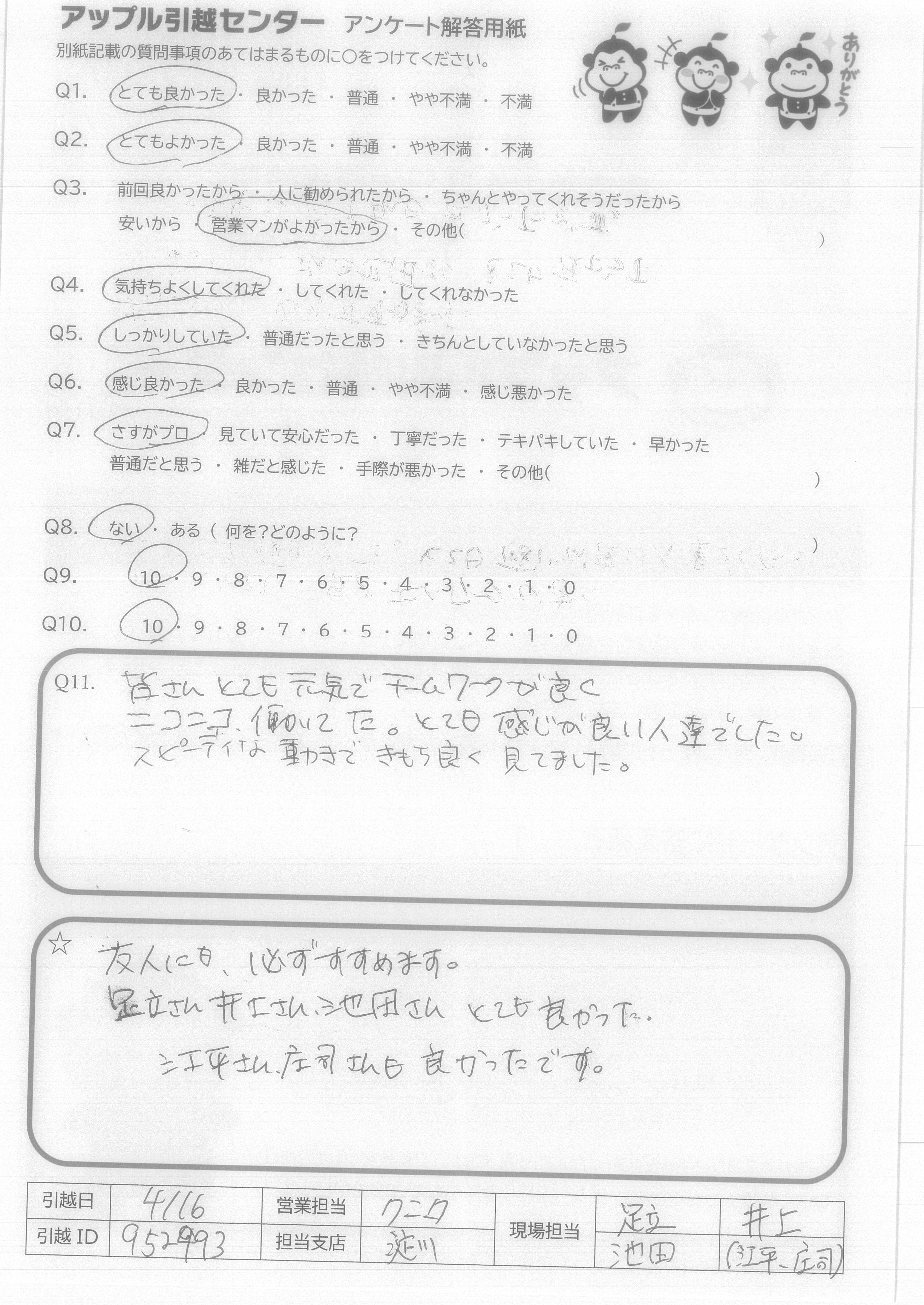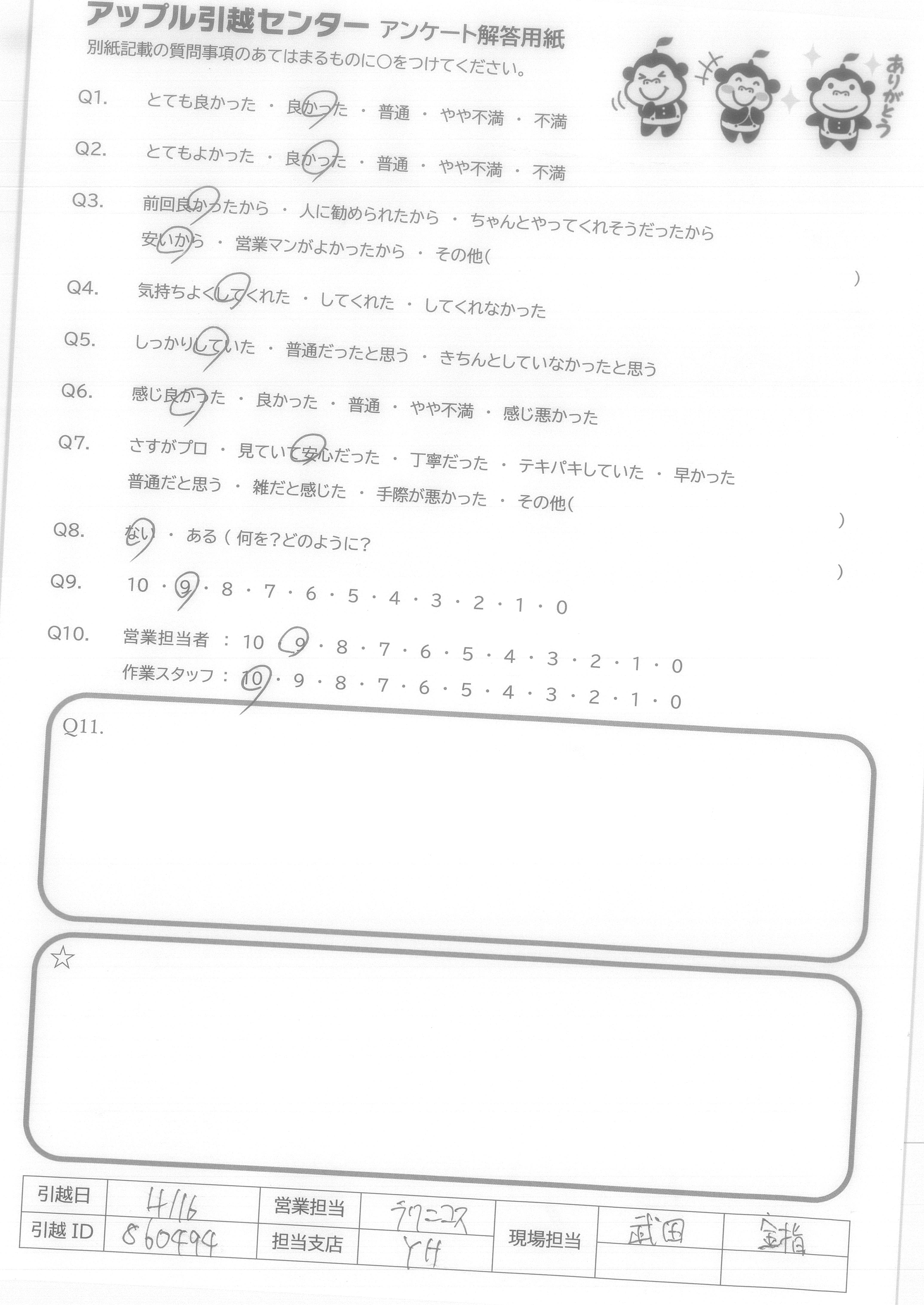 A.アップルさんに頼んで本当に良かったです。 次回の引っ越しも頼みたいです! ありがとうございました。