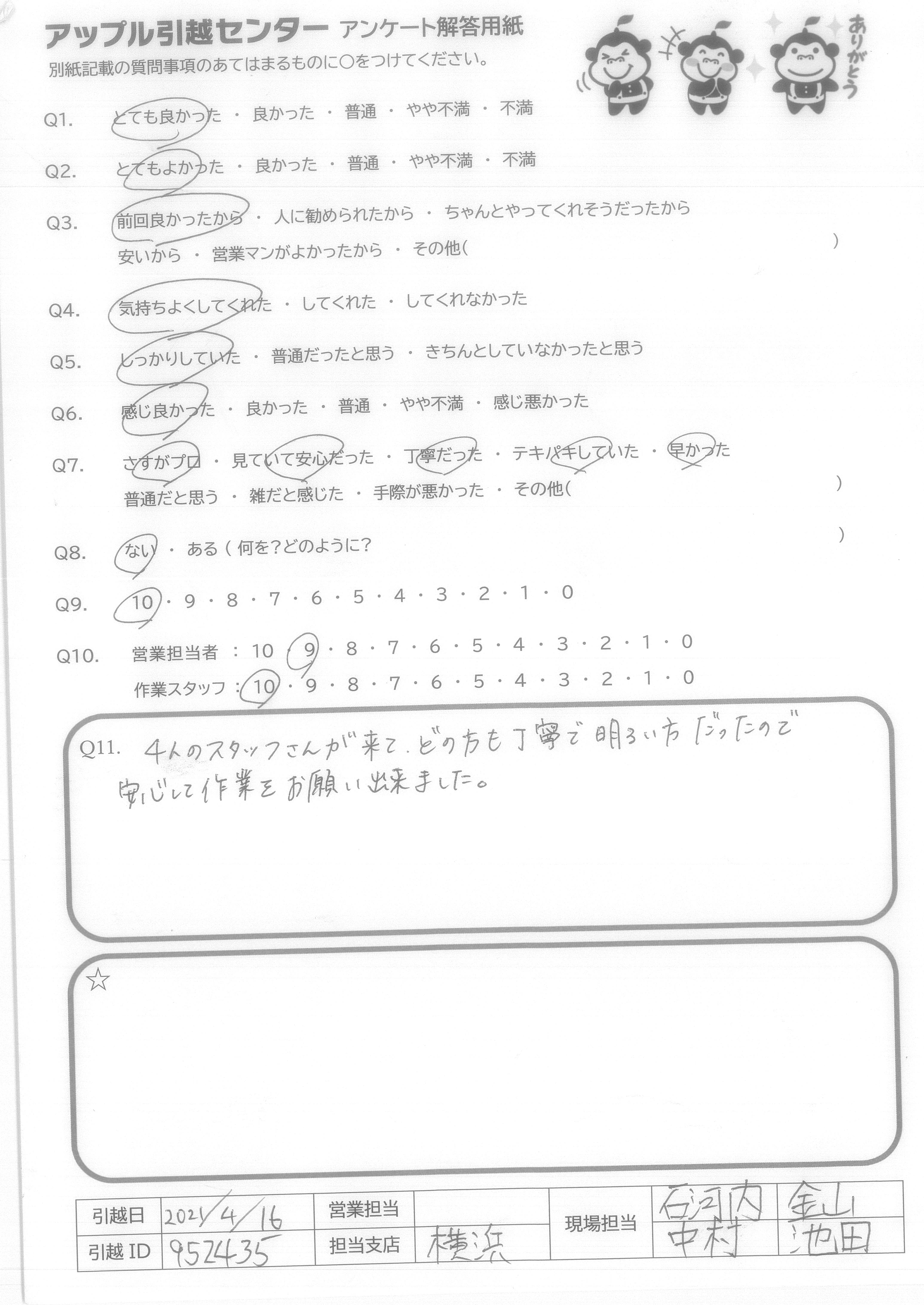 引越し日:2021年04月16日 エリア:神奈川県横浜市青葉区