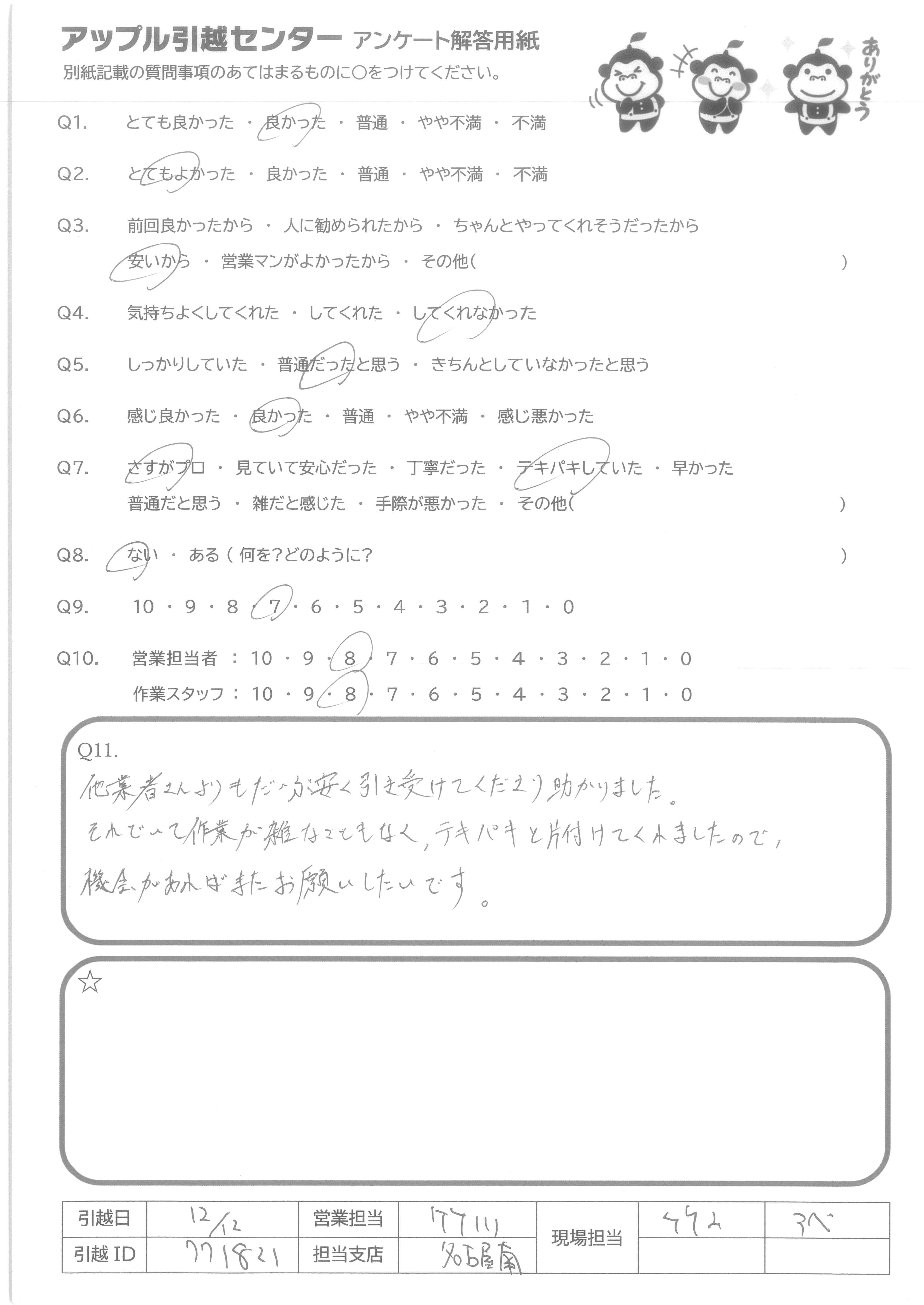 A.今回アップル引越センターを利用させていただいて、本当に良かったと思いました。 見積もりに来ていただいた営業担当者の方も現場スタッフの方もとても丁寧でハキハキしていて素晴らしい接客だと思います。スタッフの方も作業をしながら何かお困りはないですか、お手伝いすることはないですか?と気遣ってくれてありがたかったです。