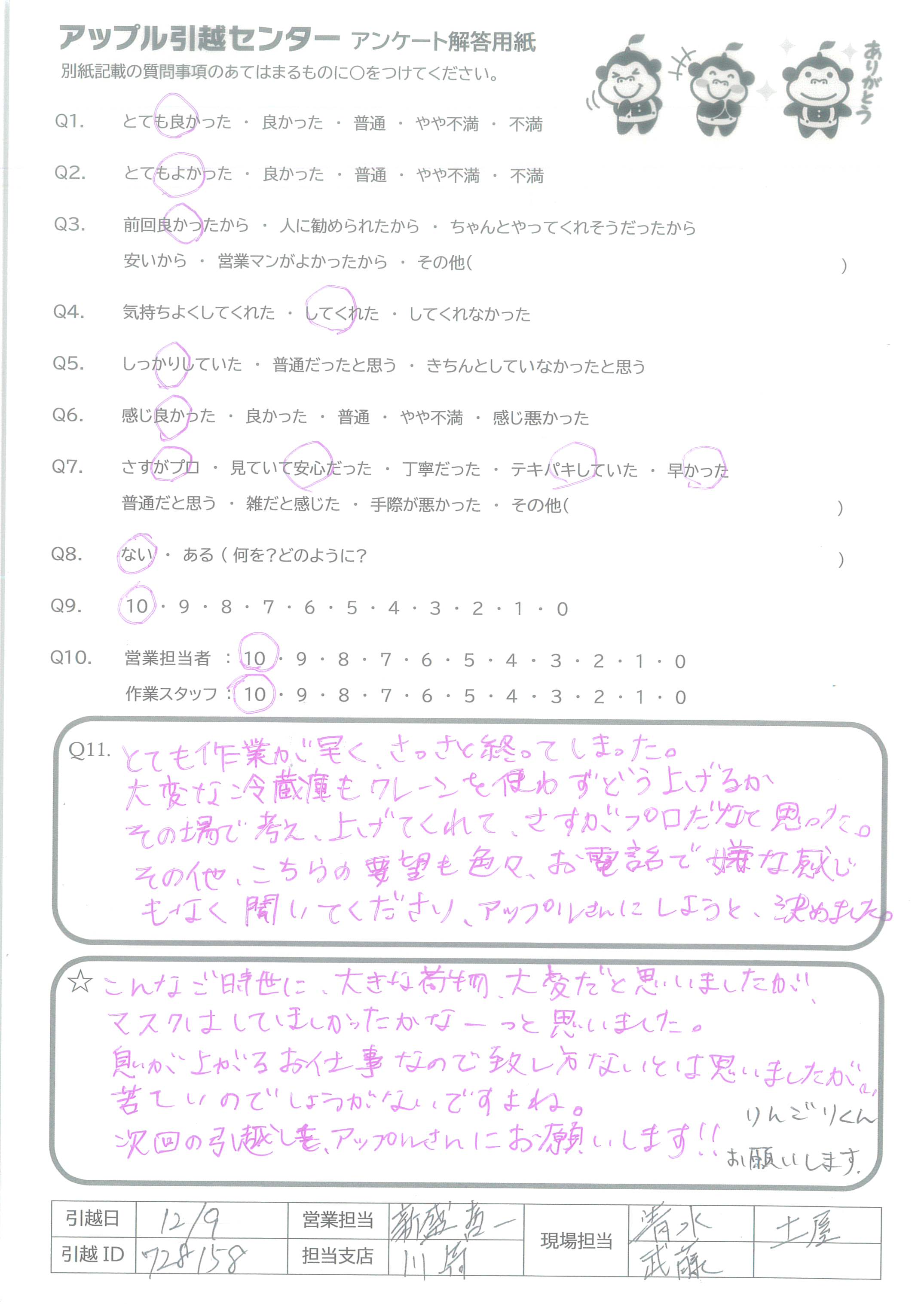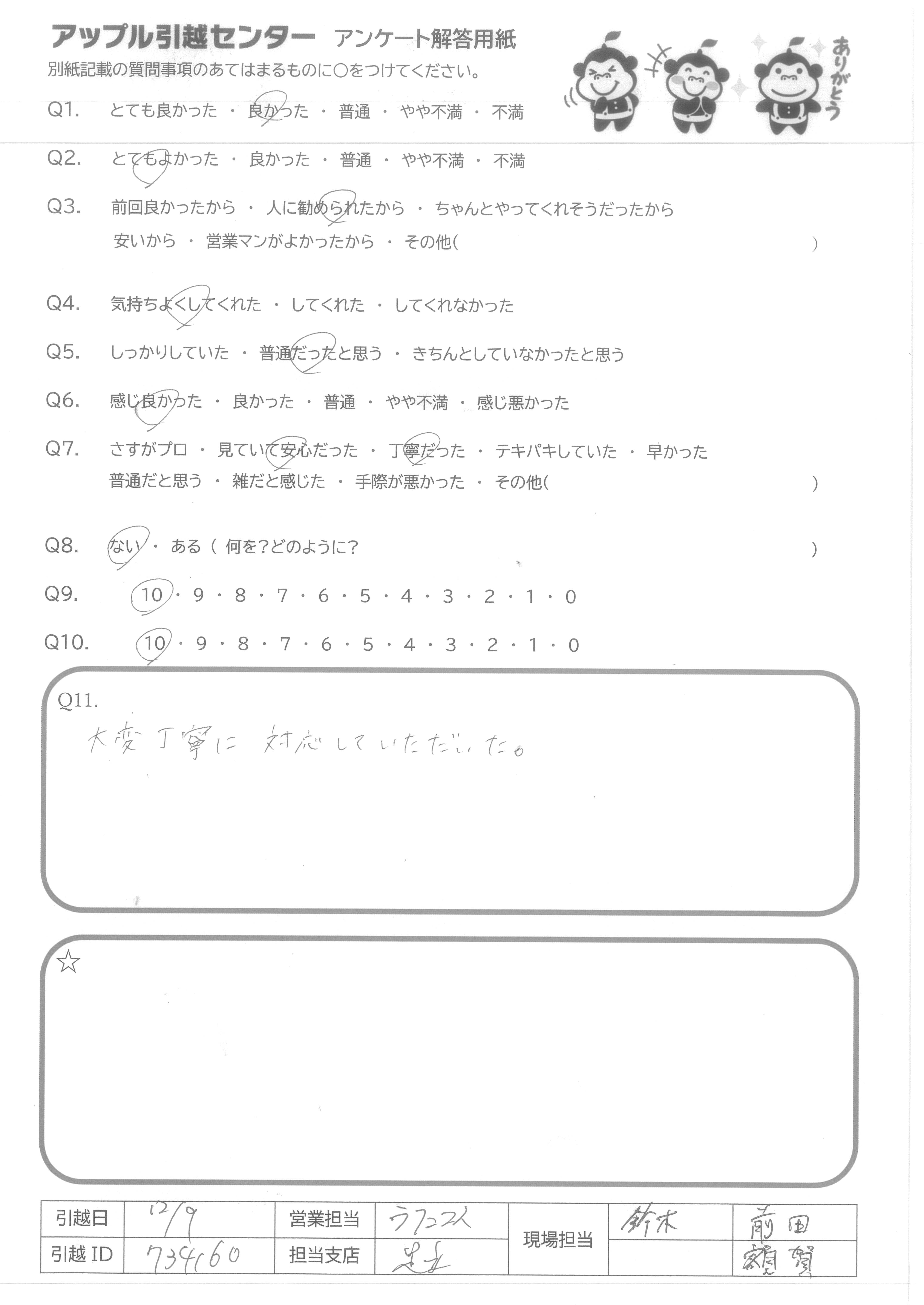 A.引越し早くてわがままにも丁寧に対応してもらって満足です。ありがとうございました。